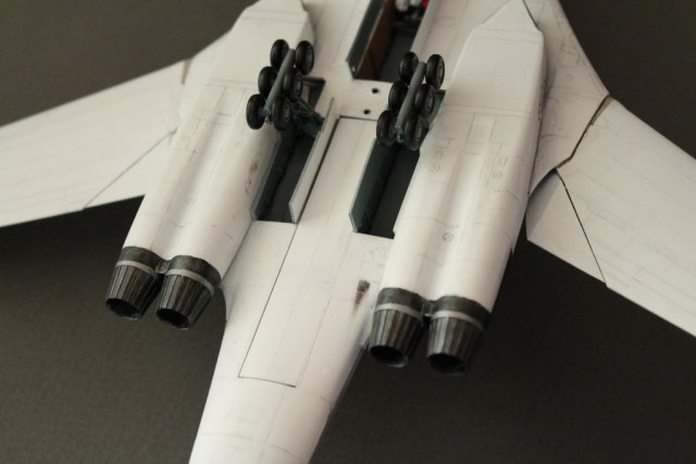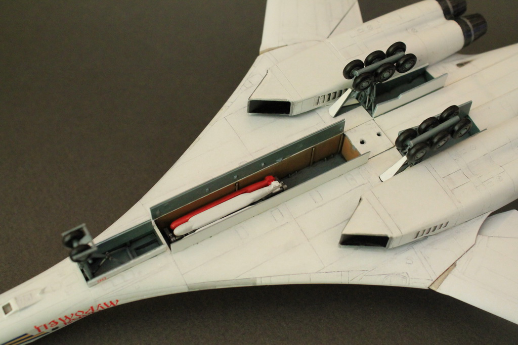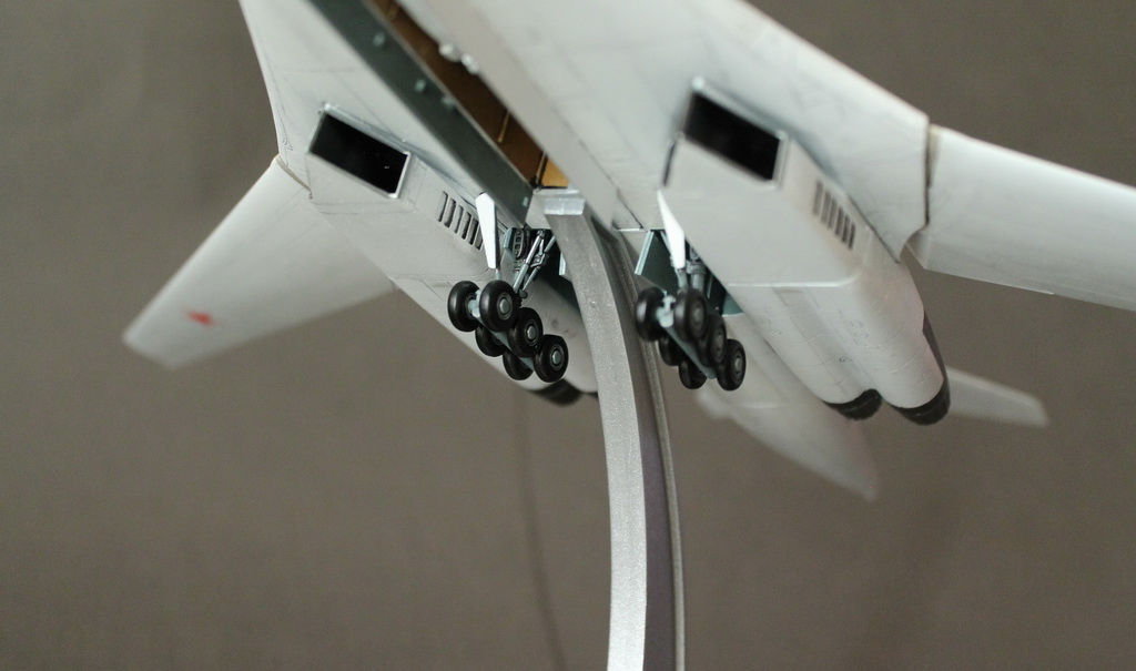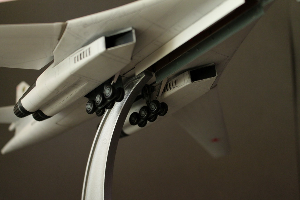 Не плохо! До конфигурации "открытый бомболюк + выпущенные шасси" докапываться не стоит (думаю, это чтобы больше интересного было видно), а вот стреловидность крыла + выпущенные шасси- как-то не естественно. Крейсерская скорость полета соответствует такой стреловидности, как на модели, следовательно с выпущенными шасси сочетается максимальный размах крыла (хотя во время тренировочного полета "по кругу" может так и бывает).