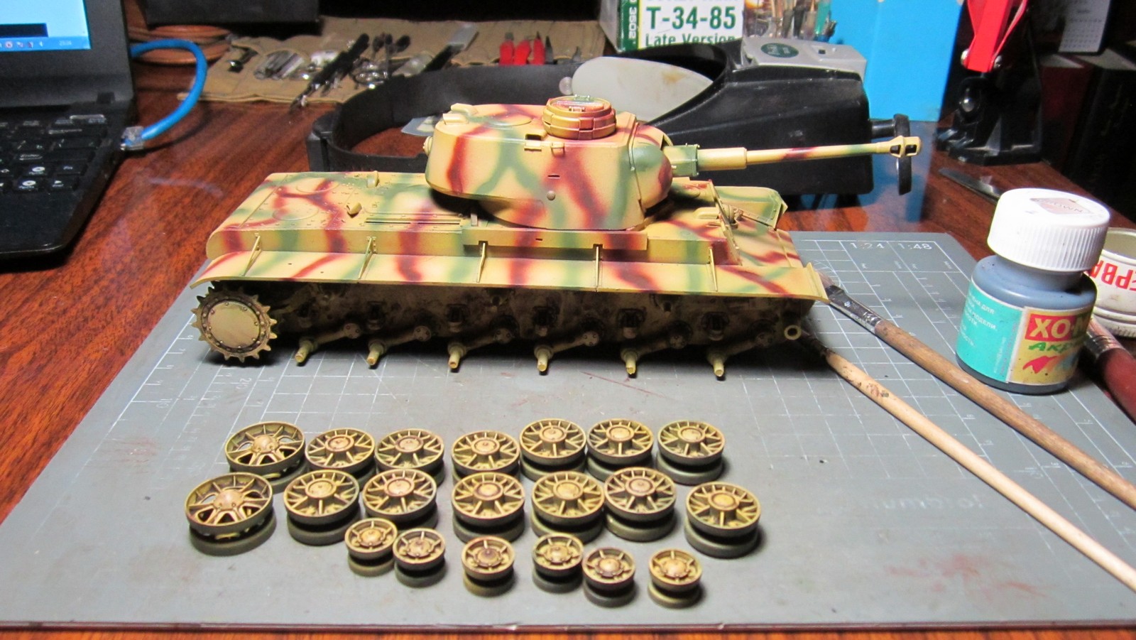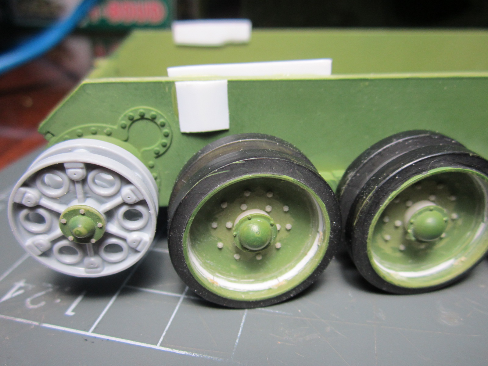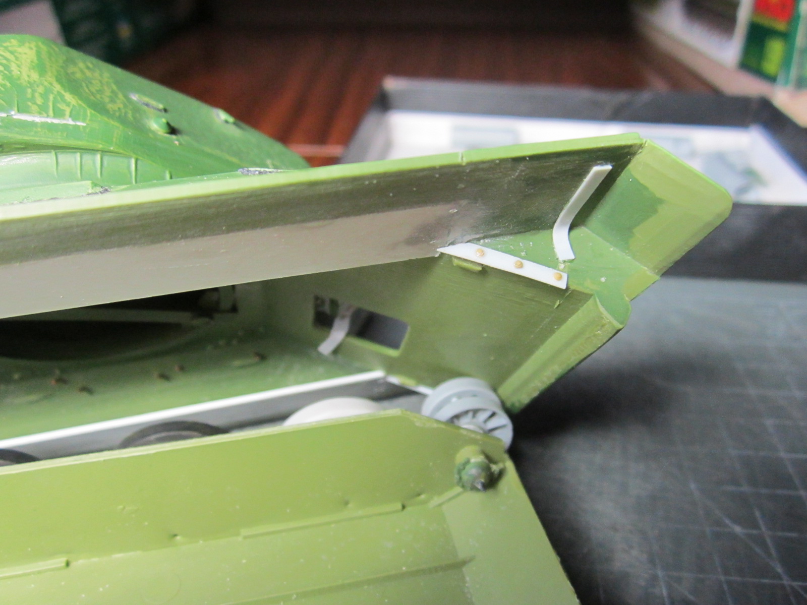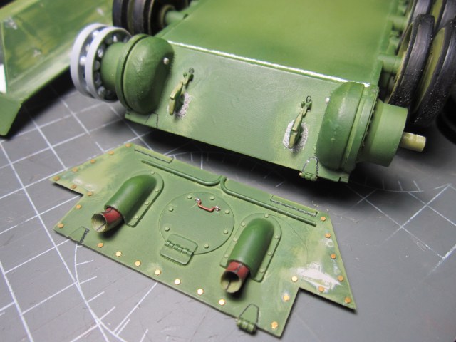 Олег, возни будет много. Про катки Ты сам знаешь, тросы тоже; надо внимательно посмотреть на скобы для шпор и что там уложить под них. Траки на лбу. Крепления крыльев (планки). Бронировка выпускных труб. Скоба на люке ТО, пробки слива масла на корпусах бортовых редукторов. Все головки "болтов" на кормовых листах. Ручки на доп. баках и толщина листов на их торцах. Сетка над ТО. Оптика. Упоры для натяжения гусениц на лбу. Выштамповки на ящике ЗиП. Удачи!!!