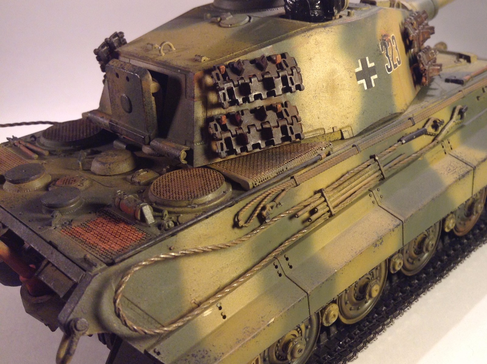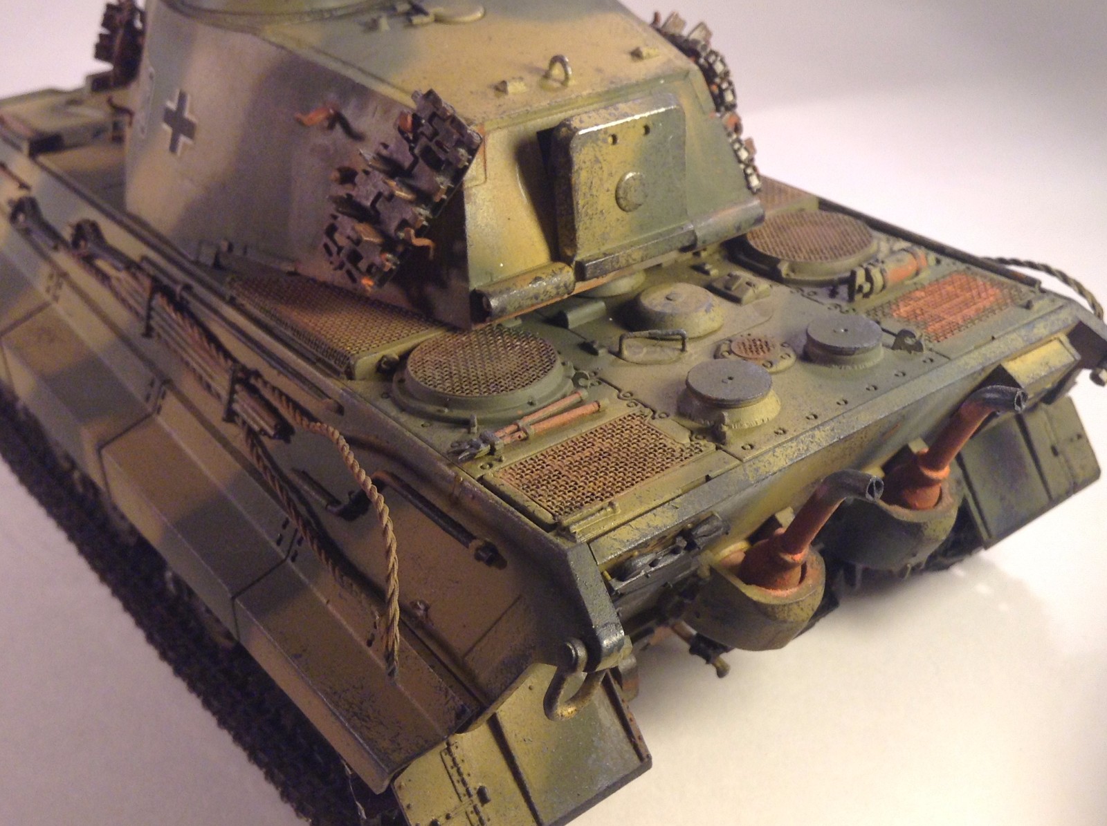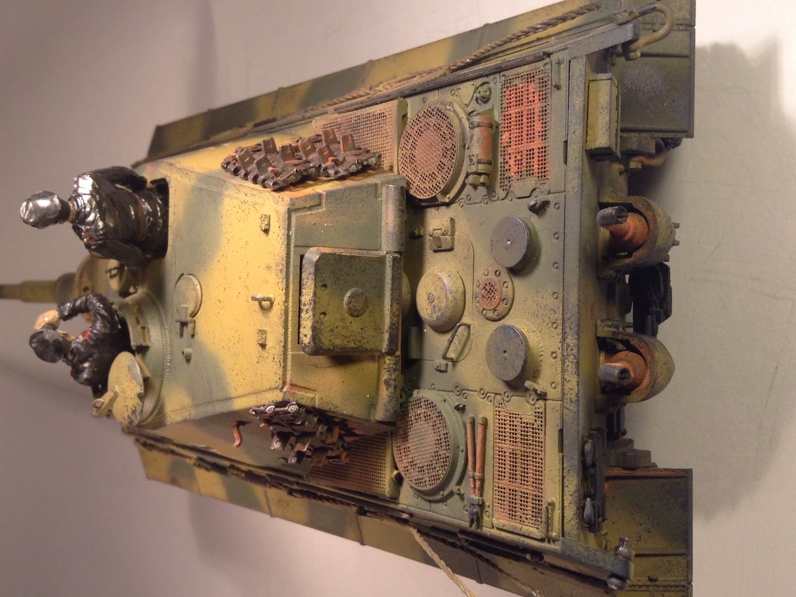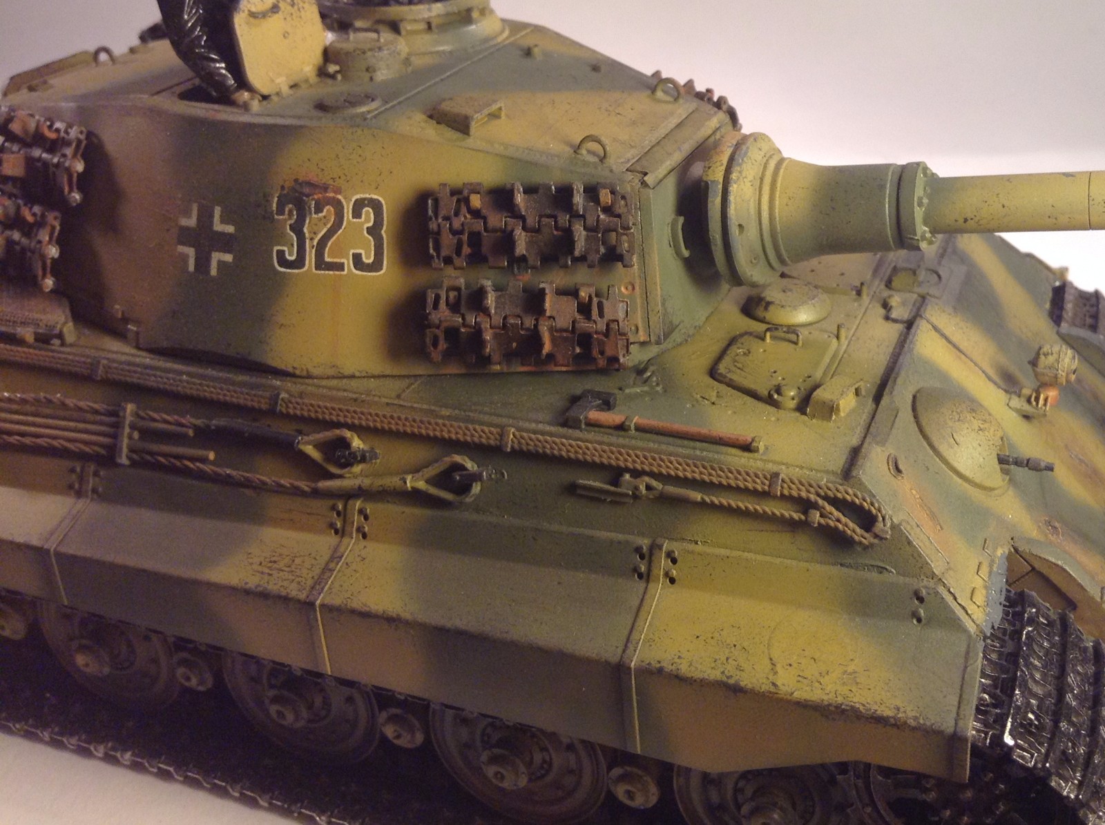Такое ощущение что два человека красили этот танк, камок по опытнее моделист,а докрашивал мелочёвку дилетант,как бы так.
