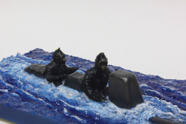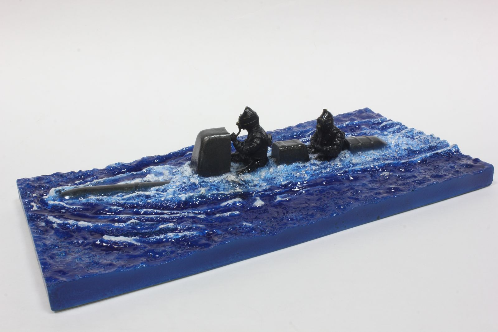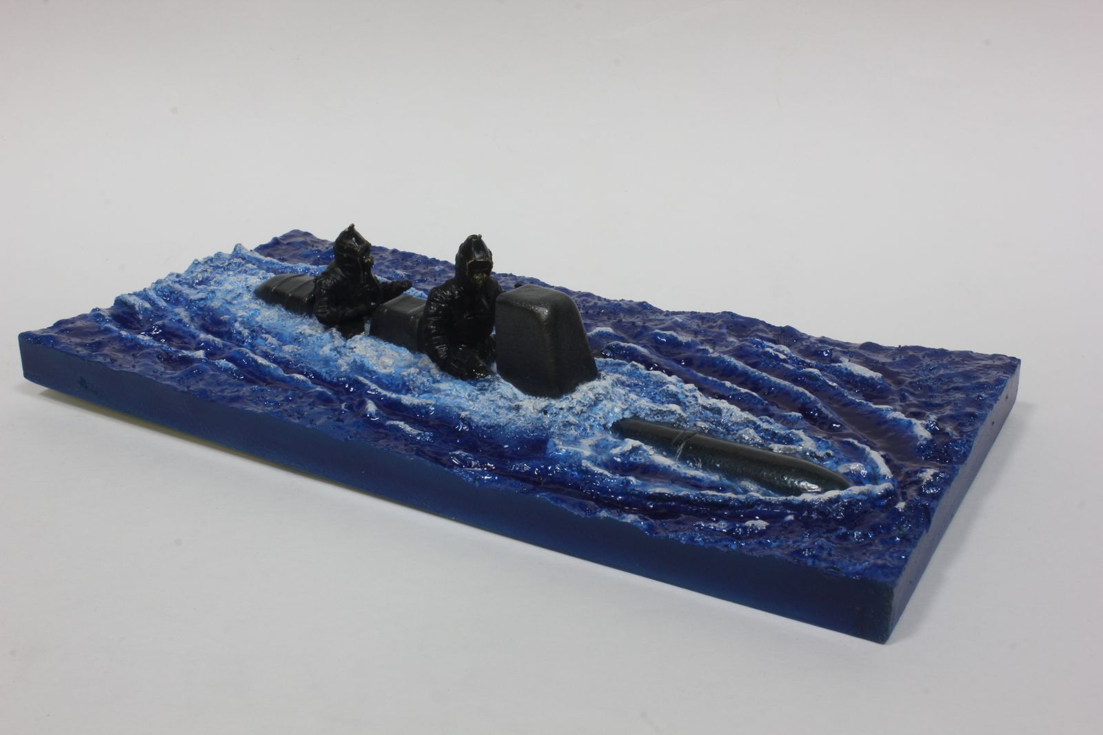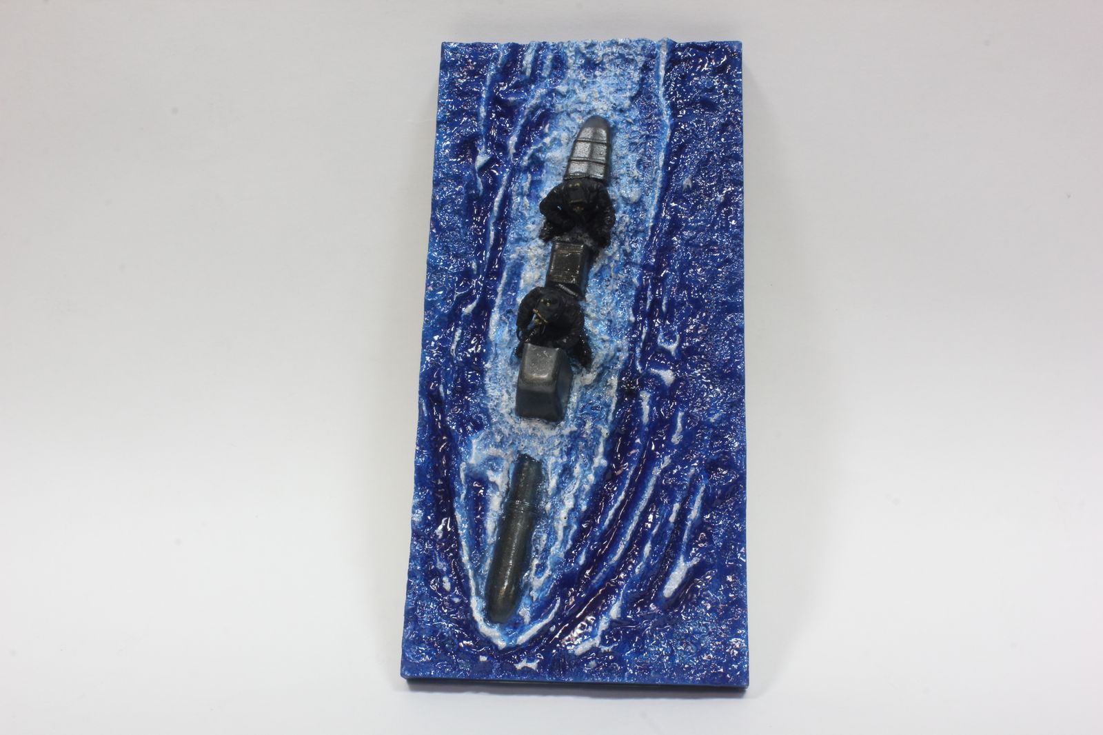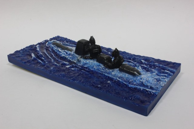 Красил так: сначала сильвер, потом залил от души синим клиром, а потом прошелся в углублениях темно синей краской. Гребни волн прошелся белым акрилом, а между гребнем и синим - немного белого масла. хотел добавить зеленого - но не понравилось. Жидко разведенный зеленый акрил давал вкупе с синим - желтый. Так что вода получилась как в рекламных проспектах турфирм.