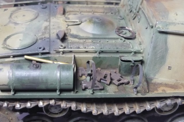 Доработаны мелочевка: добавлены болты, гайки, клепки, люк для погрузки боеприпасов с правого борта ванны, поручни на МТО, ящик на правом крыле за рубкой. Добавил небольшую матчасть в виде запасных траков, мотка проволоки и кирки, для придания легкого ощущения бытовухи.
