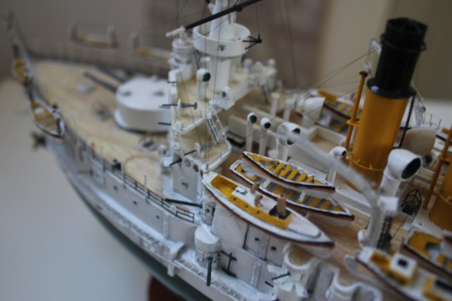 Неплохо, отдельно отмечу то, что работа самодельная - мои поздравления с завершением. Но на макросъмке видны неаккуратности покраски. Также не уверен, что леера на главной палубе были черные, мне кажется, что должны быть в цвет корпуса.