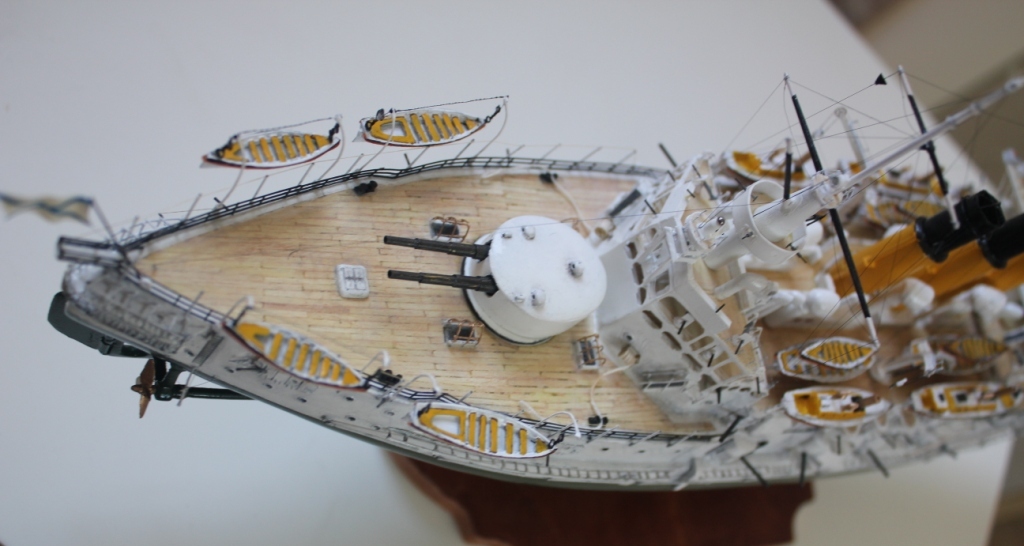 По поводу цвета леерных ограждений. В постройке ориентировался на чёрно белые фото корабля в Средиземноморском окрасе на рейде п.Ревель 1902г. На них видно, что леерные ограждения тёмные. Возможно они покрашены были в шаровый(серый). Я об этом подумал когда уже чёрные установил. Однако колер тёмный.