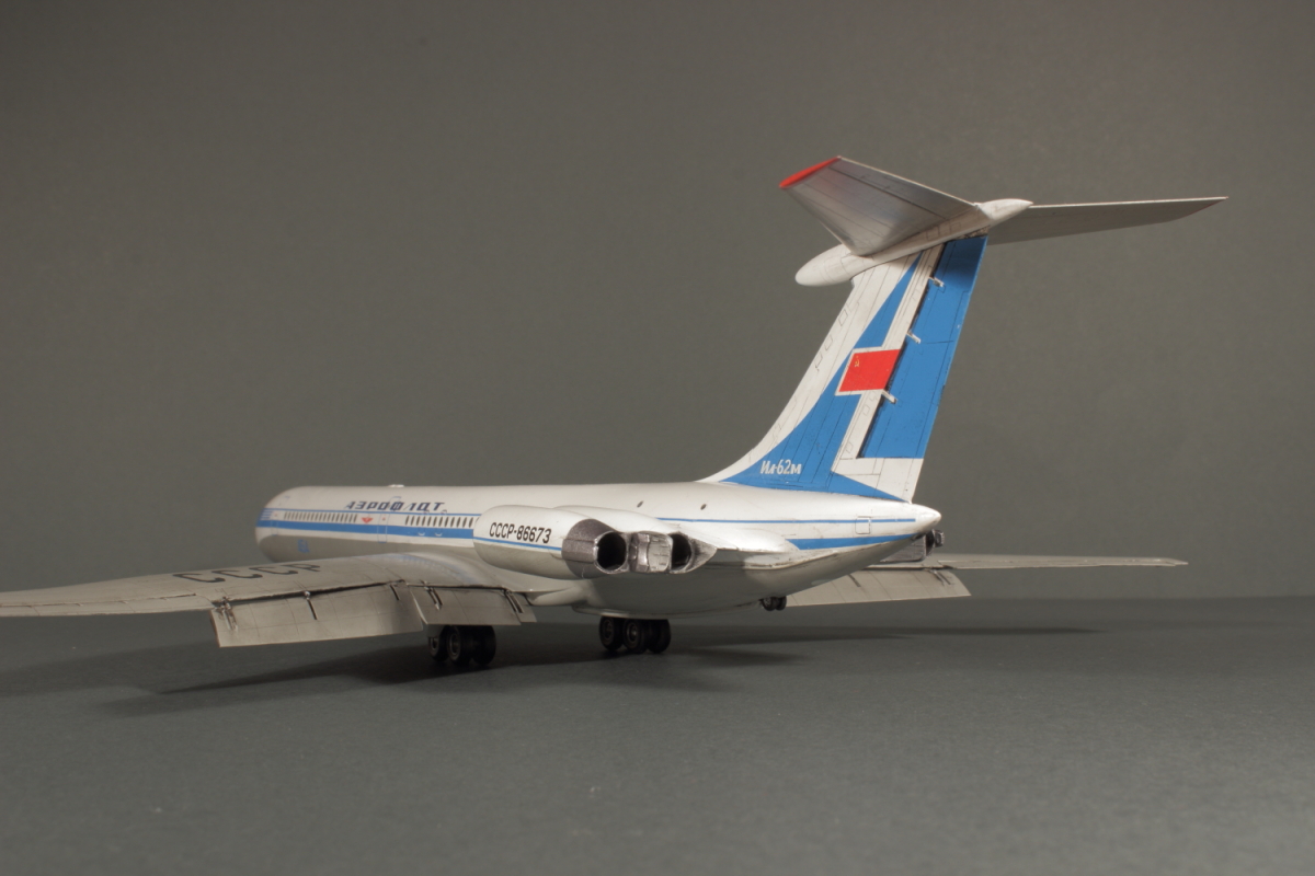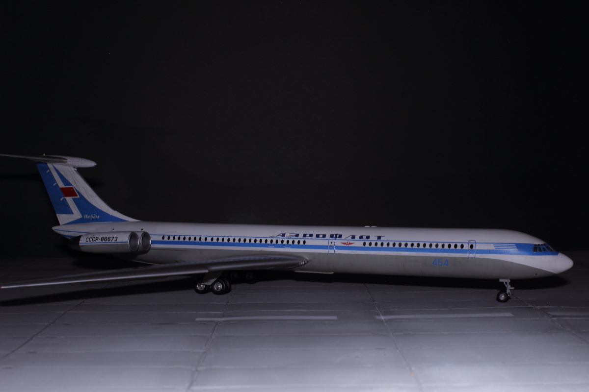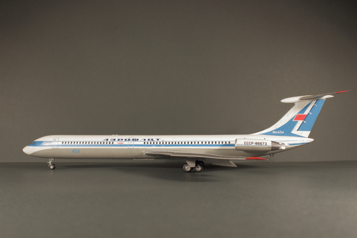 Отличная модель получилась, в редкой пока ливрее! Полоса на двигателе действительно параллельна основной. Ил-62М СССР-86673 заводской номер 70303. Первый Ил-62 с двигателями НК-8-4 (Двигатели Д-30КУ таким образом не подходят к этой ливрее) мелькнул в эпизоде фильма "Невероятные приключения итальянцев в России". Цвет носа кстати должен отличатся от белого. Он скорее светло-серый на фото.
