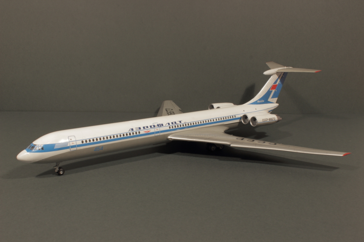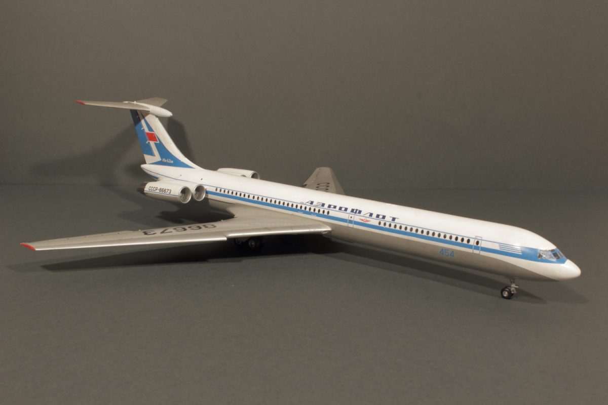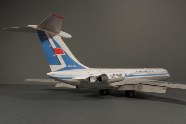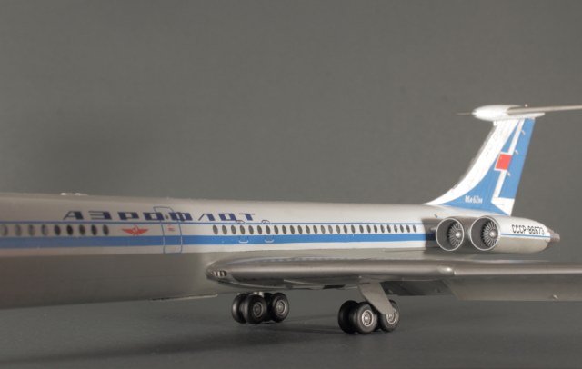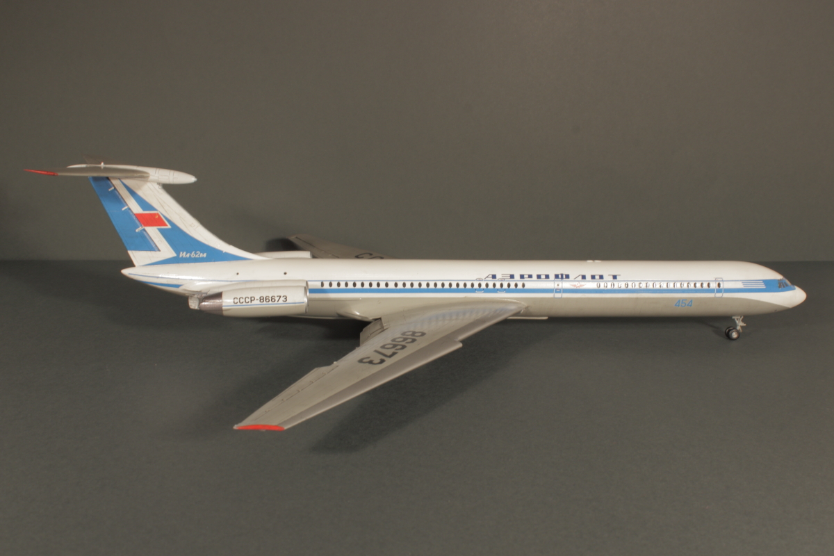 Отличная модель получилась, в редкой пока ливрее! Полоса на двигателе действительно параллельна основной. Ил-62М СССР-86673 заводской номер 70303. Первый Ил-62 с двигателями НК-8-4 (Двигатели Д-30КУ таким образом не подходят к этой ливрее) мелькнул в эпизоде фильма "Невероятные приключения итальянцев в России". Цвет носа кстати должен отличатся от белого. Он скорее светло-серый на фото.