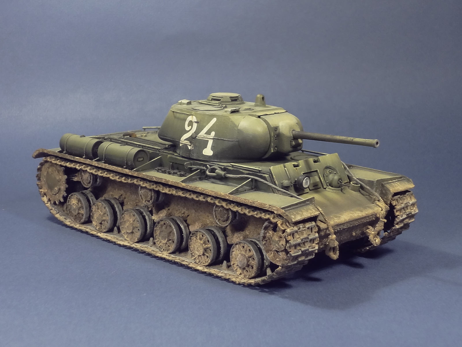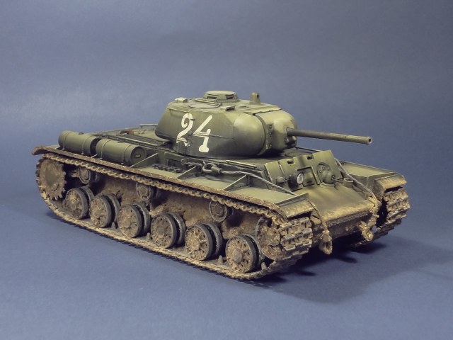 Красивая модель, про не вполне естественно нанесенную грязь уже написали, конвойный фонарь и литьевые номера тоже. Дополнительный бронелист на лобовой броне видел только на фотографии КВ-1с с утяжеленным корпусом. Если Вы взяли за прототип взяли именно машину с бортовым номером 24 из 6-го отдельного гвардейского танкового полка прорыва, то неверны установленные гусеницы - на прототипе (и на приведенных Вами фотографиях это видно) каждый трак в ленте имел гребень. Дополнительного бронирования у него тоже нет. Кроме того, на машинах полка, сфотографированных весной 1943 года видны остатки зимней окраски.