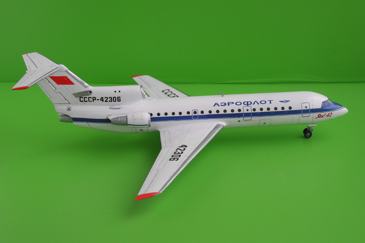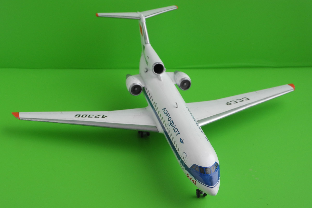 Позвольте пару замечаний: у ранних Як-42 на верхушке киля был обтекатель, сродни Ту-154.В Вашей версии и передняя кромка крыла и накладка на киле в районе выхлопа ВСУ и сопловые части ТРДД выполнены из алюминия.Но две посление детали- это, как минимум, титан( цвет-нечто среднее между "алюминий" и "оружейная сталь",в горячих зонах имеет явно выраженные цвета побежалости в сине-красновато-желтоватых тонах).В целом- очень достойная работа.