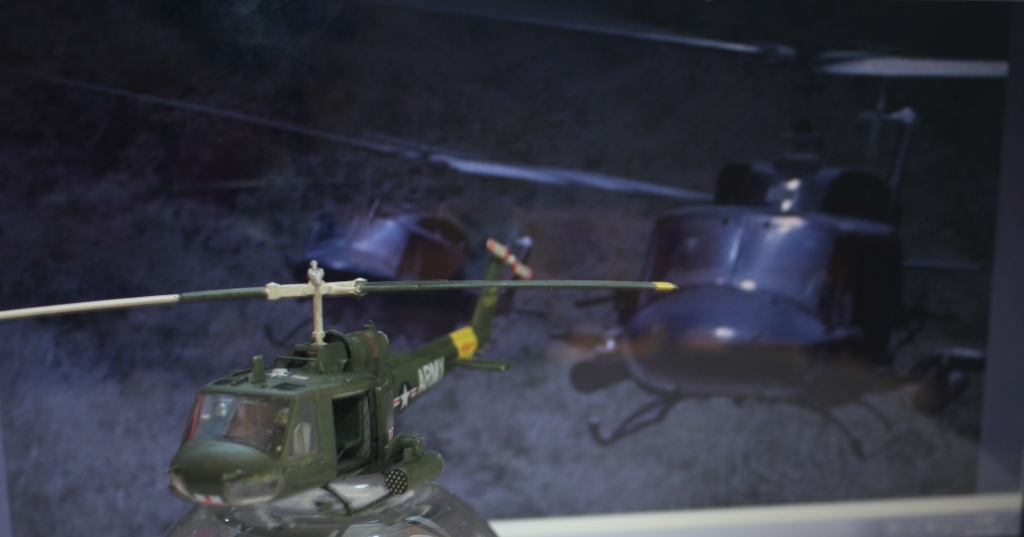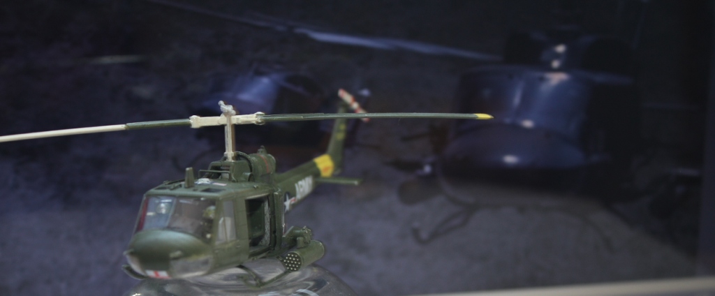 Из ошибок отмечу подвеску вооружения на вьетнамский Medivac (медицинский вариант Хьюи). В жарком воздухе Вьетнама приходилось выбирать что-то одно - либо раненые, либо вооружение. Это очень хорошо описано у Роберта Мейсона в "Цыпленок и Ястреб". Судя по ОЗ и окраске у Вас именно медик из Вьетнама. Кроме того непонятно почему у Вас автомат края лопастей и балансиры белого цвета? Должны быть стальные.