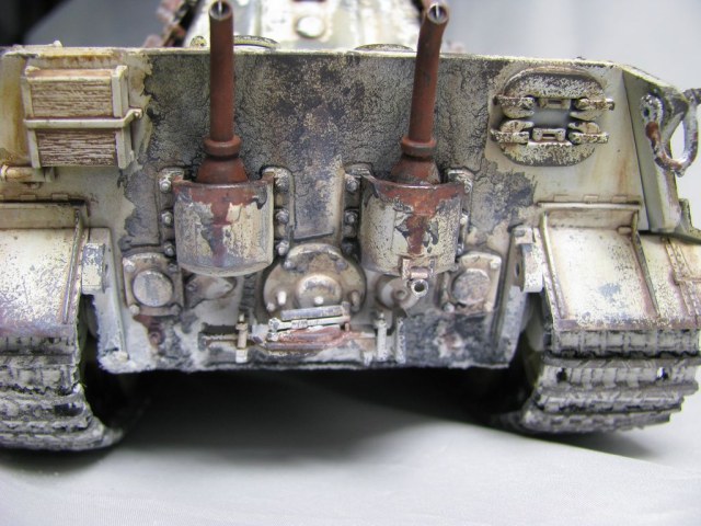 Я вообще зимники не люблю, тоску нагоняют серостью своей. Но у Вас просто сногшибательная реалистичность! Особенно впечатлили ржавые траки на башке. Как сделали? У меня никак такого эффекта не получается.