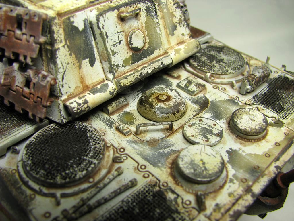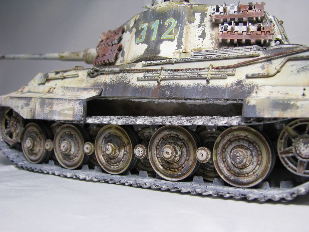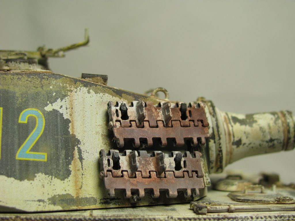 сначала окрас XF-84 (тамия), потом акриловый лак, после просушки слой лака для волос, 1-2 мин., слой белой краски, 30 сек. ждём, потом смачиваем трак в тёплой водичке и потихонечку "обдираем" слой белой краски жёсткой кистью и т.п. После просушки закрываем слоем акрилового лака (глянец), сохнет, наносим фильтрик, можно оттенки от серого до оранжевого, последний придаст тем местам где краска ободралась до "металла" небольшой оттенок ржавчины. Сушим, можно лачком подзакрыть, и напоследок, сухих пигментиков ржавчины разных оттенков, тонкой кисточкой (почти как красишь обычной краской), без фанатизма.