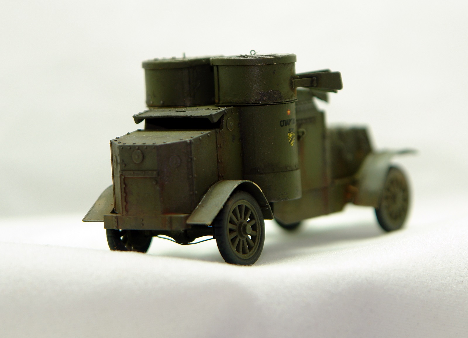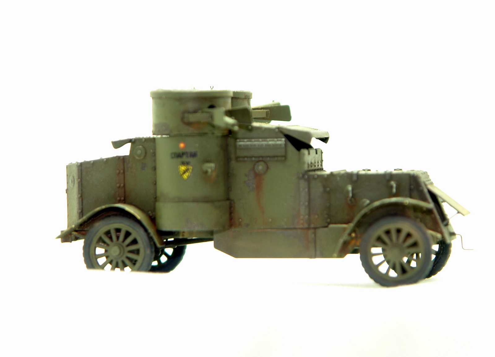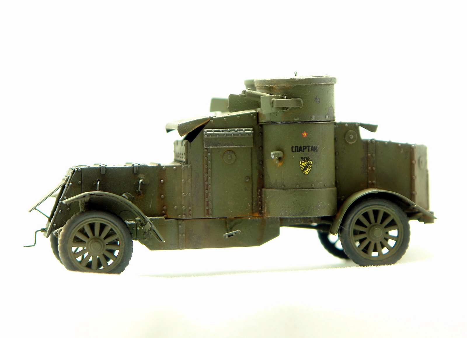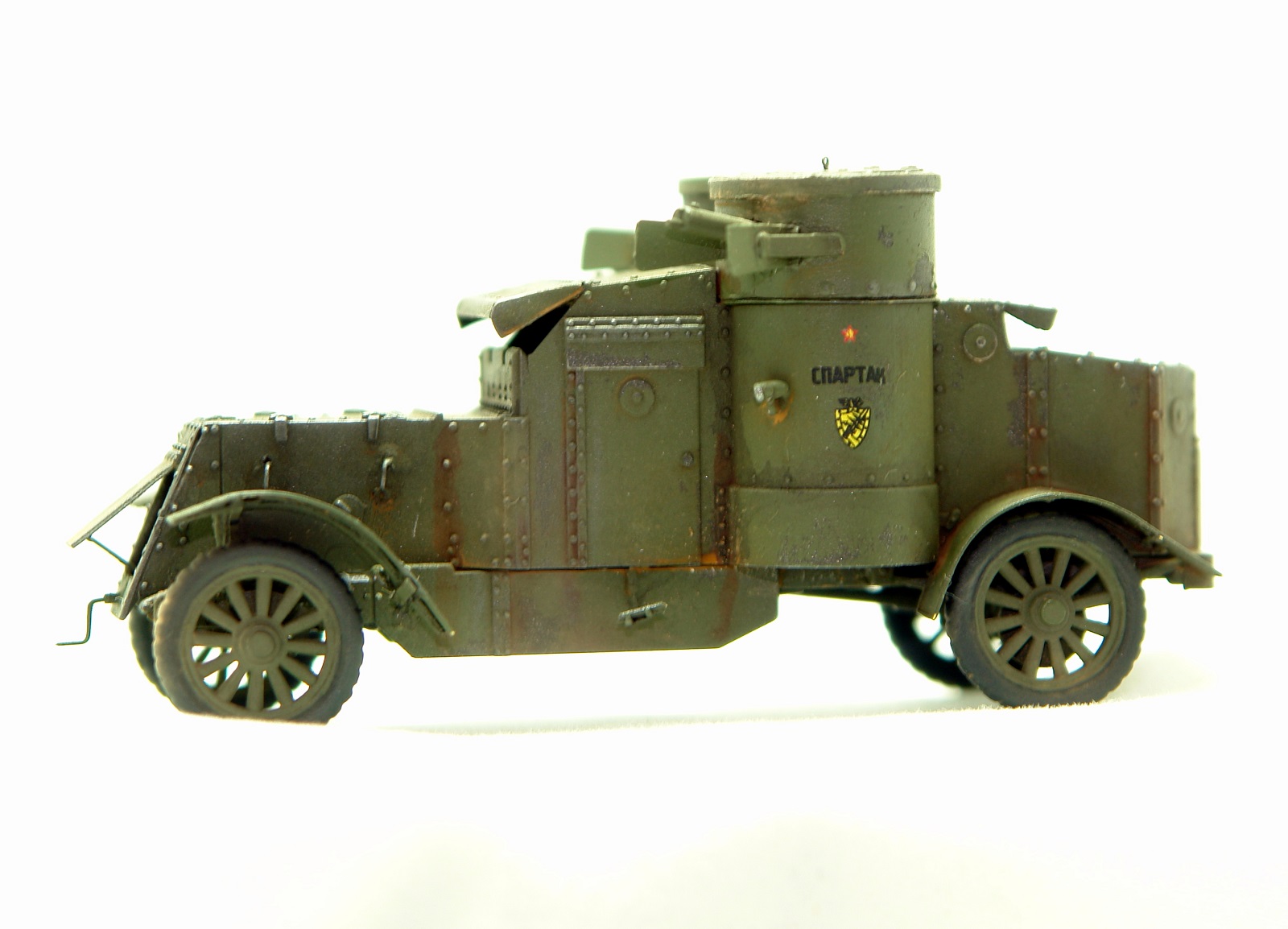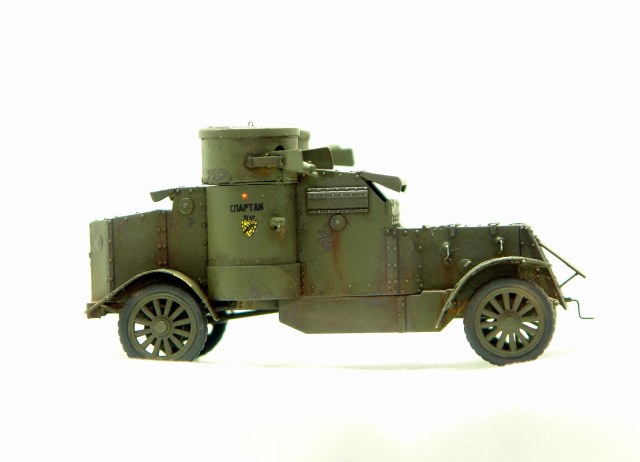 Отличная модель от МастерБокса. По сравнению с МК4 изменений не много. Это односкатные задние колеса, другое вооружение и отсутствие аккумуляторов на внешней подвеске. Использовал травление от Норт Стар. Сделал "Спартака" повоевавшим, на закате Гражданской. Открыл - выпилил люки. Знаю, что макросьемка зло вылезли косяки, которых не увидел при сборке, но надеюсь понравиться.