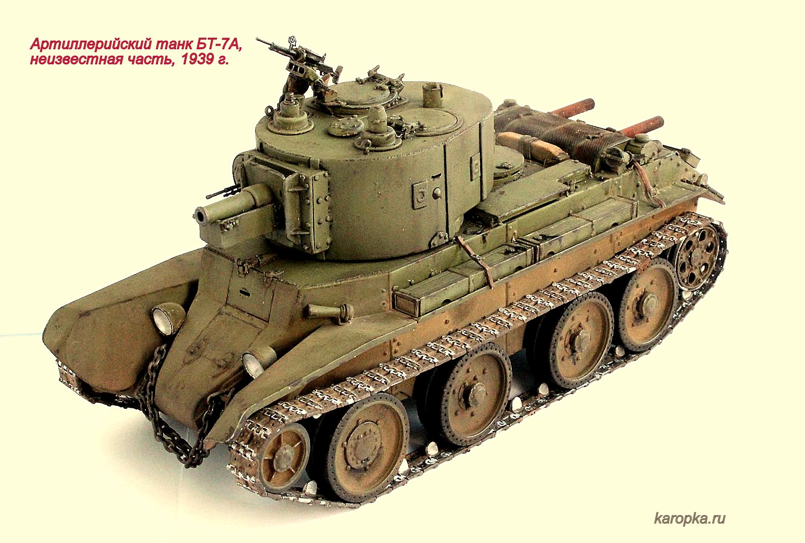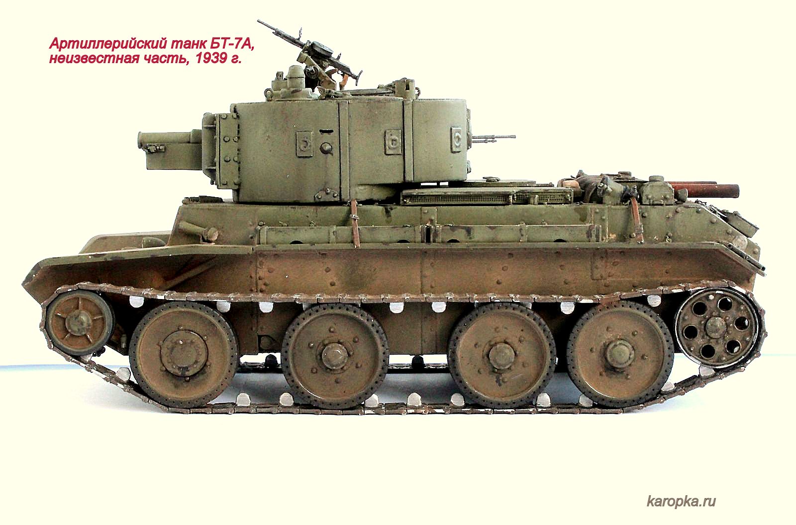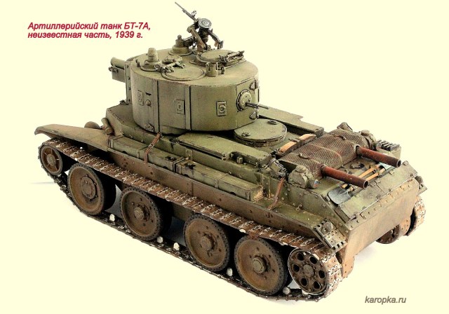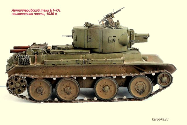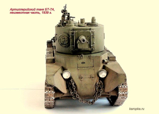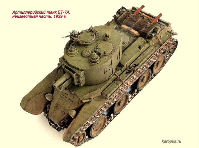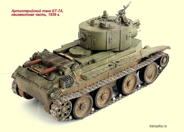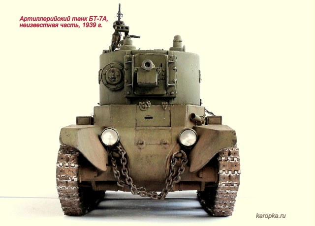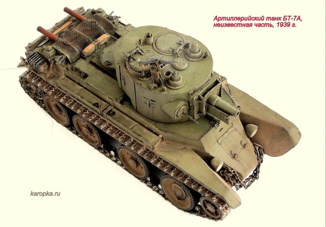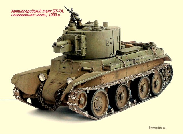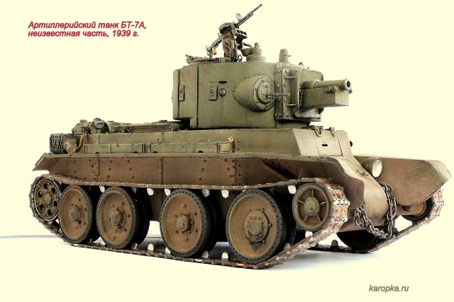 Выставляю очередную свою модель - артиллерийский танк БТ-7А. В процессе использовались: модель танка БТ-7 1935 г. выпуска от "Тамии", башня и комплект шпор от "Комплекта ЗИП", точеные стволы пулеметов от "МоделПойнта", металлические гусеницы от "Фриул", фары "Эльф", травление от "Абера".