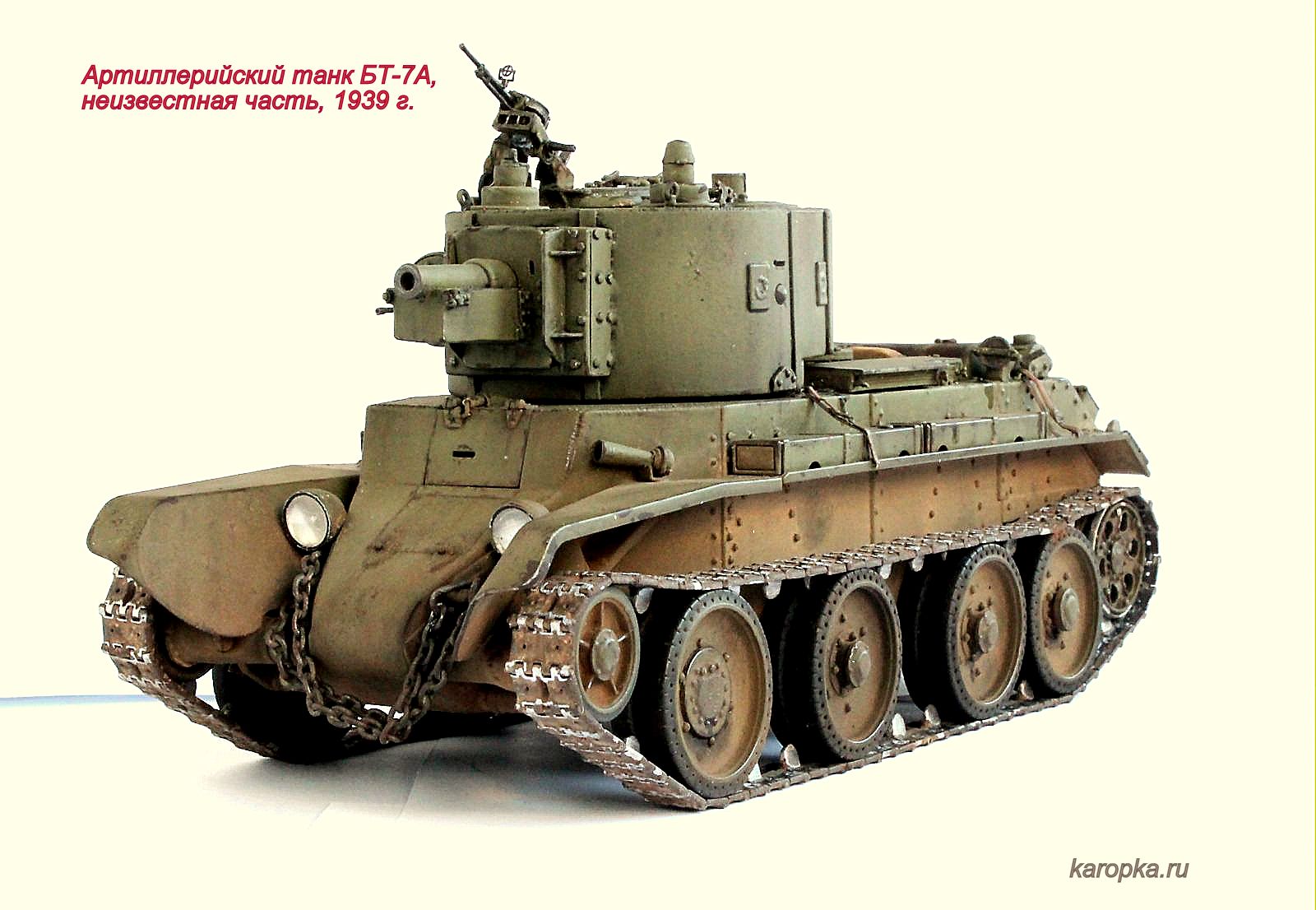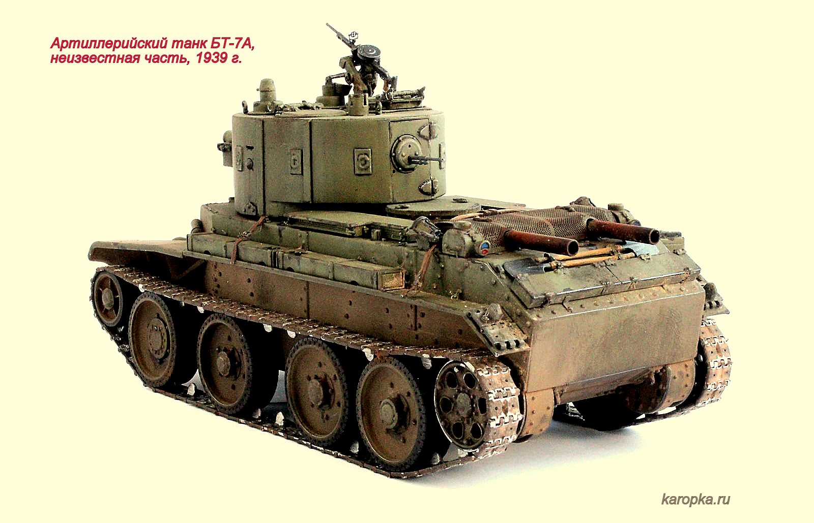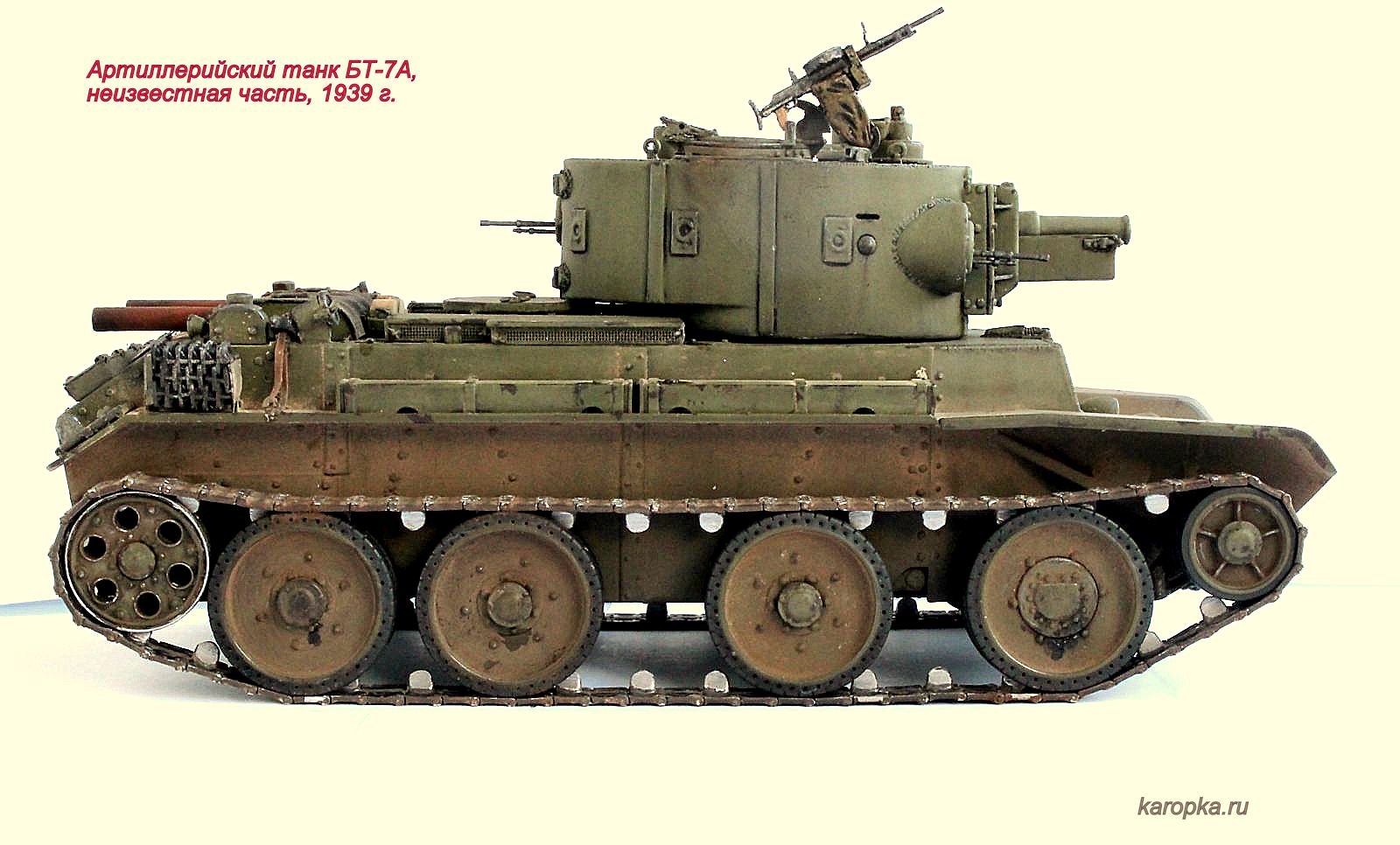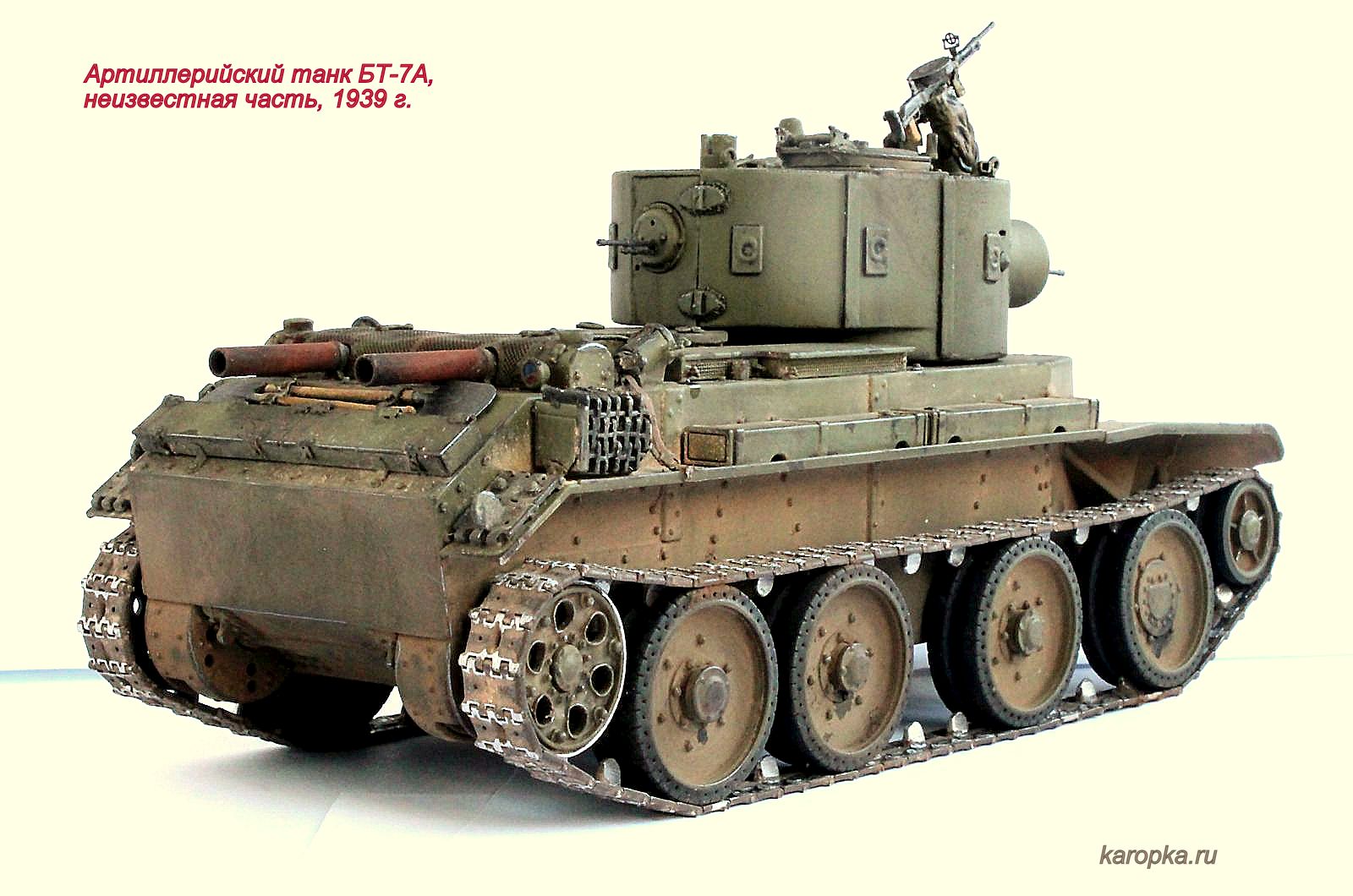 Выставляю очередную свою модель - артиллерийский танк БТ-7А. В процессе использовались: модель танка БТ-7 1935 г. выпуска от "Тамии", башня и комплект шпор от "Комплекта ЗИП", точеные стволы пулеметов от "МоделПойнта", металлические гусеницы от "Фриул", фары "Эльф", травление от "Абера".