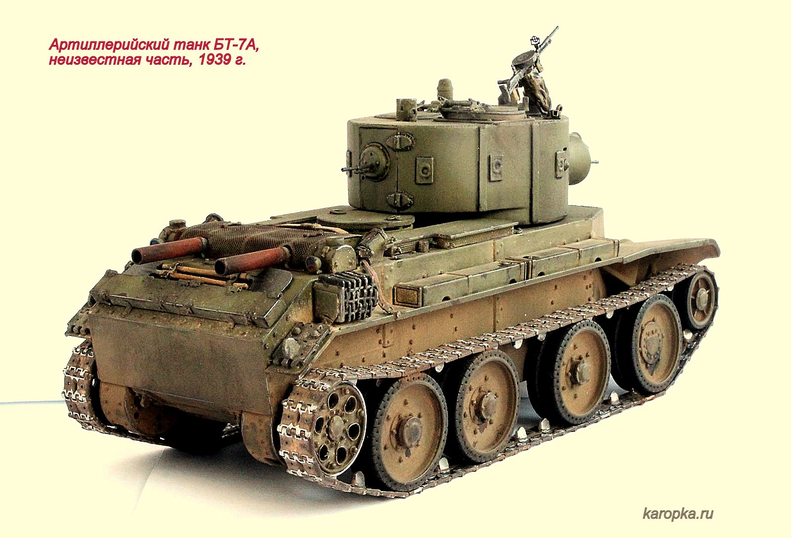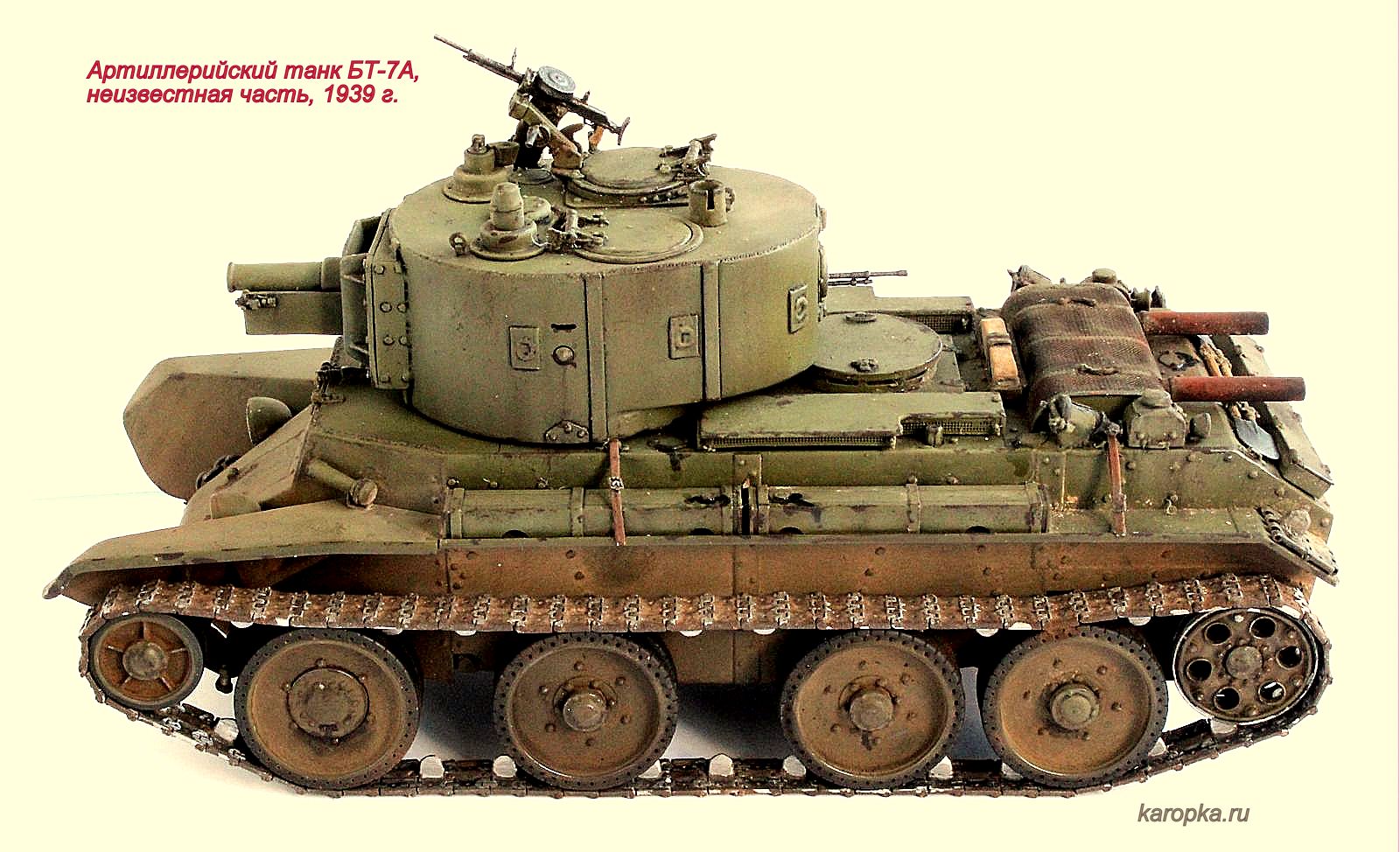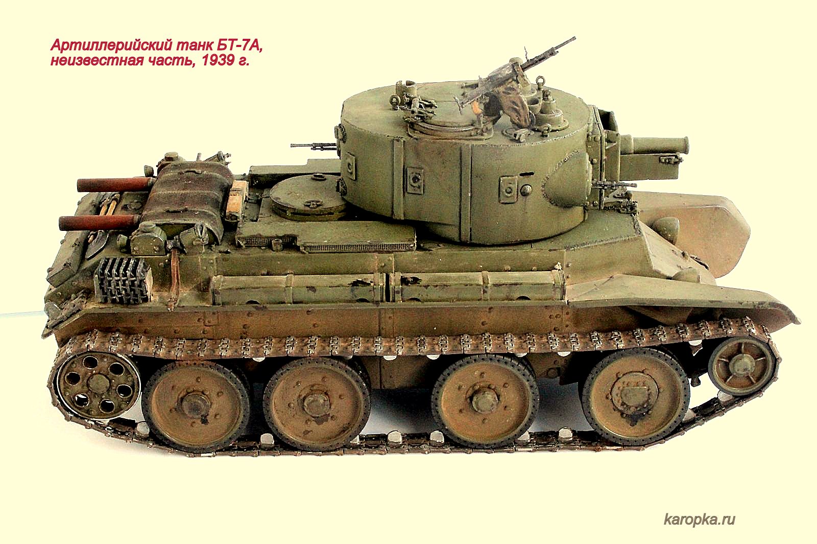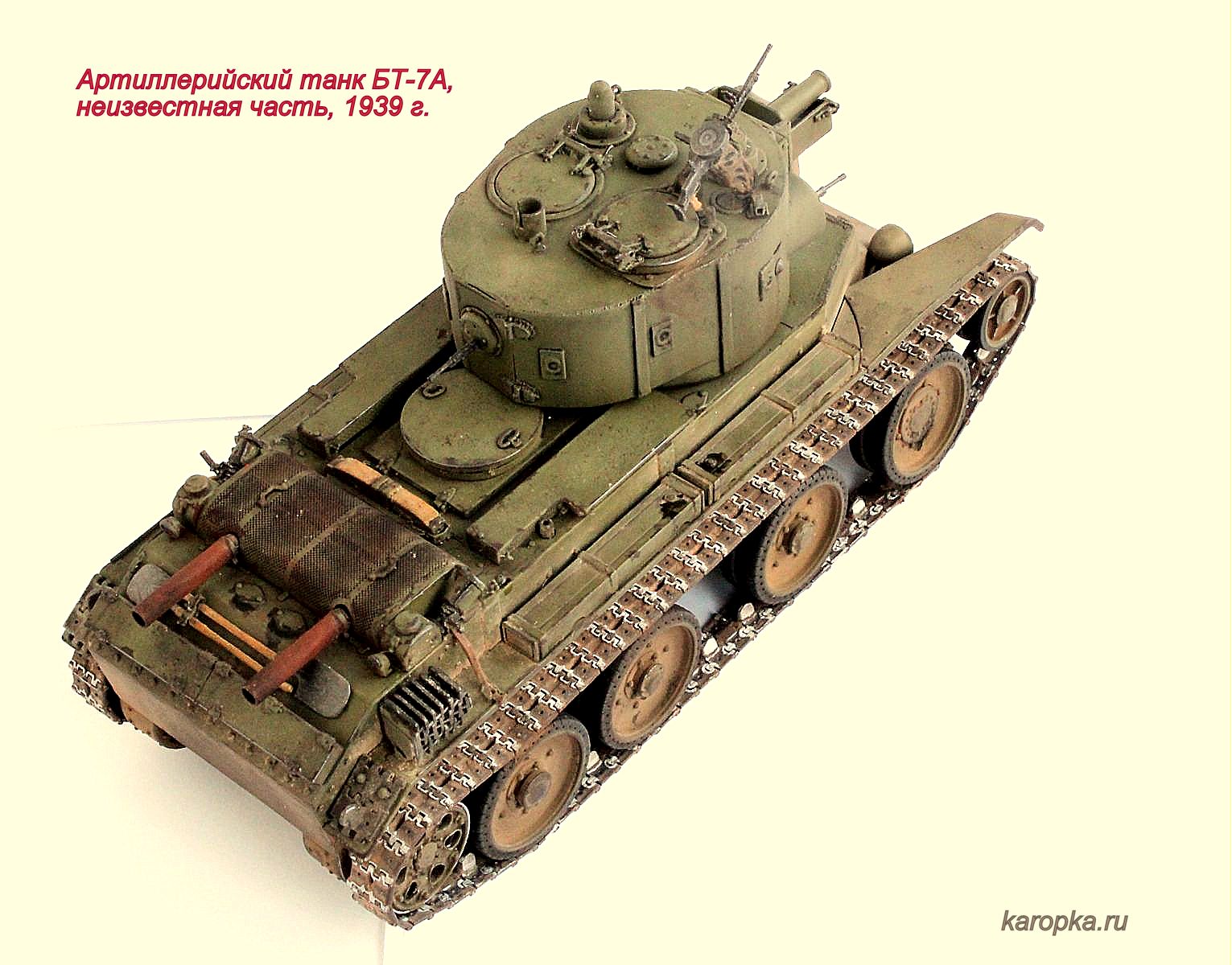 Выставляю очередную свою модель - артиллерийский танк БТ-7А. В процессе использовались: модель танка БТ-7 1935 г. выпуска от "Тамии", башня и комплект шпор от "Комплекта ЗИП", точеные стволы пулеметов от "МоделПойнта", металлические гусеницы от "Фриул", фары "Эльф", травление от "Абера".