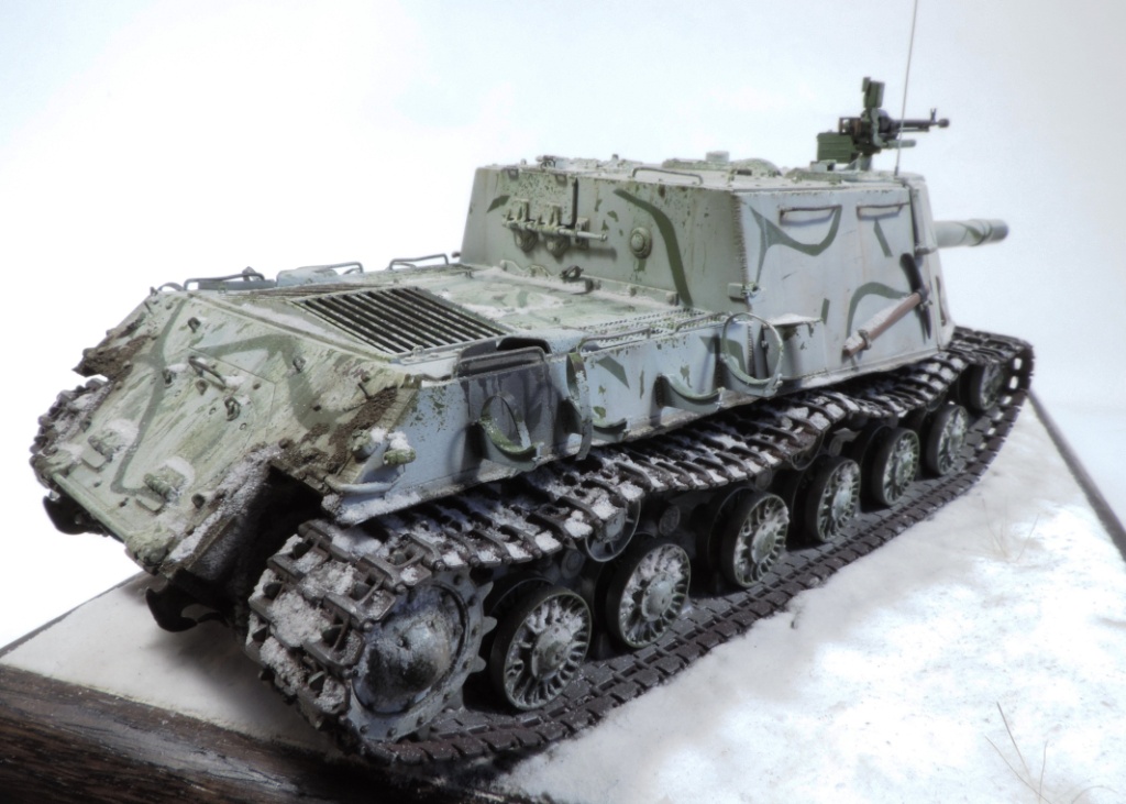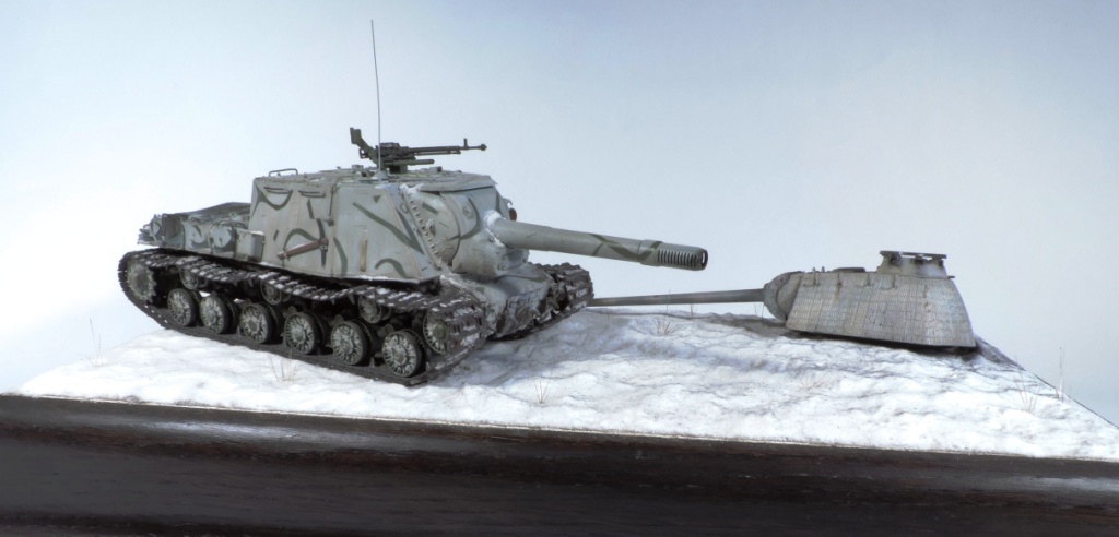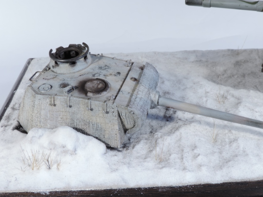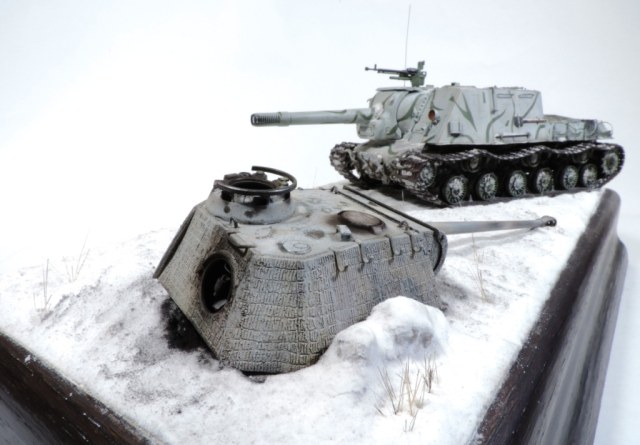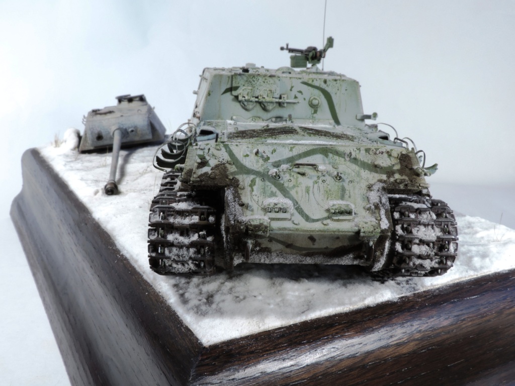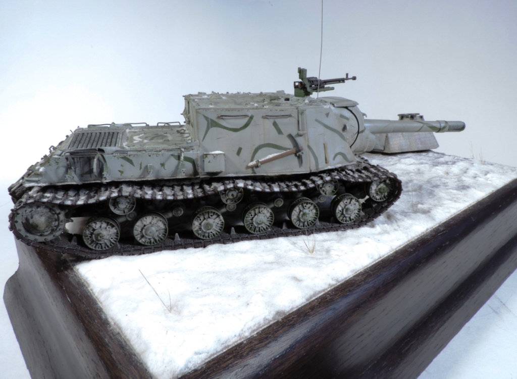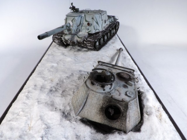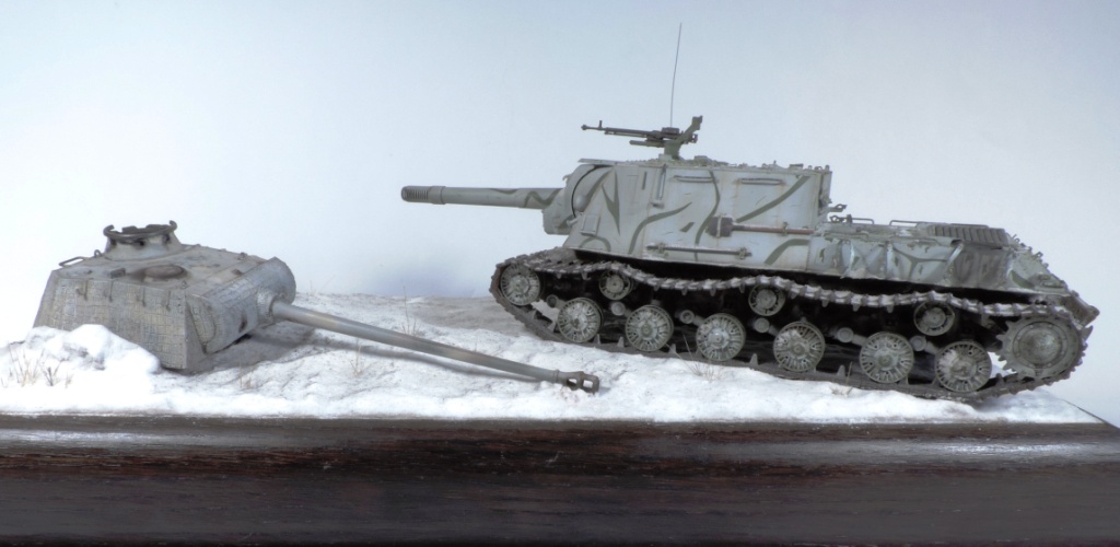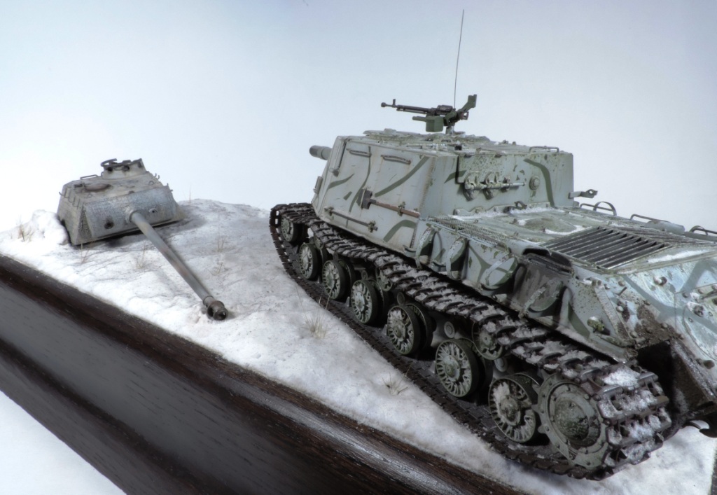 Хочу представить на ваш суд очередную свою работу. Идея сделать Зверобоя была давно, хотел построить в подарок отцу на День Победы, но в силу некоторых обстоятельств даже не начинал. Но сама идея осталась, вот решил построить зимний вариант(сначала хотел Берлинского). В процессе стройки решил дополнить его подставкой, а почти в конце работы добавил и его трофей. Если кому интересно стройка здесь http://karopka.ru/forum/forum188/topic21639. Набор от Tamiya если честно огорчил, пришлось и шпатлевать и применять струбцины, некоторые элементы заменил, а некоторые доработал. Башня Пантеры от Звезды тоже подверглась некоторым доработкам. Описывать не буду, если кому-то будет интересно, вся работа отображена в стройке.