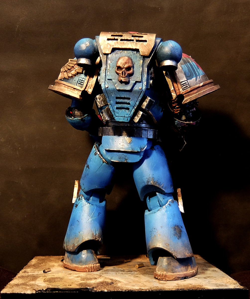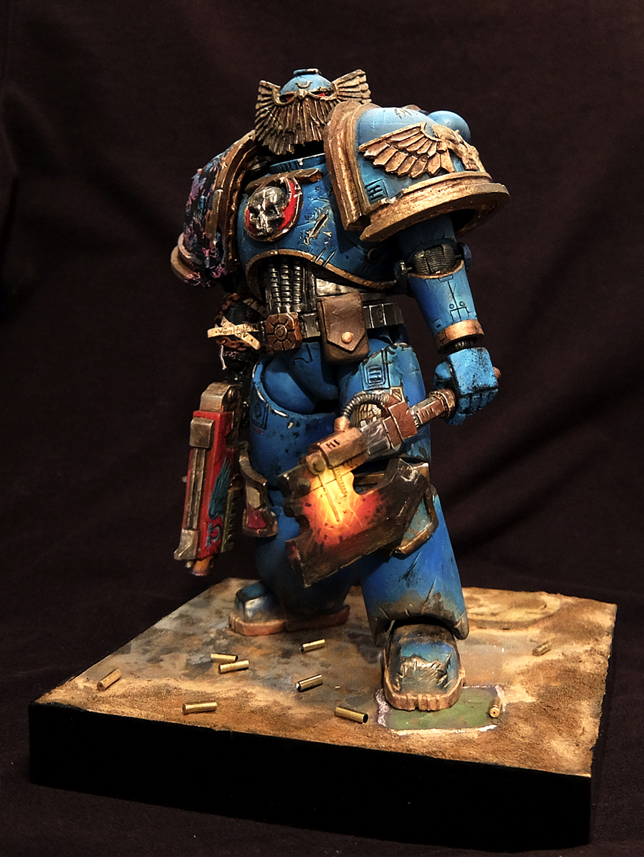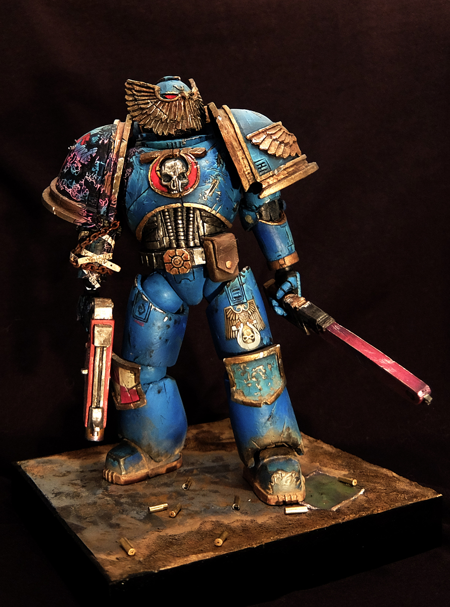 В первые красил фигуру такого масштаба, соответственно и косяков хватает. Набор был составлен для сборки ветерана ультрамаринов, но на одном из этапов что-то пошло не так и я решил сделать на руке след варп аномалии.