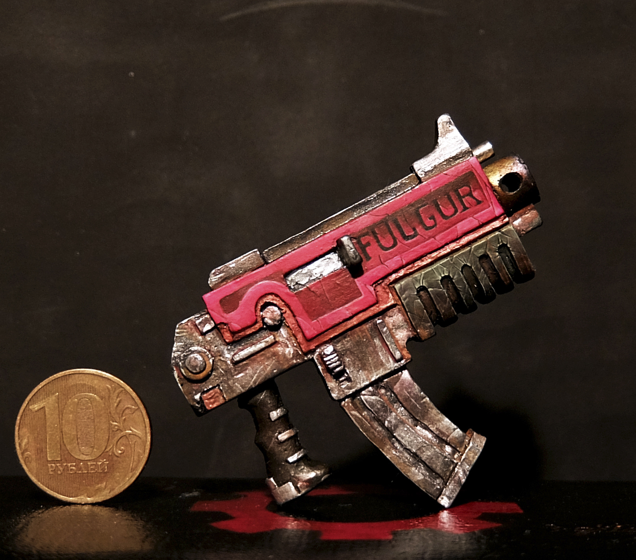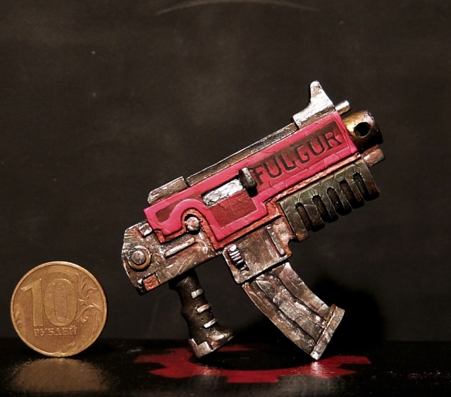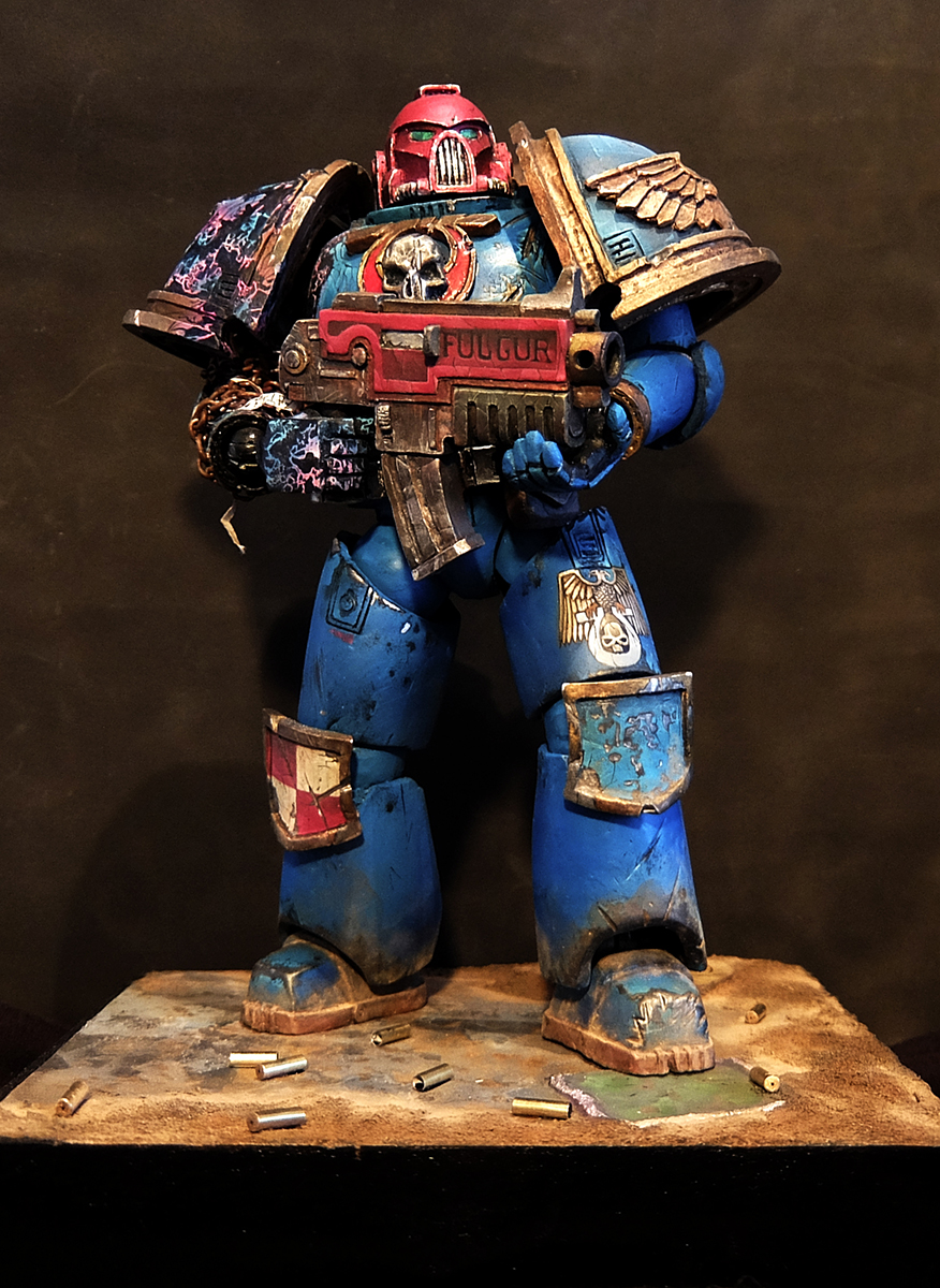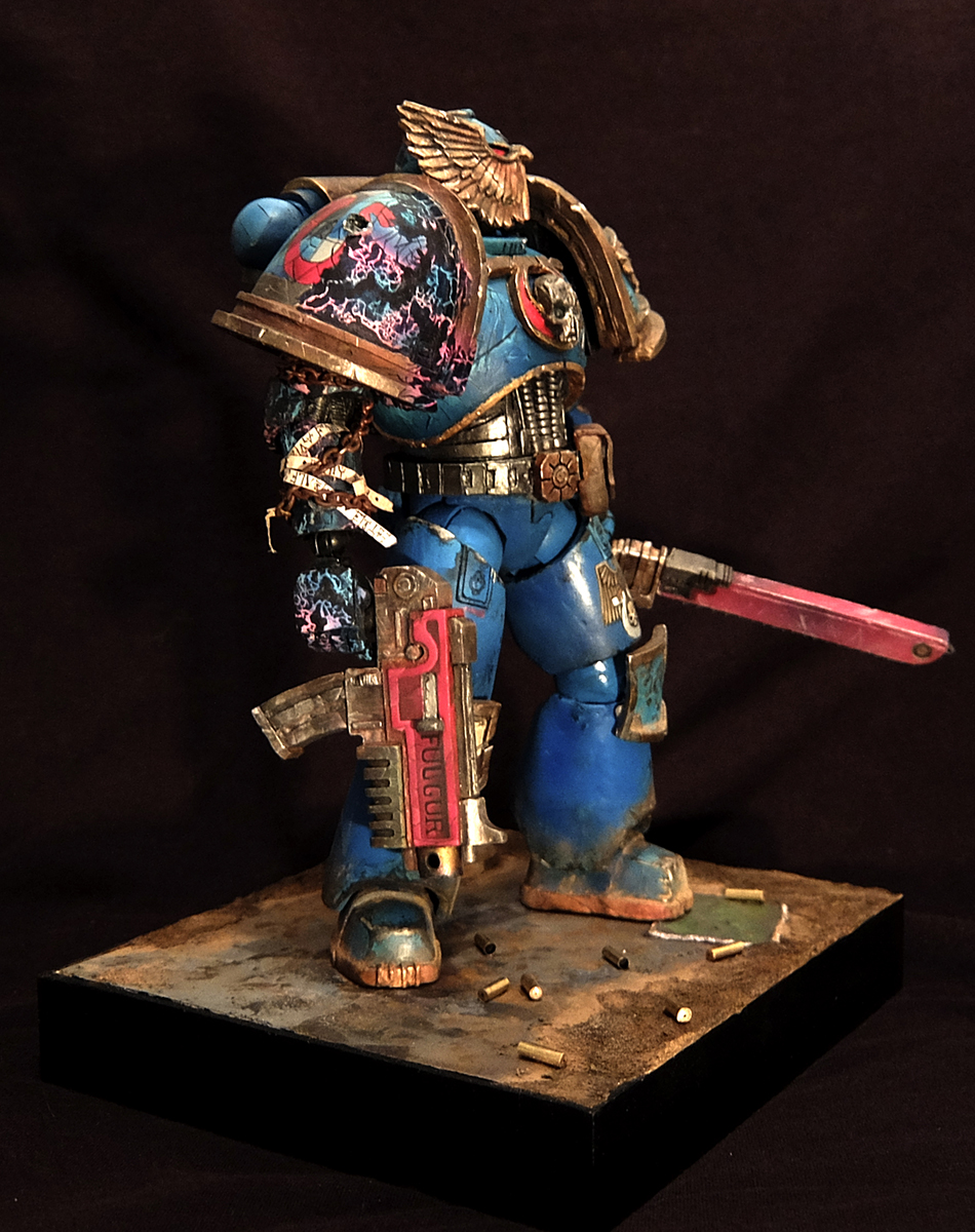 В первые красил фигуру такого масштаба, соответственно и косяков хватает. Набор был составлен для сборки ветерана ультрамаринов, но на одном из этапов что-то пошло не так и я решил сделать на руке след варп аномалии.
