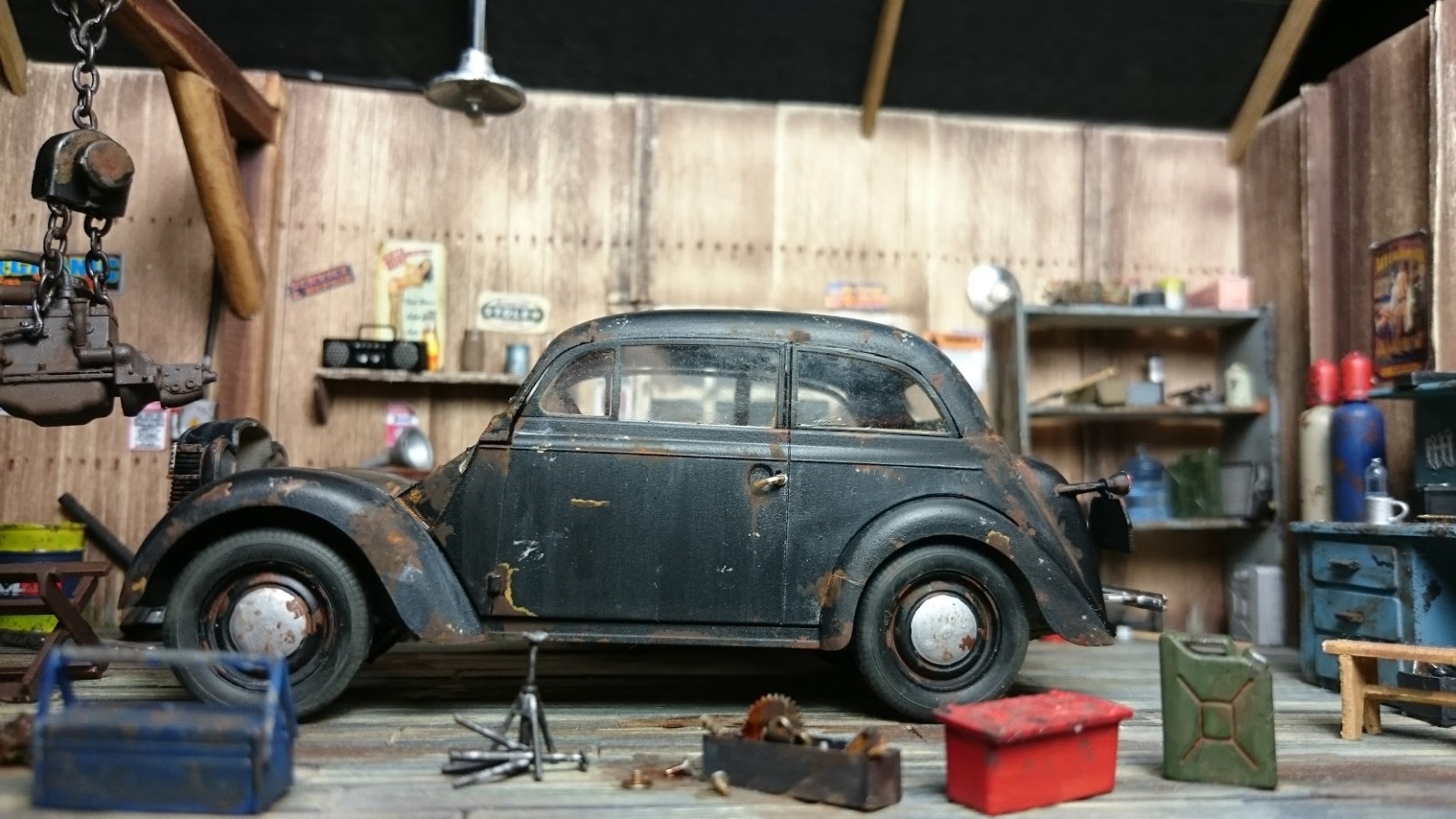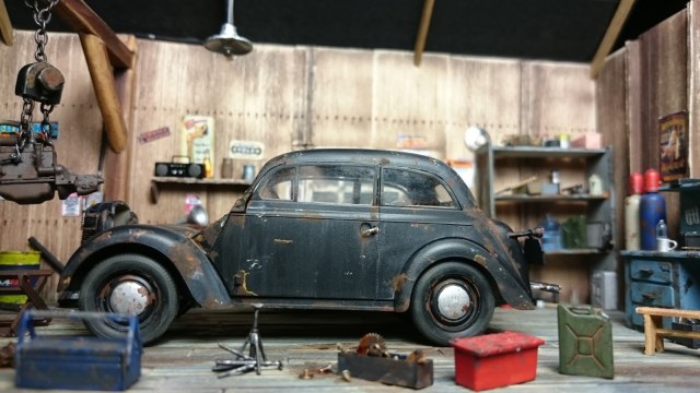 После строительства гаража в 24 масштабе были мысли сделать в 35,наконец-то руки дошли.О самой модели говорить думаю смысла нет,оказалась она у меня случайно,купив модель Москвича 401 открыв коробку я обнаружил что у меня купе.Модель долго стояла не знал куда применить,потом взялся за строительство гаража,но авто планировал поставить в него современное.Когда гараж был готов,примерил опель и решил оставить так.Гараж самодел из линеек,мебель из пластика,мелочевка остатки из разных наборов,инструмент травление от ACE,краски акрил tamiya,химия mig.