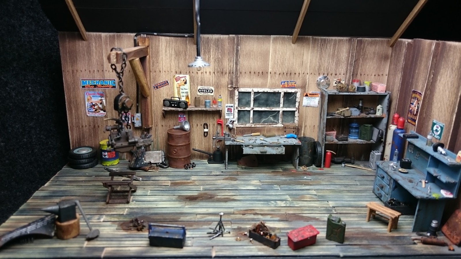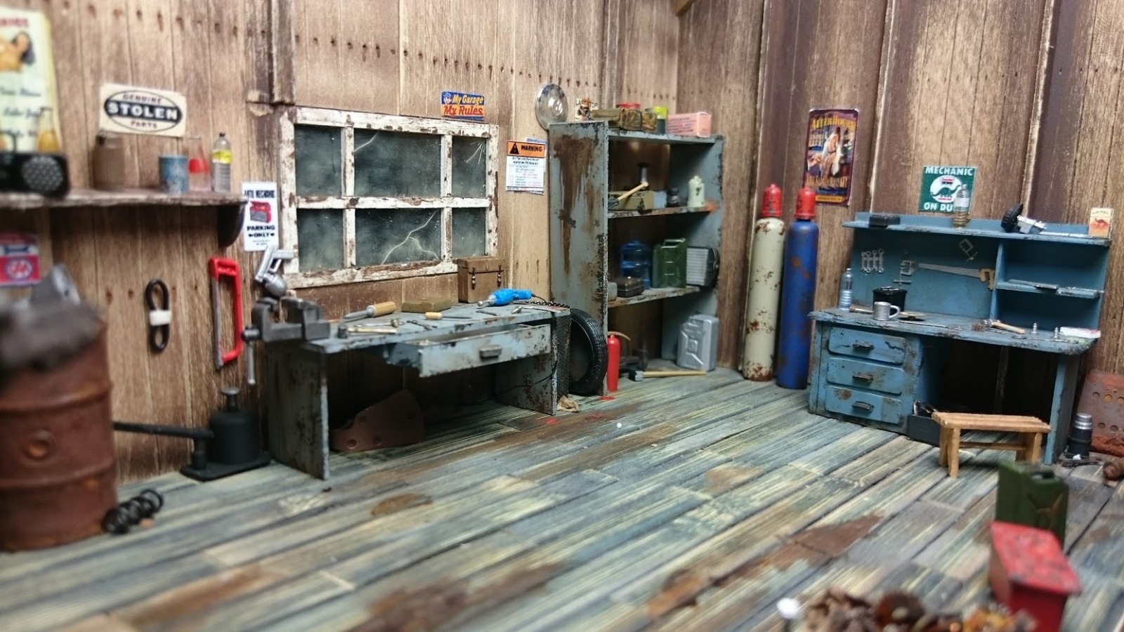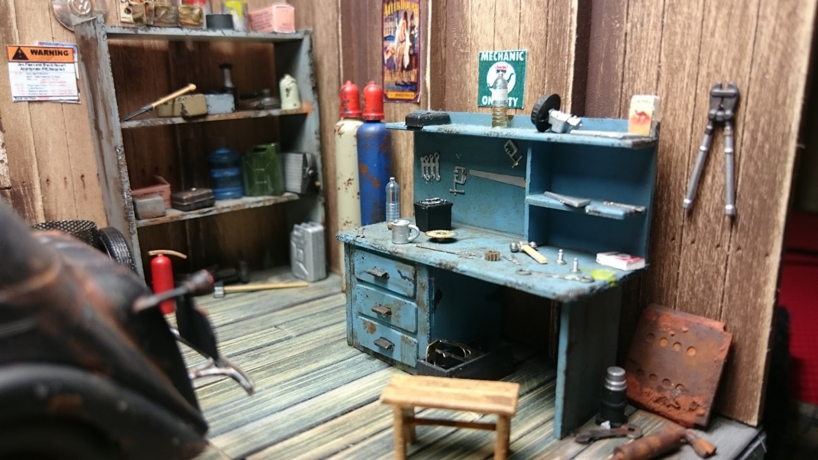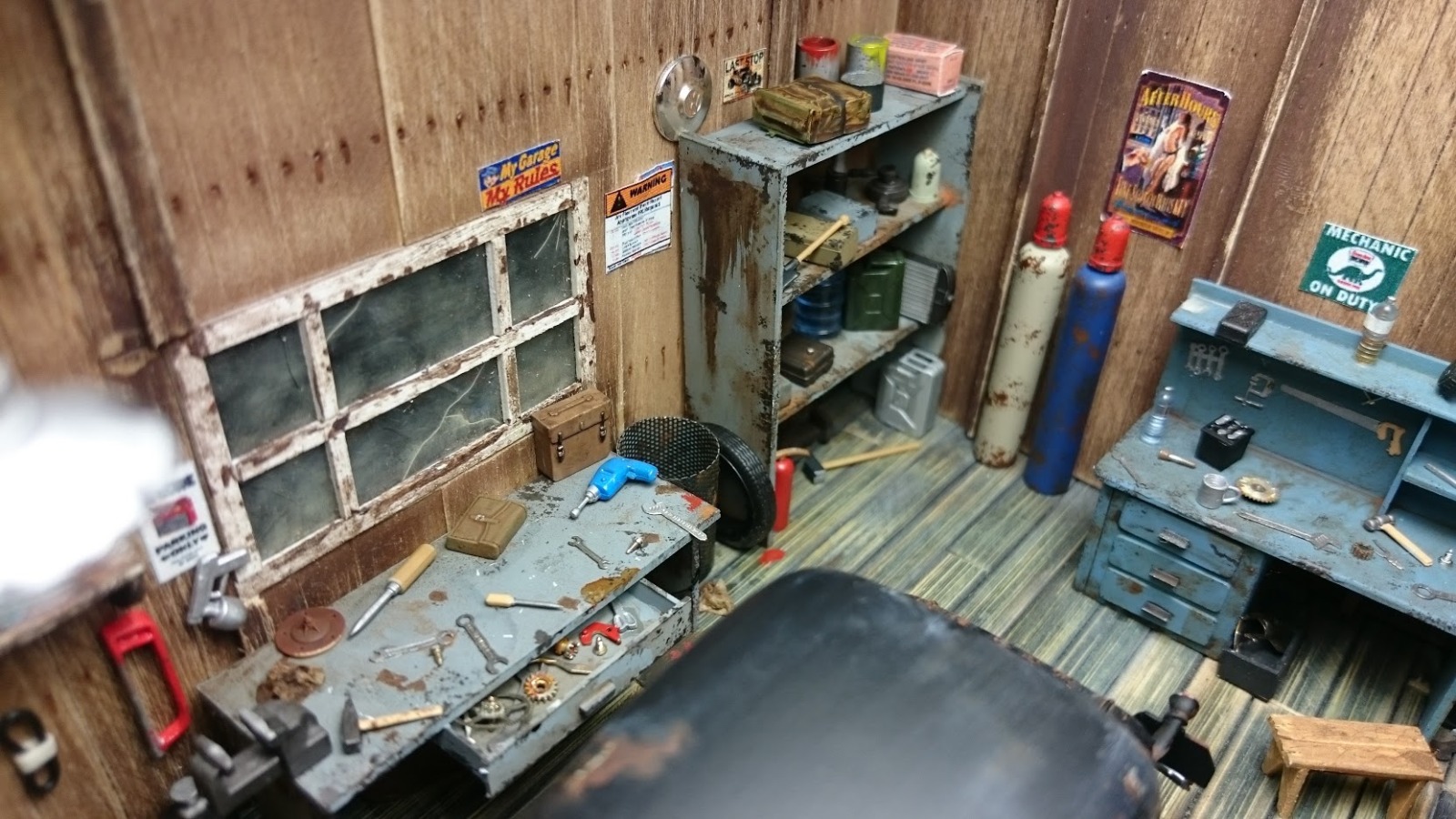 Отличная работа. Столько мелочевки. Круто. На баллонах, что стоят в углу, колпаки вроде должны быть одного цвета с баллоном. Для такой мастерской я бы добавил смотровую яму, но это мое мнение.