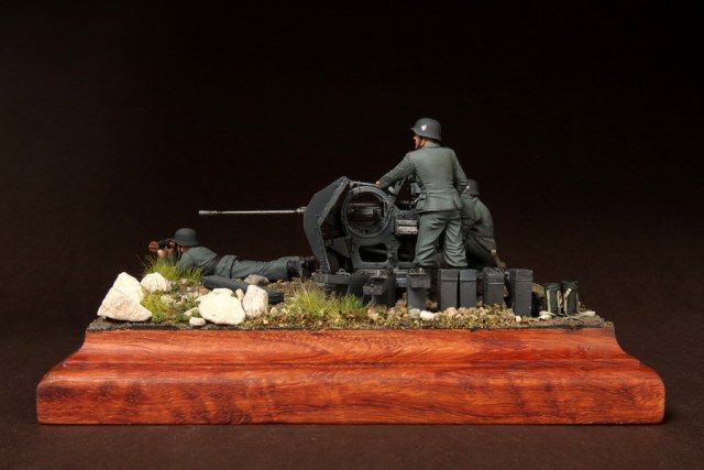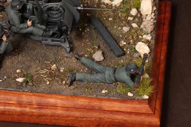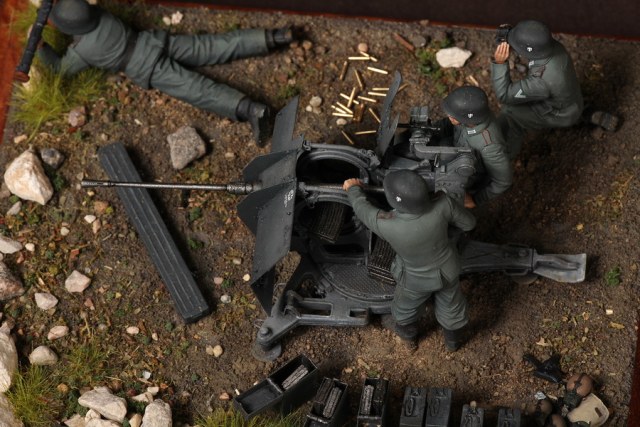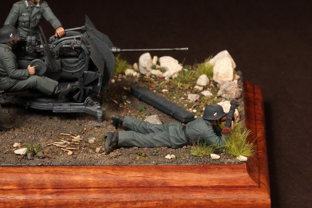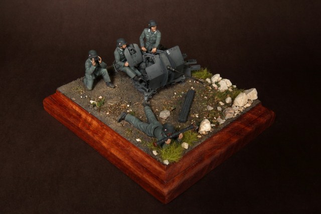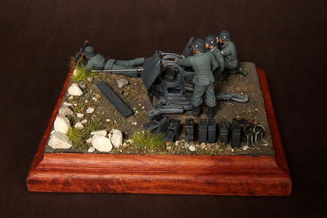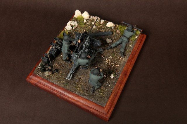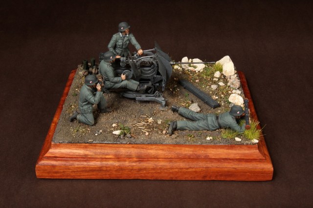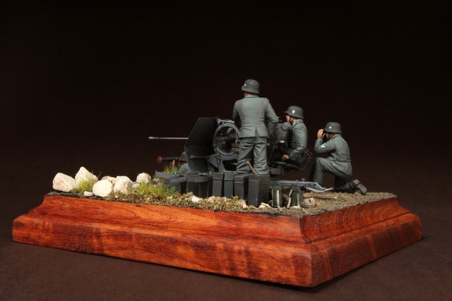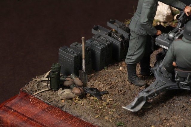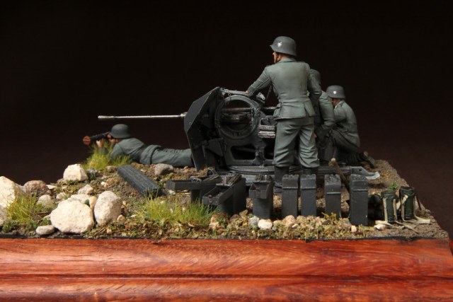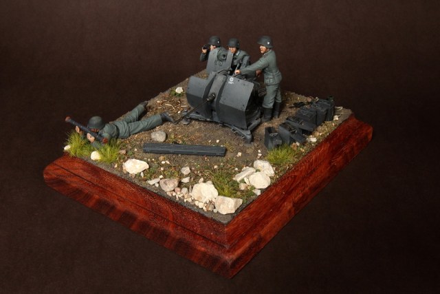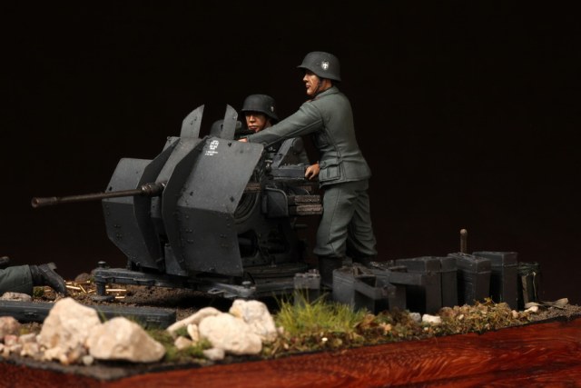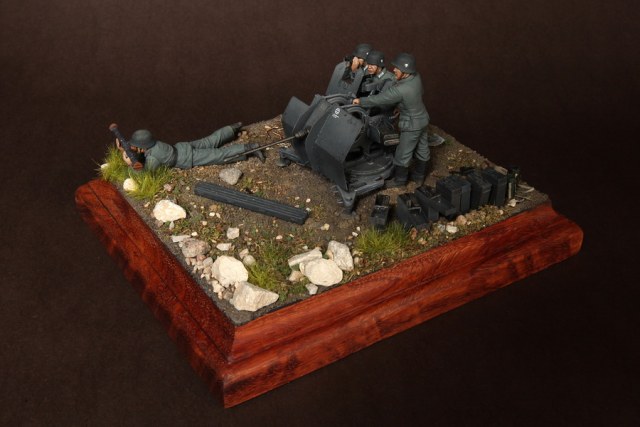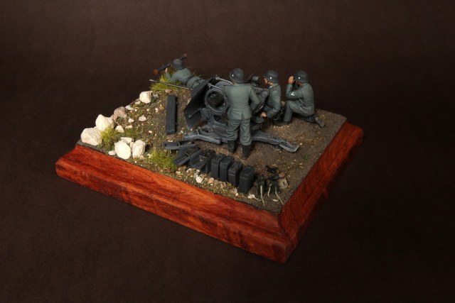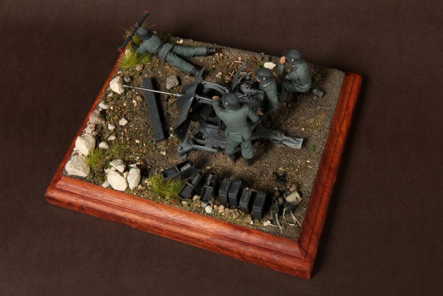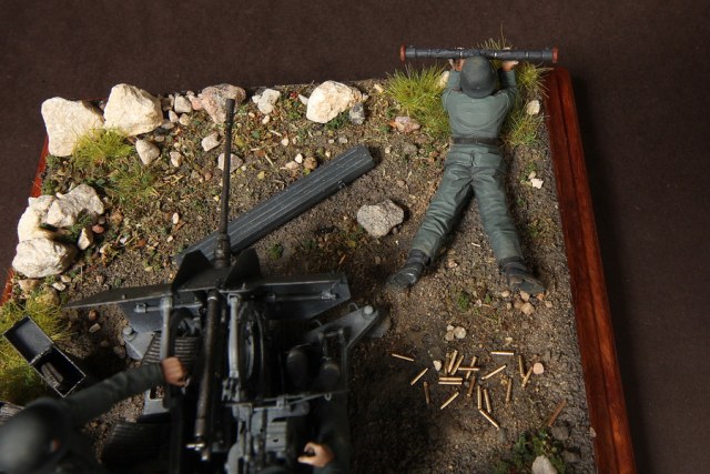 В диораме использованы фигуры SOGA Miniatures, зенитка Dragon (6288), на неё установлен почти полный комплект фототравления Griffon, ящики с обоймами травлёные от VoyagerModel и смоляные от Royal Model, снаряжение зенитчиков в углу диорамы драгоновское с травлёнкой от Alliance Model Works, гильзы от RB Model. Зенитка окрашена красками и химией АК Interactive, фигуры акрилом. Декали на фигурах Archer и Alliance Model Works . Диорамные аксессуары от Reality in Scale.