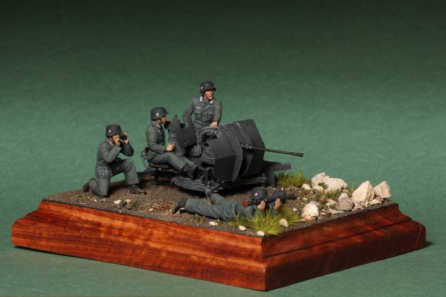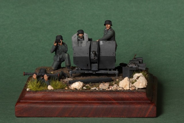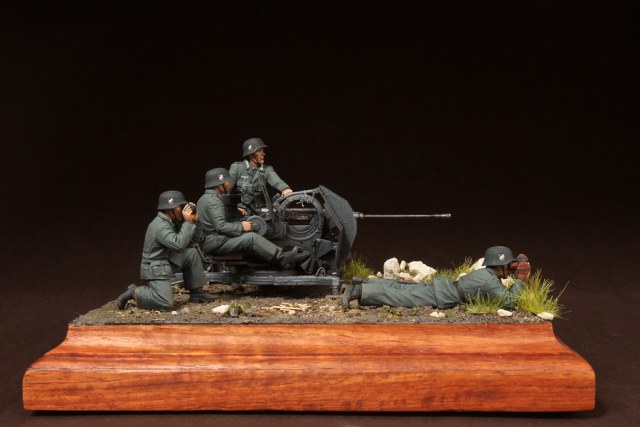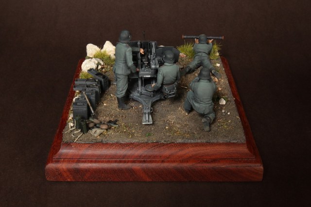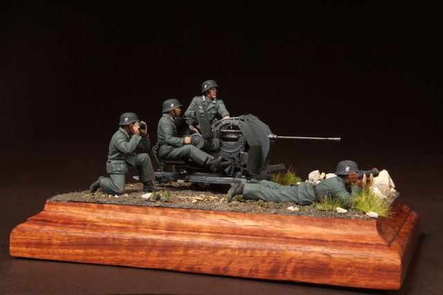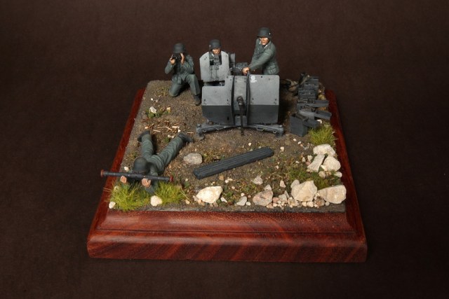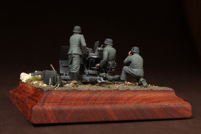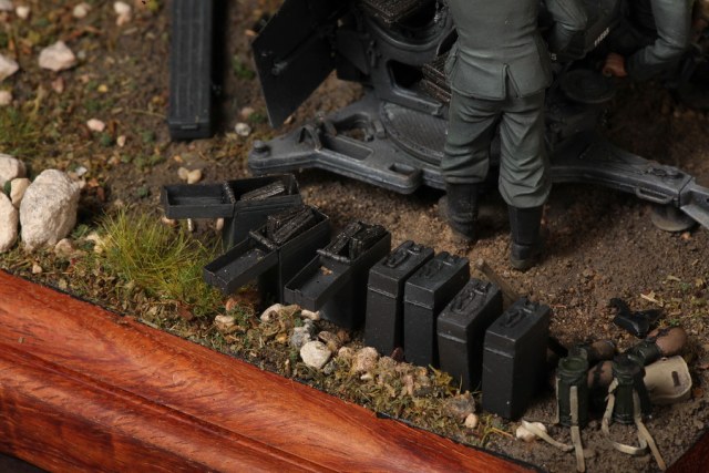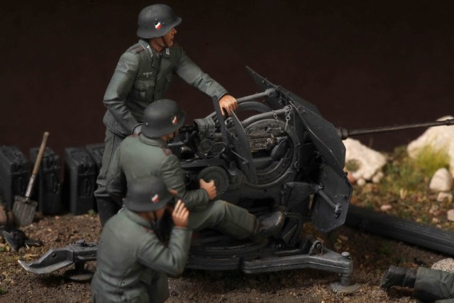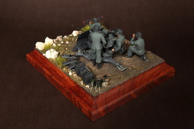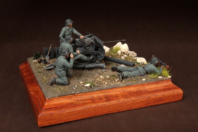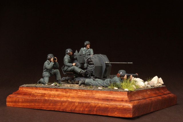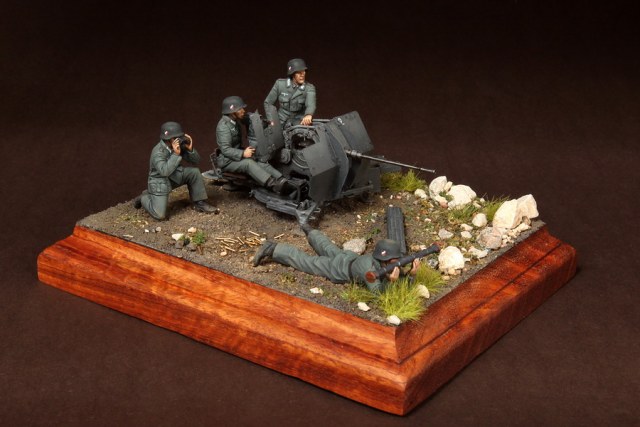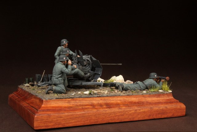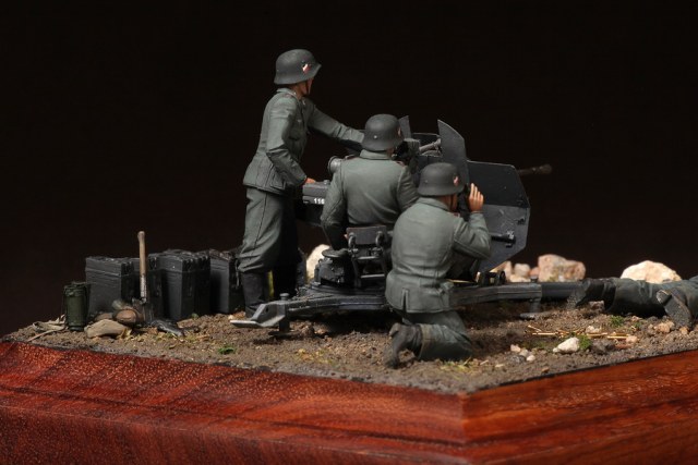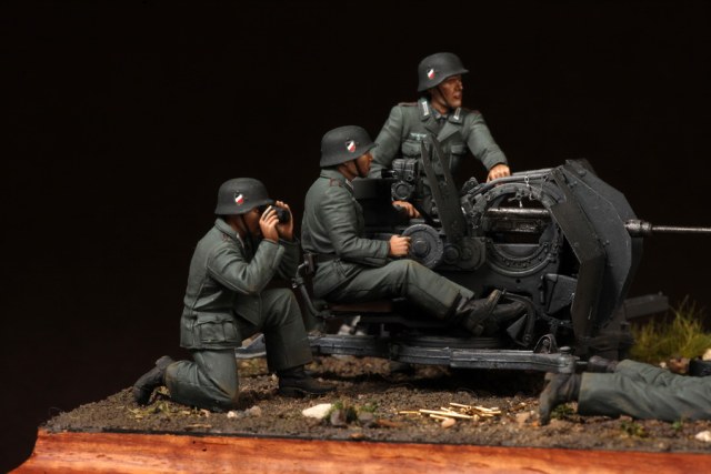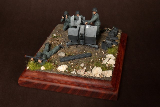 В диораме использованы фигуры SOGA Miniatures, зенитка Dragon (6288), на неё установлен почти полный комплект фототравления Griffon, ящики с обоймами травлёные от VoyagerModel и смоляные от Royal Model, снаряжение зенитчиков в углу диорамы драгоновское с травлёнкой от Alliance Model Works, гильзы от RB Model. Зенитка окрашена красками и химией АК Interactive, фигуры акрилом. Декали на фигурах Archer и Alliance Model Works . Диорамные аксессуары от Reality in Scale.