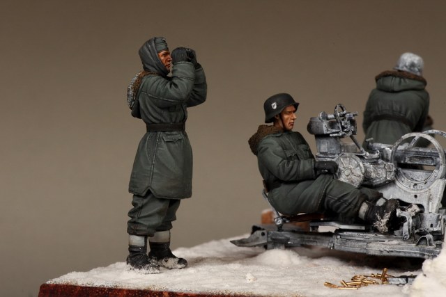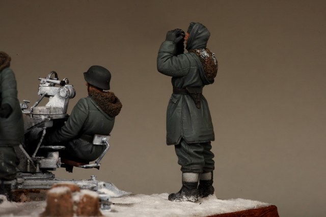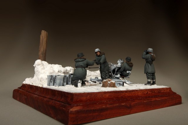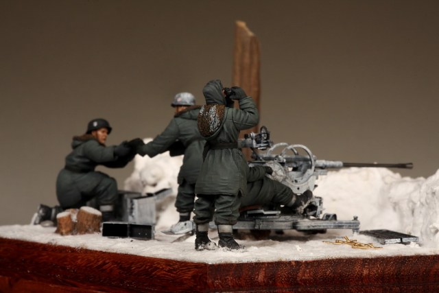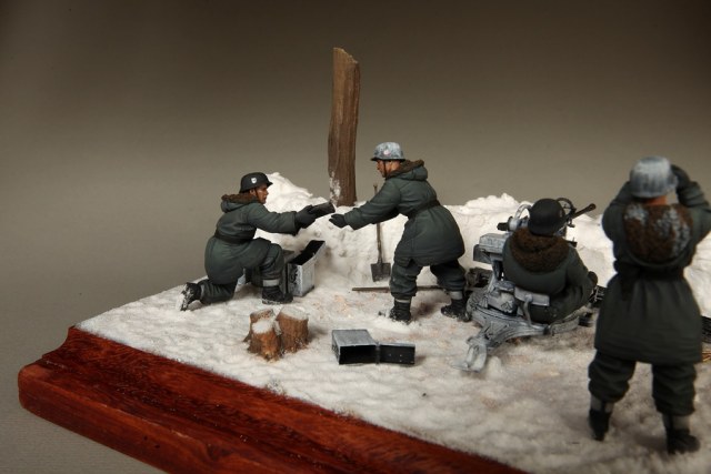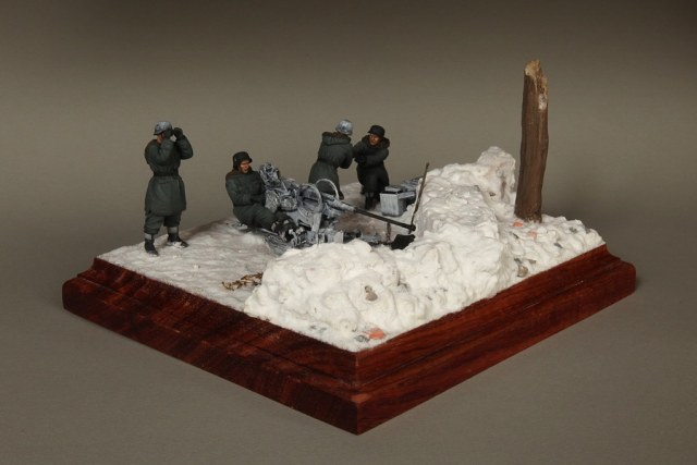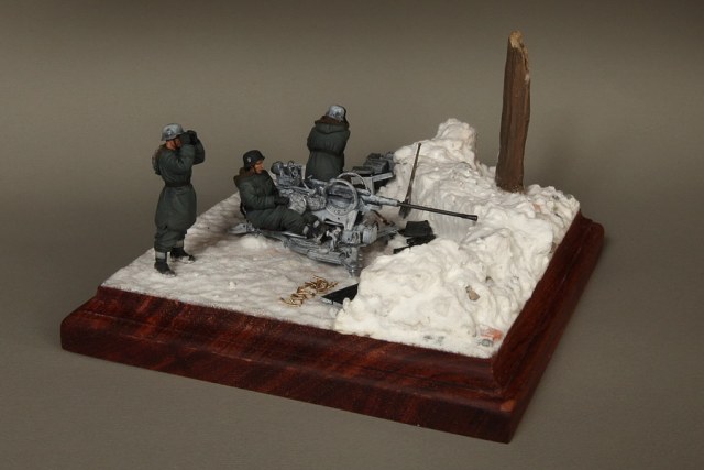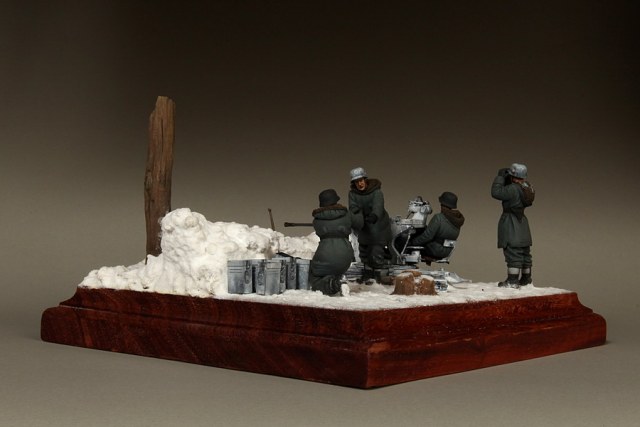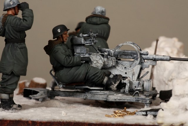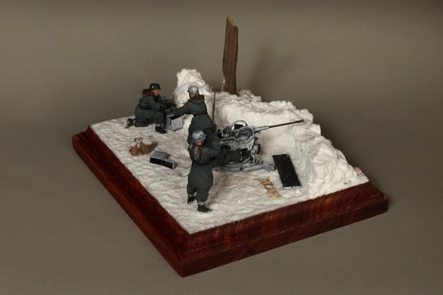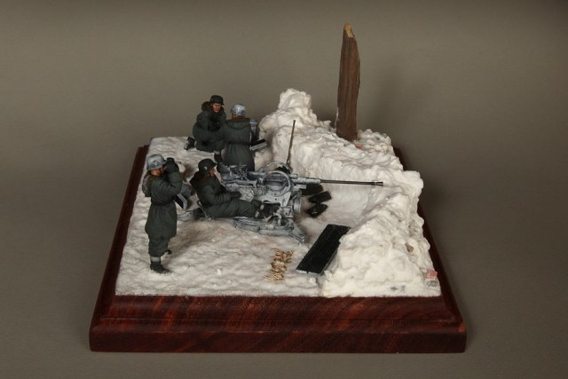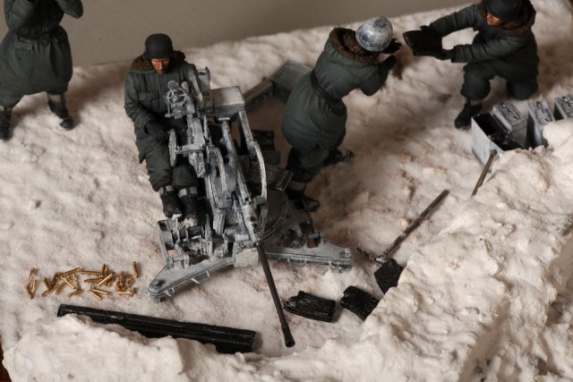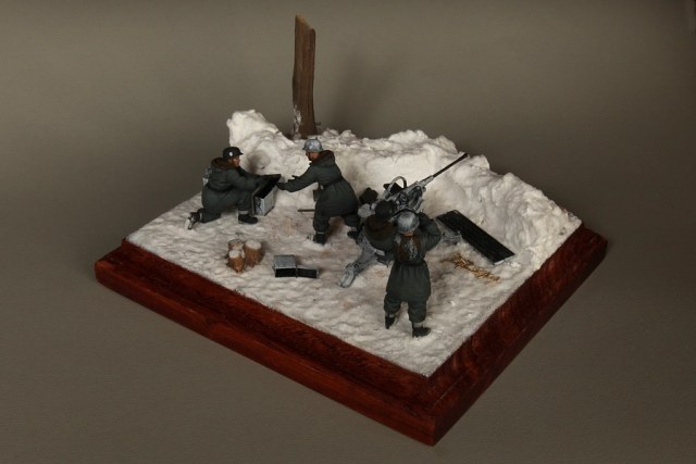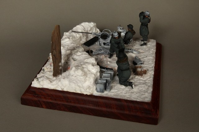 В диораме использованы фигуры SOGA Miniatures, зенитка Dragon (6546), немного травление Voyager, ящики с обоймами и травлёные от VoyagerModel и смоляные от Hauler, гильзы от RB Model, лопата и кирка попали в эту диораму от набора AFV Club. Зенитка окрашена красками и химией АК Interactive, фигуры акрилом. Снег сода и искусственный снег от Andrea. Диорамные аксессуары от Reality in Scale.