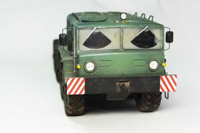 Теперь по модели. Изначально эта модель МАЗ-537 с прицепом ЧМЗ АП-52. Но до сборки трала еще далеко. Было куплено травление от Вояджера, но сделано далеко не всё. Из сделанного: бампер, все крылья, щетки стеклоочистителя, некоторые поручни, приборка, площадка под баки и ленты, которые из держат, опоры лебедки, кронштейны задних фонарей, воздухозаборники, обшивка дверей внутри, люк в крыше, зеркала и еще по мелочи. Фары Elf, колеса родные, окраска Mr. Color, смывка и пигменты Mig. По сборке трудностей не было. На этом все, спасибо за внимание!
