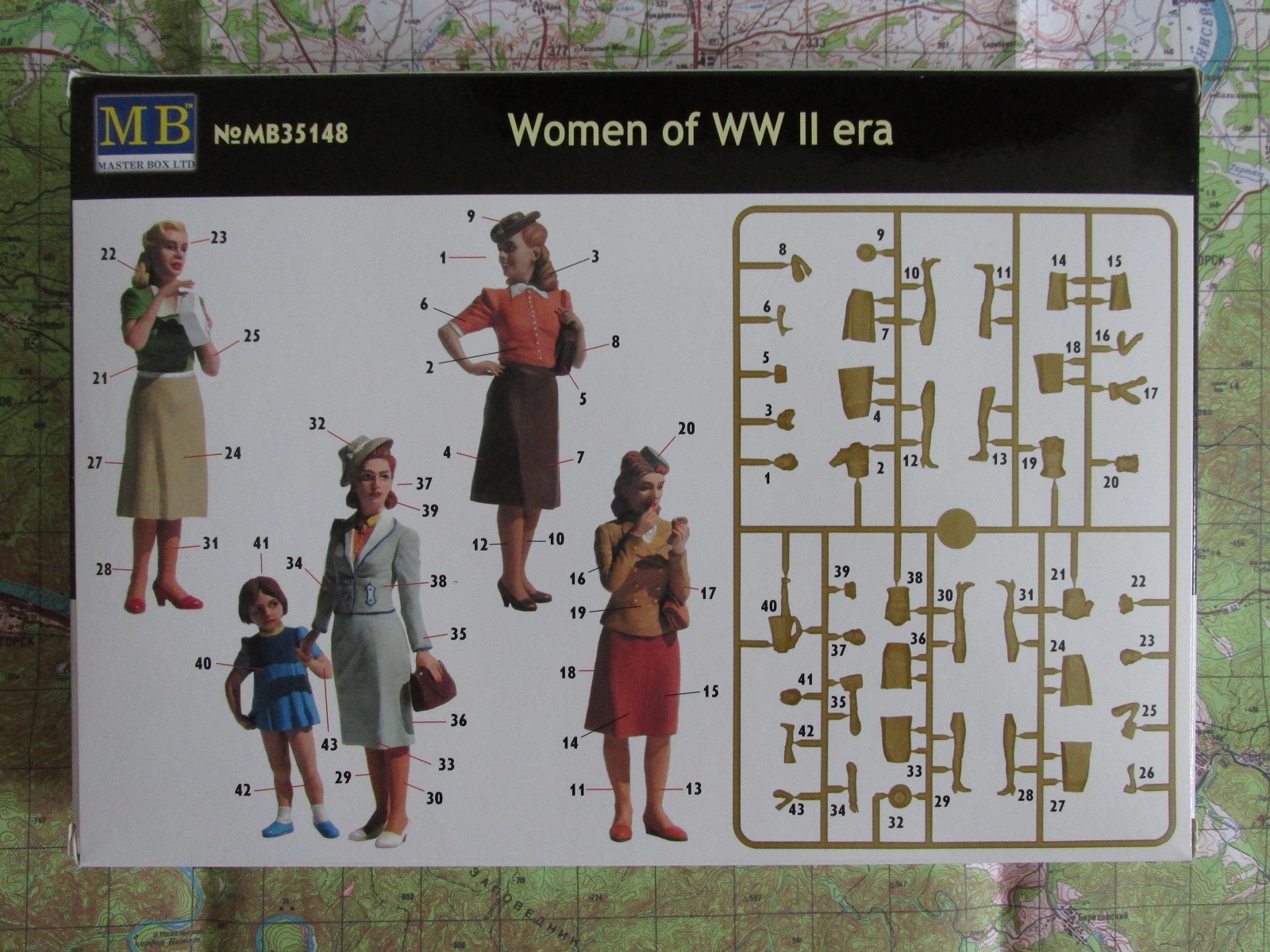 Вчера купил себе этот наборчик довольно известной в узких кругах фирмы))) артикул MB35148. Итак, передо мной коробка с боковой загрузкой, размер 250х175х35 мм. Оформление лицевой стороны у мастер бокса как всегда на высоте. На картинке три женщины 20-25 лет и ребёнок 4-7 лет, а на обороте показана схема литника с нумерацией деталей и схема сборки уже четырёх женщин и одного ребёнка. Она же может служить и схемой окраски, но так как фигурки изображают всё таки гражданских, то тут всё на усмотрение мастера. Так, теперь открываю коробочку, внутри пакет, в котором лежит один литник серого цвета, с деталями для сборки пяти фигур. Есть шов и мелкий облой, но не значительный и легко поправимый. Ну а теперь самое главное в этом обзоре. Наконец то у мастер бокс начали получаться женские лица. Особенно получилось на отлично лицо девочки ребёнка и женщины, держащая её за руку. У остальных всё же надо лицо слегка "омолодить", но по сравнению с предыдущими, разница есть. Ну и на последок. Хоть и позиционируется на период второй мировой где то в штатах или в западной европе, но при желании можно сделать и более поздний период. всем приятного просмотра.