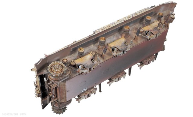 - Сборка корпуса и ходовых тележек, которые в «рабочем» положении принимали вид подвески с обратным развалом, как у дрифт-каров.
