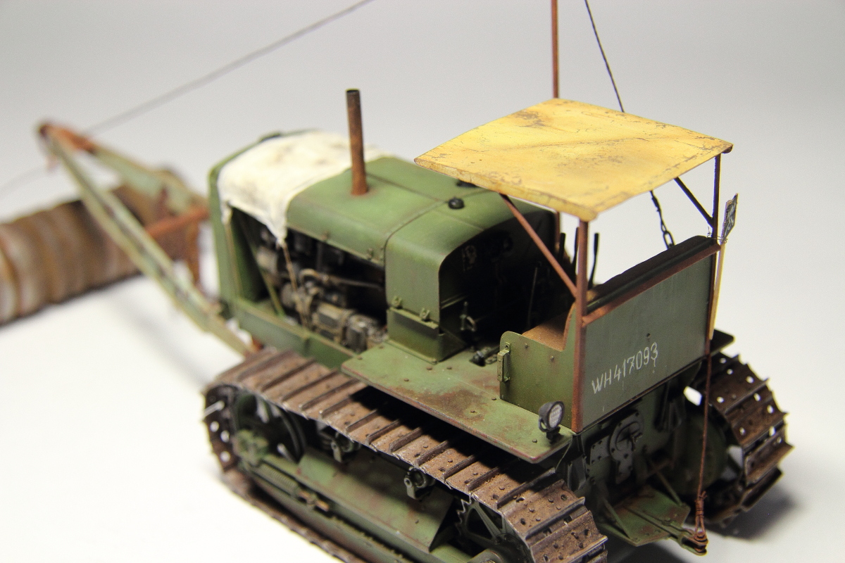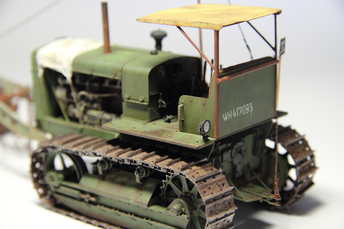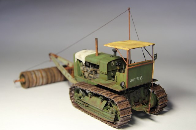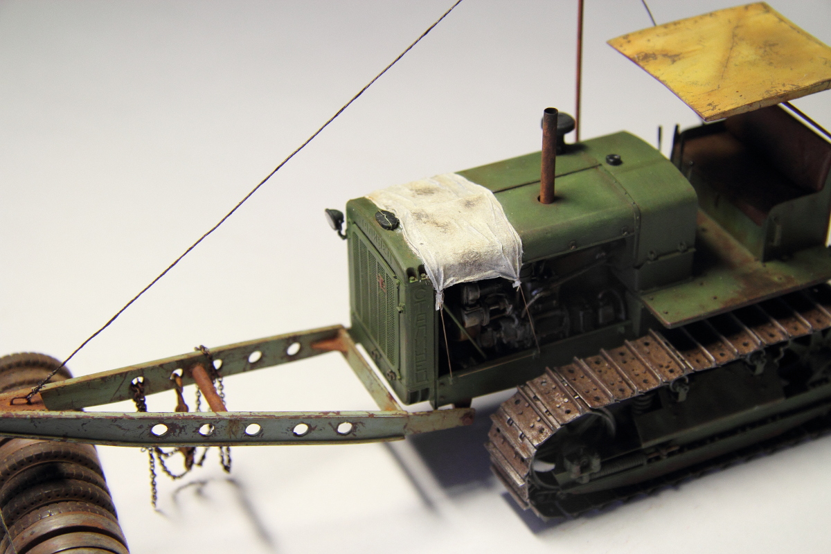 По приезду кинулся собирать, но остановило отсутствие двигателя и неправильное название на радиаторе. Заказал два набора L.Z.Models, двигатель и радиатор. Потом была пауза с год, а потом как будто второе дыхание открылось. Работа с моделью спорилась, все получалось и примерно за пару месяцев я довел ее до покраски. Вообще идея с минным тралом появилась после увиденной работы в сети, до этого занимался поиском сельскохозяйственных вариантов трактора. Варианты были, но обычно все это заканчивалось схемами, рисунками, парой тройкой фотографий, поэтому я остановился на минном трале. Фотография этого тральщика была одна, и обзавелся я ей уже к окончанию стройки. Увиденное меня обескуражило, трактор был с кабиной. Сил на переделку уже просто не оставалось, оставил так как есть.