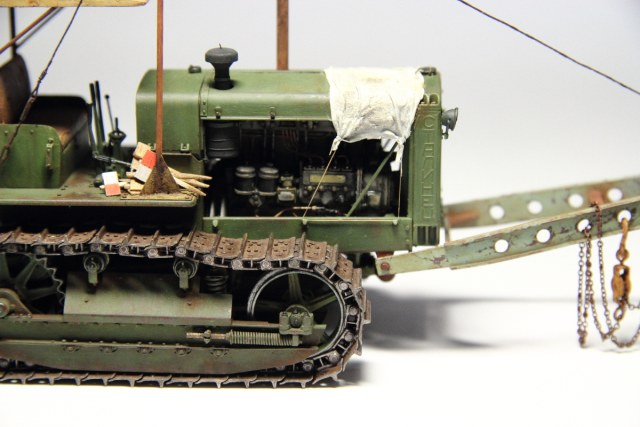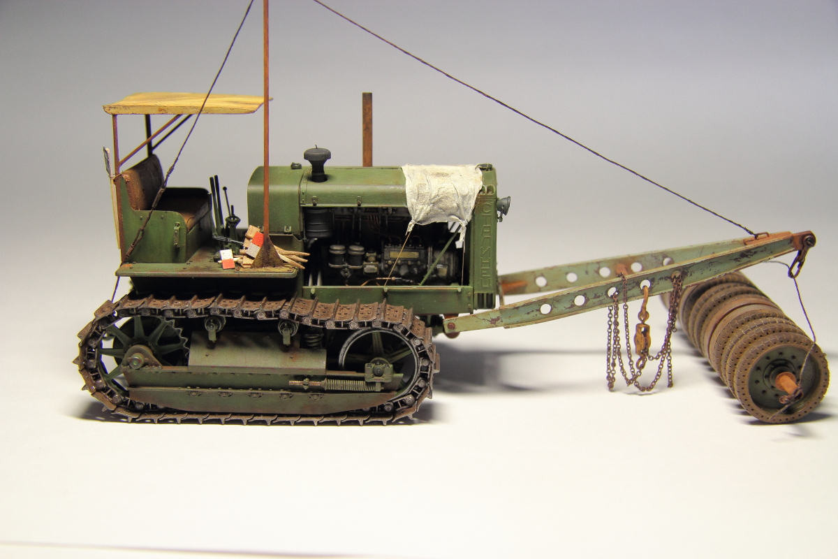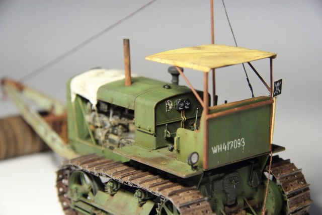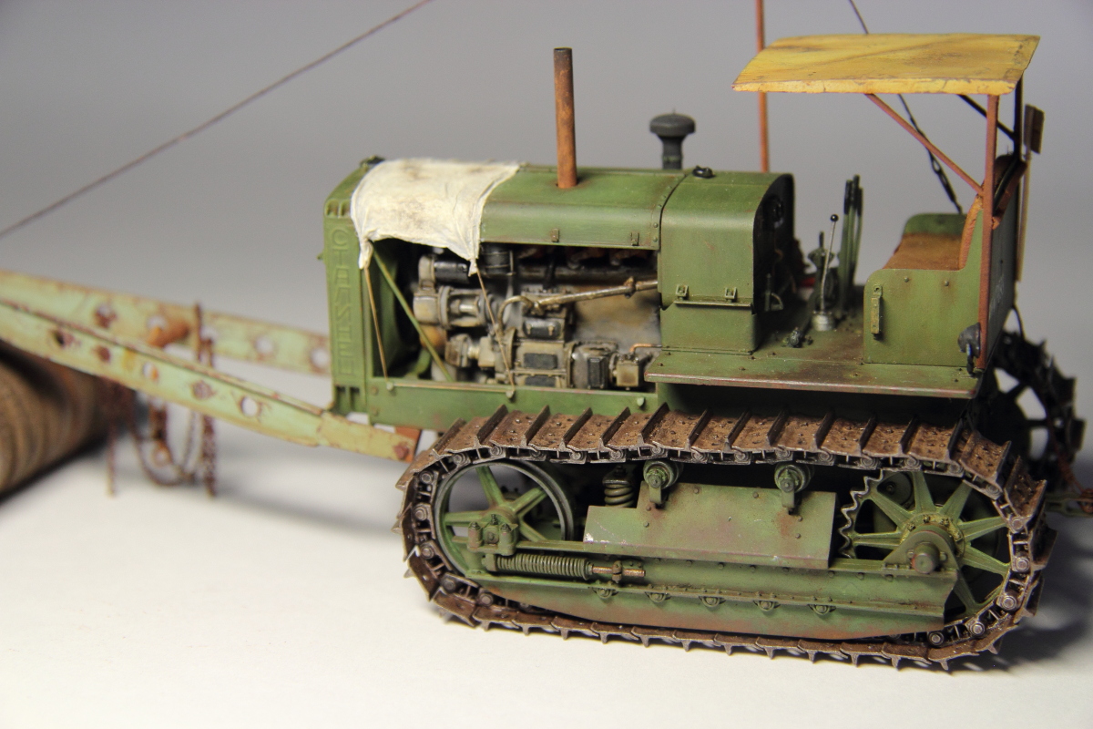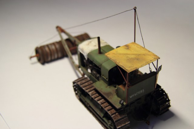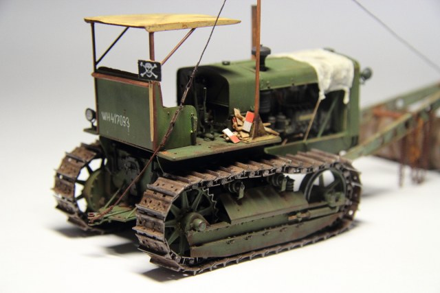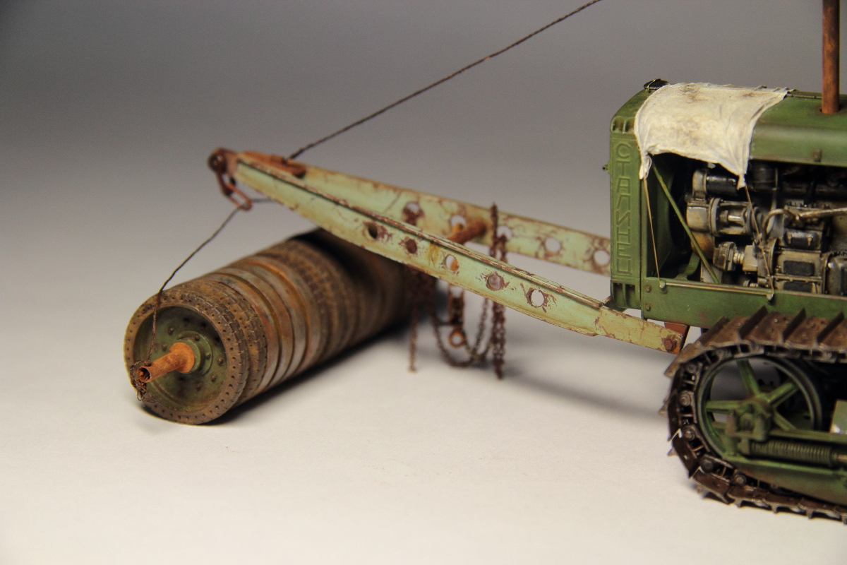 По приезду кинулся собирать, но остановило отсутствие двигателя и неправильное название на радиаторе. Заказал два набора L.Z.Models, двигатель и радиатор. Потом была пауза с год, а потом как будто второе дыхание открылось. Работа с моделью спорилась, все получалось и примерно за пару месяцев я довел ее до покраски. Вообще идея с минным тралом появилась после увиденной работы в сети, до этого занимался поиском сельскохозяйственных вариантов трактора. Варианты были, но обычно все это заканчивалось схемами, рисунками, парой тройкой фотографий, поэтому я остановился на минном трале. Фотография этого тральщика была одна, и обзавелся я ей уже к окончанию стройки. Увиденное меня обескуражило, трактор был с кабиной. Сил на переделку уже просто не оставалось, оставил так как есть.
