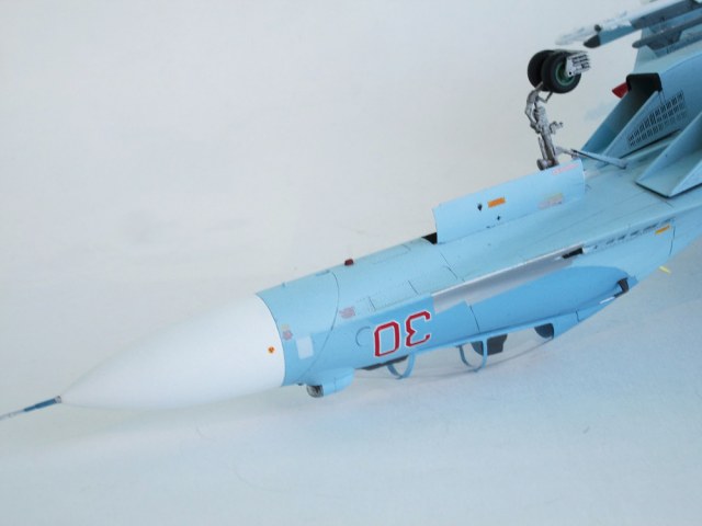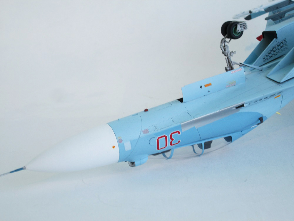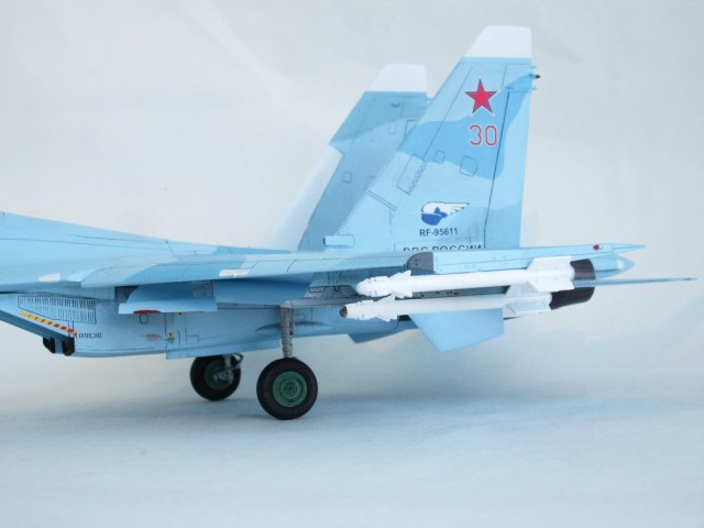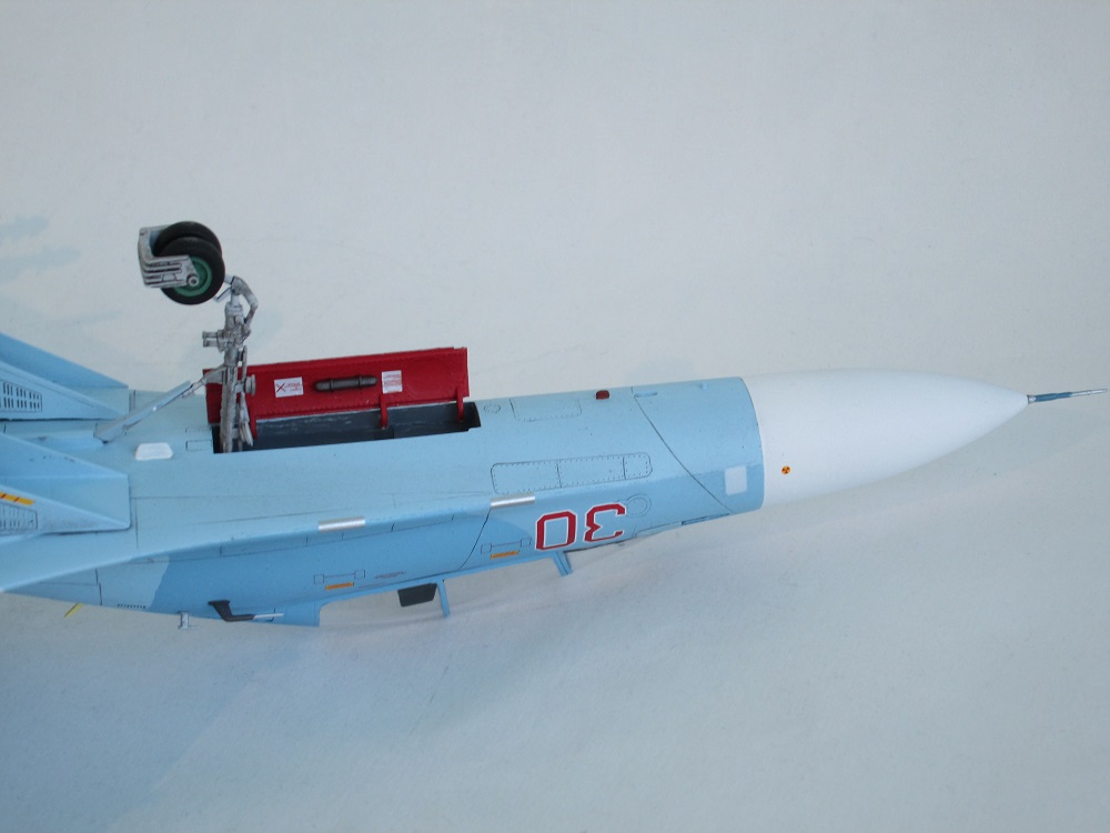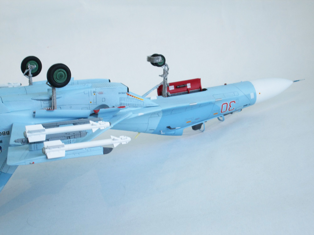 Что собой представляет данный набор выпущенный в 2014 году , собственно старый Су-27 УБ дополненный новыми литниками с деталями характерным конструктивными изменениями в конструкции планера, это носовая часть со смещенным к правому борту ОЛС, штанги дозаправки топливом. На кили данный производитель не стал замарачиватся и оставил их старыми, хотя они имеют совсем другую форму.