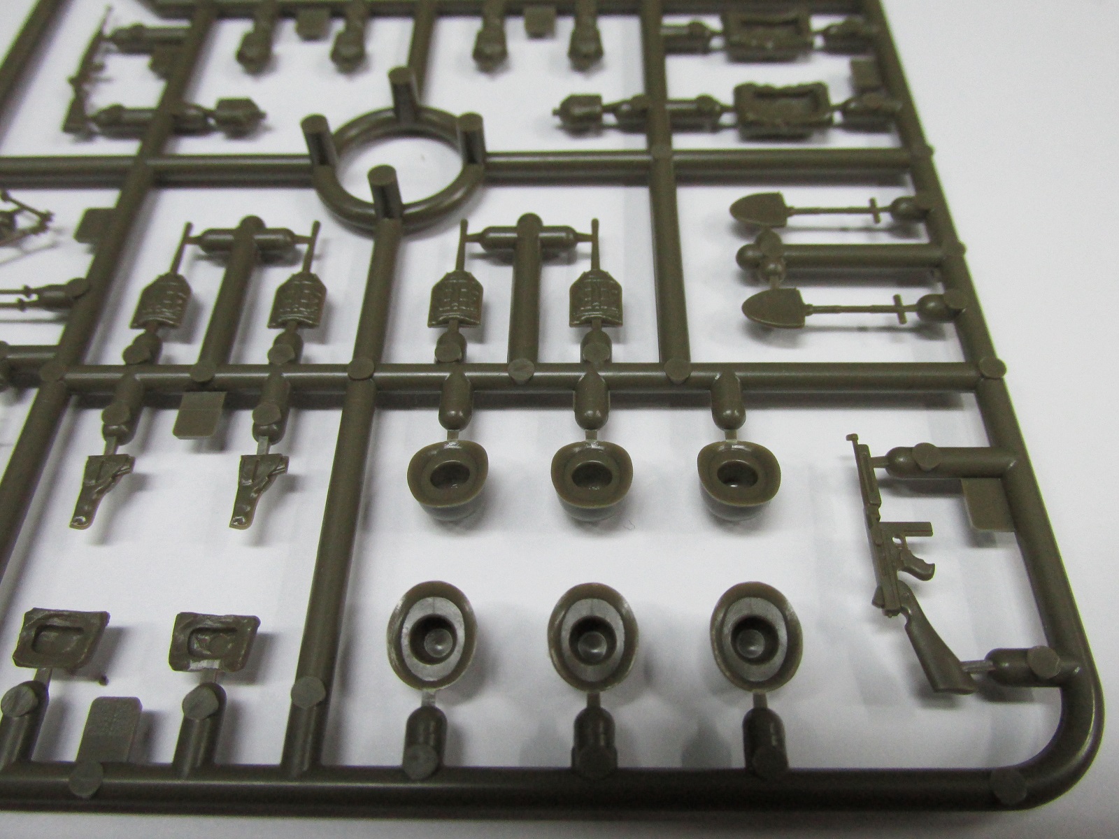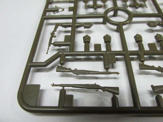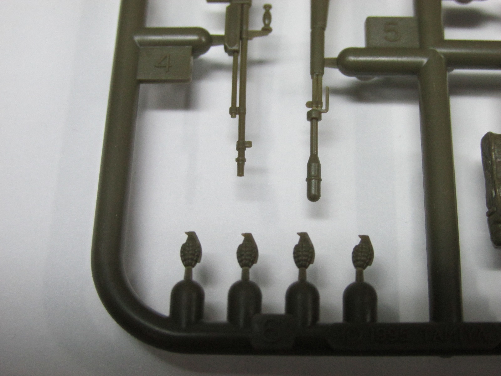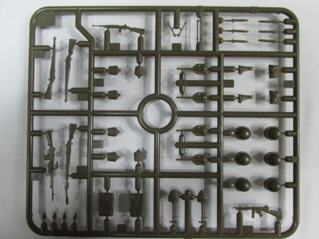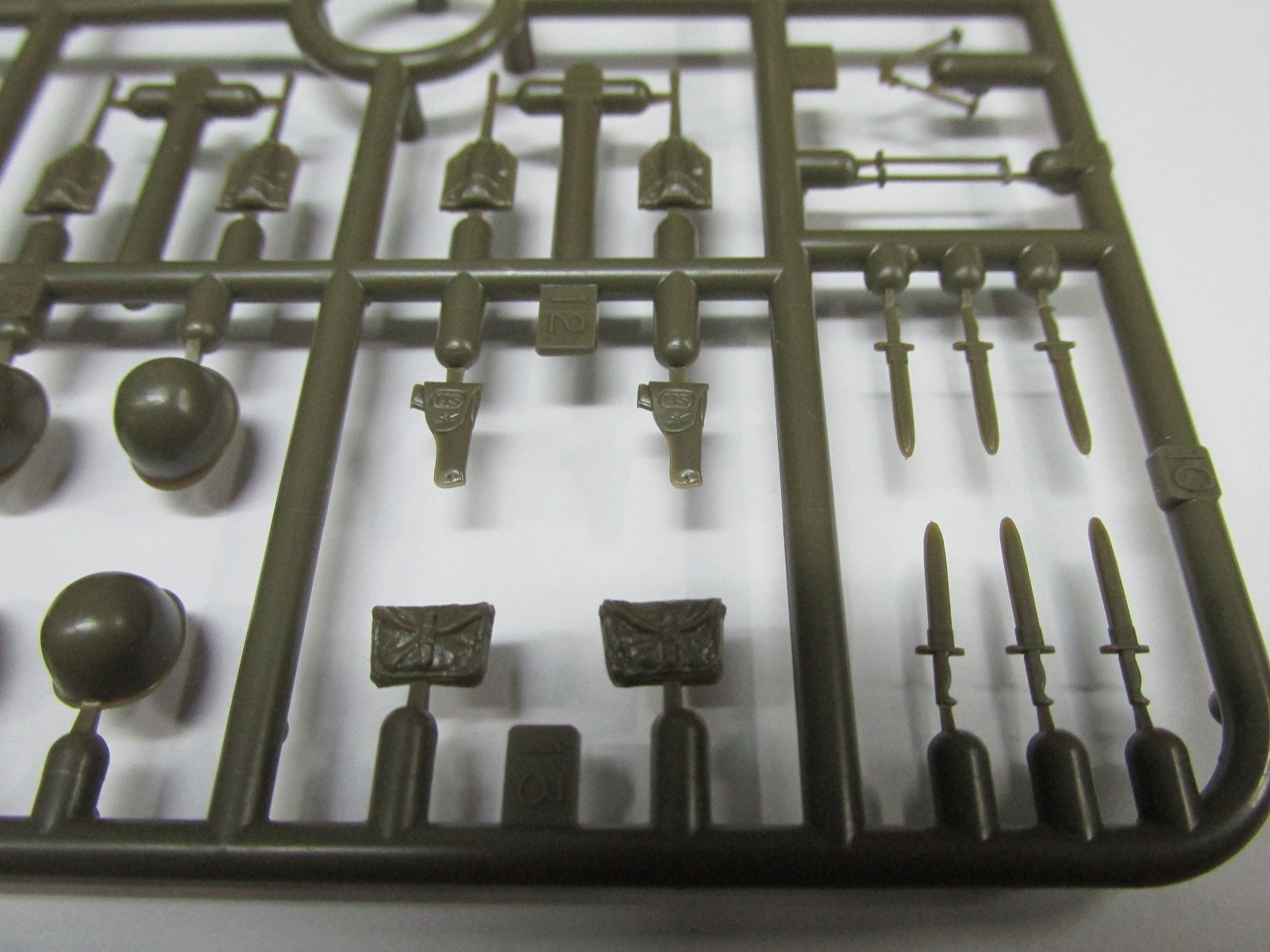 Купил два года назад, артикул 35206. Небольшой полиэтиленовый пакет, в который упакован один литник тёмно – зелёного цвета и один листик с инструкцией на обеих сторонах. Утяжин и недоливов нет. Местами облой и шов, но всё легко поправимо. Инструкция на английском и японском, но при этом информативна и всё понятно. На литнике расположены: шесть шлемов Mk1, шесть боевых ножей M3, шесть стандартных фляг в чехле (последующие модификации стоят на вооружении до сих пор). Шесть лопат, четыре в чехле M1943, крепящиеся на пояс и две, крепящиеся к рюкзаку M1910, два рюкзака M1928 (особенно популярные среди рейнджеров, так как они более удобны на долгих маршах) и к ним два накладных подсумка, две кобуры с пистолетом Кольт 1911 и четыре ручных гранаты Mk-II. Из вооружения Пистолет – пулемёт Томпсона M1A1 (по инструкции или как вариант M1) с магазином на 20 патронов и без дульного компенсатора. Карабин M1, Винтовка M1 с надствольной гранатой. Две винтовки “Гаранд”. Винтовка BARM1918A2, к ней два варианта сошек (сложенные и разложенные), но на фотографиях 2МВ эта винтовка часто без сошек. Так как она достаточно тяжёлая, что бы хоть как то уменьшить вес, сошки часто “терялись”, иногда их использовали для пулемёта Браунинга “30-го” калибра с воздушных охлаждением M1919A4,