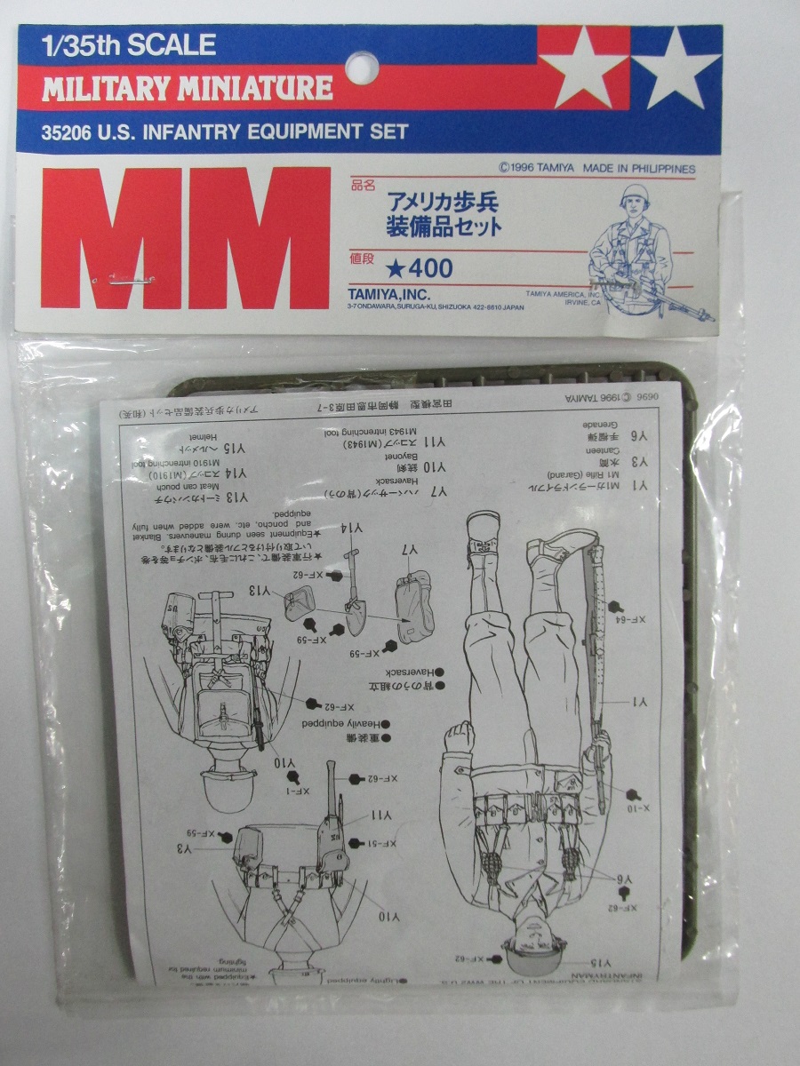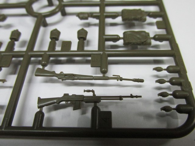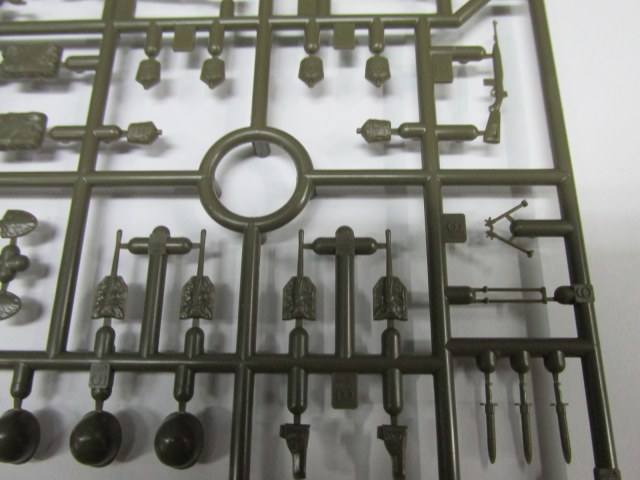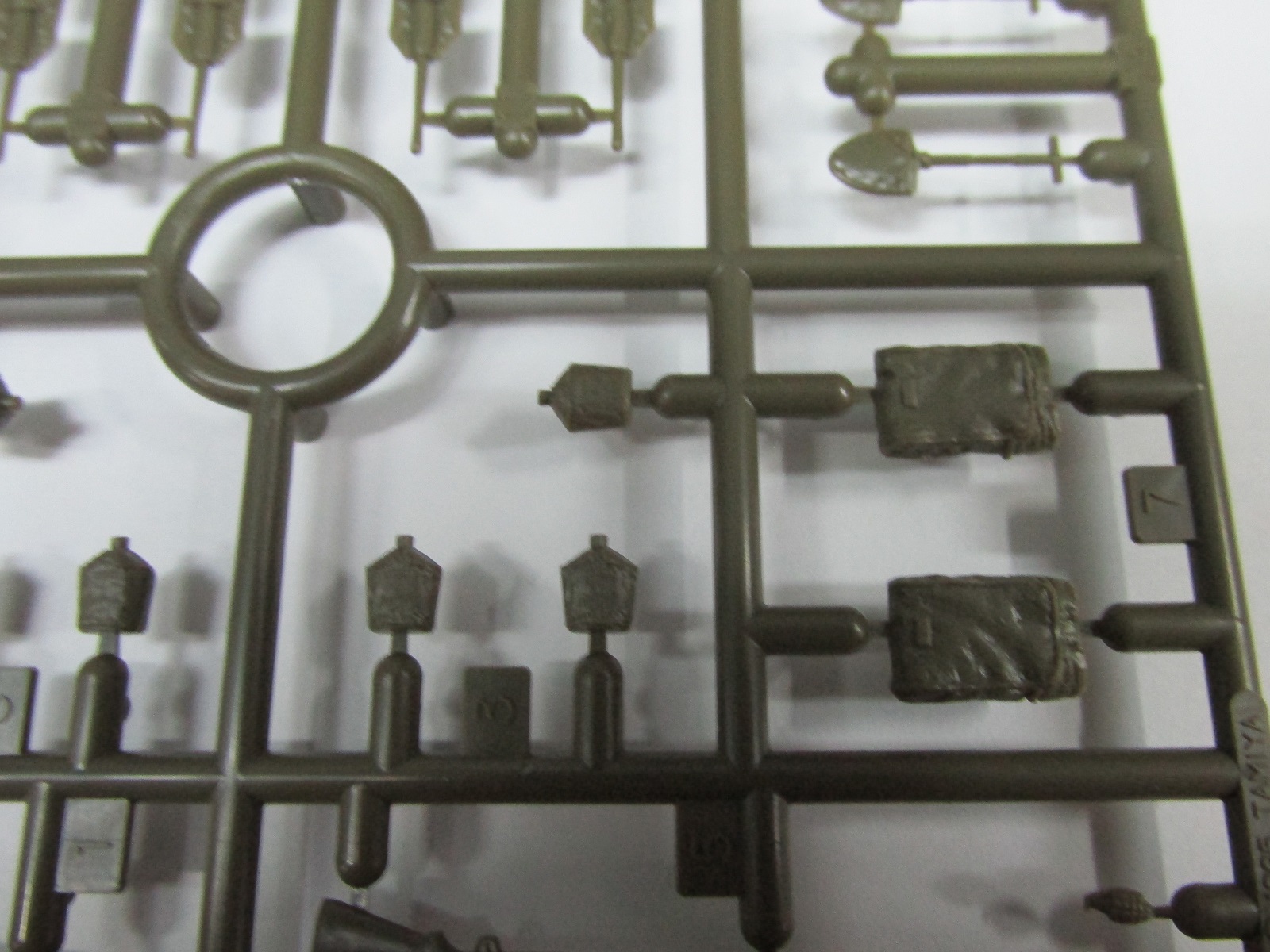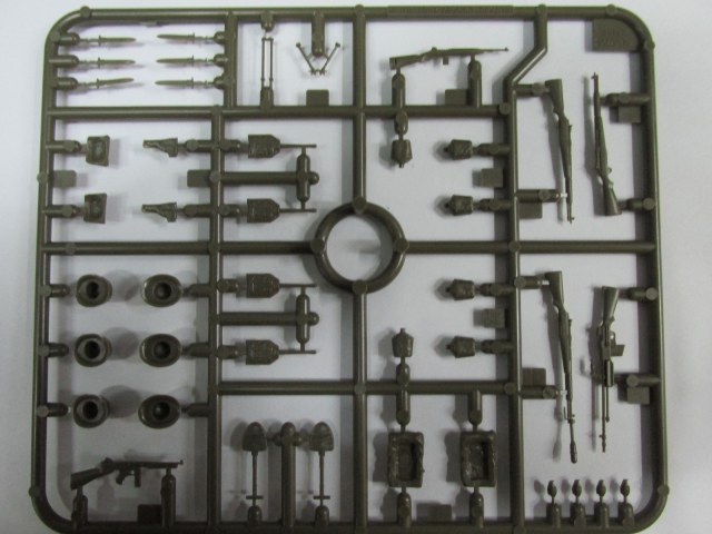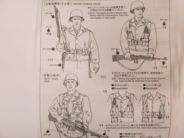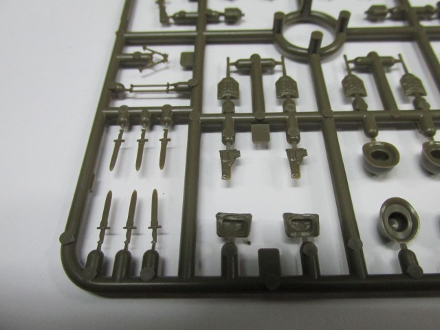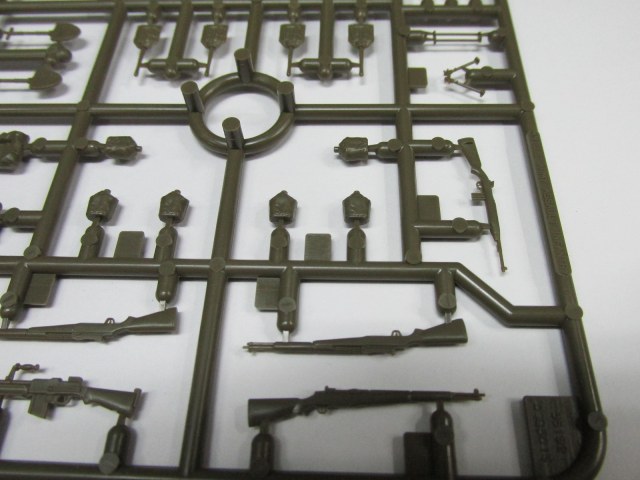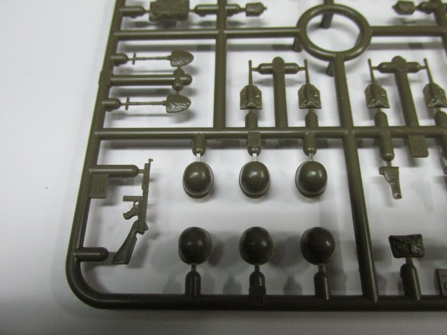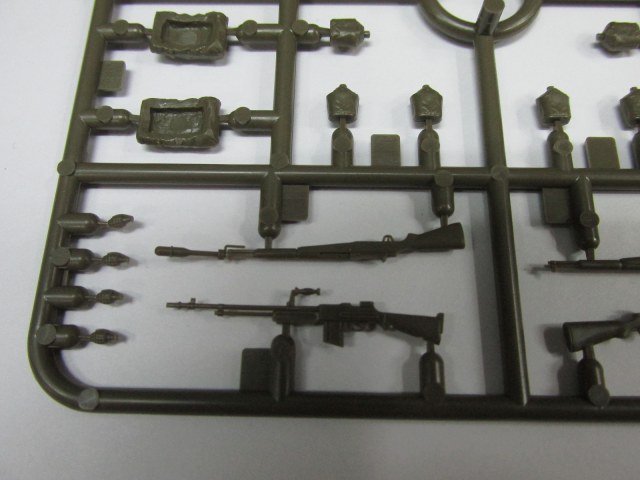 Купил два года назад, артикул 35206. Небольшой полиэтиленовый пакет, в который упакован один литник тёмно – зелёного цвета и один листик с инструкцией на обеих сторонах. Утяжин и недоливов нет. Местами облой и шов, но всё легко поправимо. Инструкция на английском и японском, но при этом информативна и всё понятно. На литнике расположены: шесть шлемов Mk1, шесть боевых ножей M3, шесть стандартных фляг в чехле (последующие модификации стоят на вооружении до сих пор). Шесть лопат, четыре в чехле M1943, крепящиеся на пояс и две, крепящиеся к рюкзаку M1910, два рюкзака M1928 (особенно популярные среди рейнджеров, так как они более удобны на долгих маршах) и к ним два накладных подсумка, две кобуры с пистолетом Кольт 1911 и четыре ручных гранаты Mk-II. Из вооружения Пистолет – пулемёт Томпсона M1A1 (по инструкции или как вариант M1) с магазином на 20 патронов и без дульного компенсатора. Карабин M1, Винтовка M1 с надствольной гранатой. Две винтовки “Гаранд”. Винтовка BARM1918A2, к ней два варианта сошек (сложенные и разложенные), но на фотографиях 2МВ эта винтовка часто без сошек. Так как она достаточно тяжёлая, что бы хоть как то уменьшить вес, сошки часто “терялись”, иногда их использовали для пулемёта Браунинга “30-го” калибра с воздушных охлаждением M1919A4,
