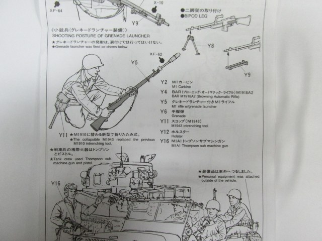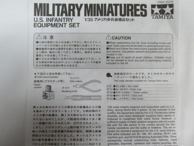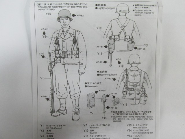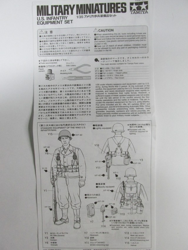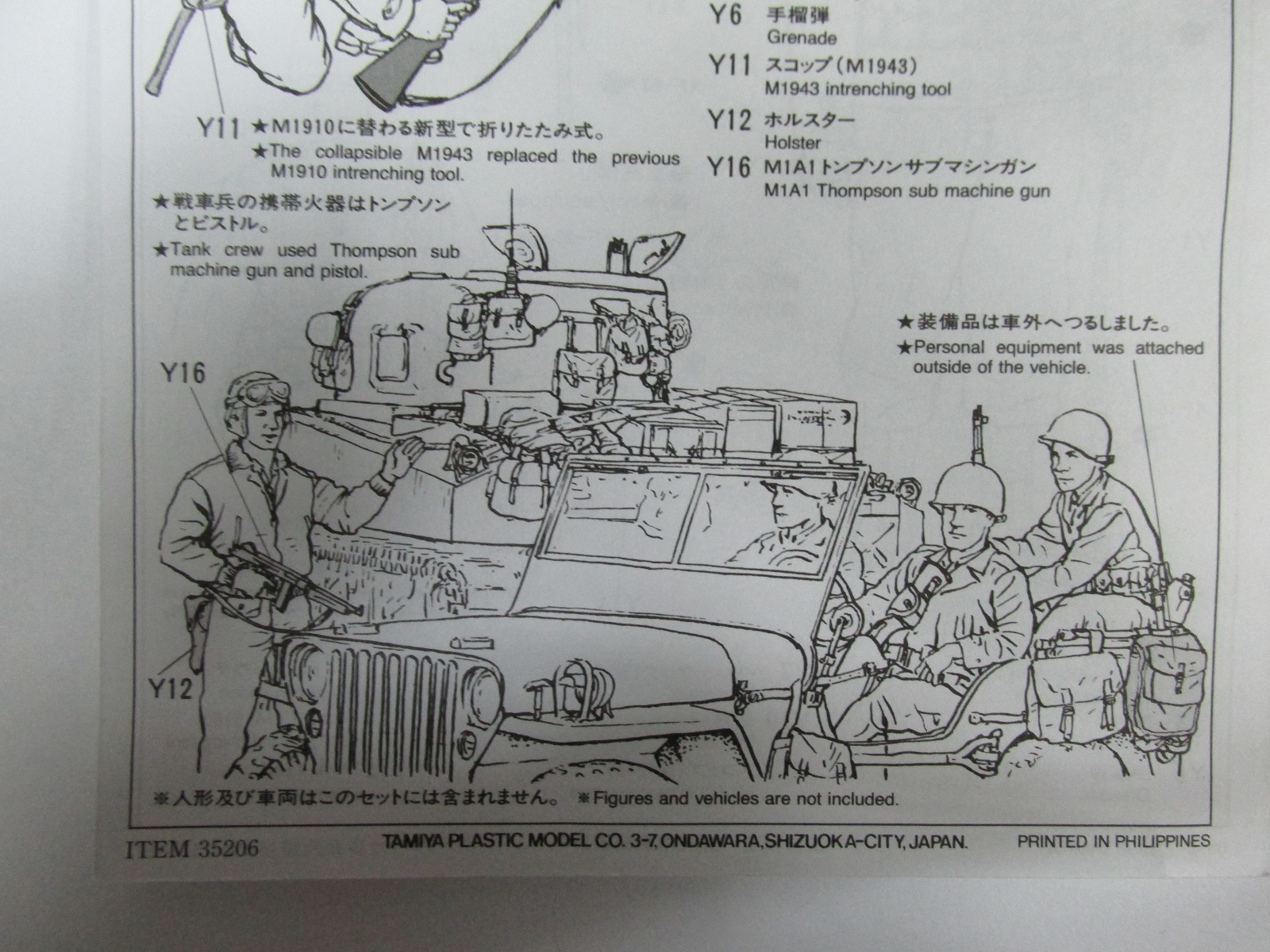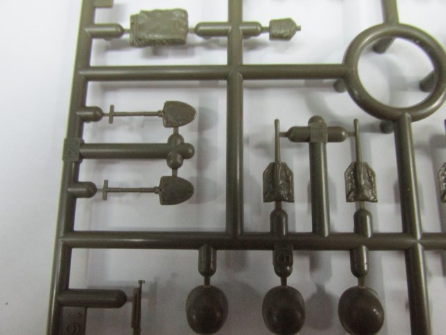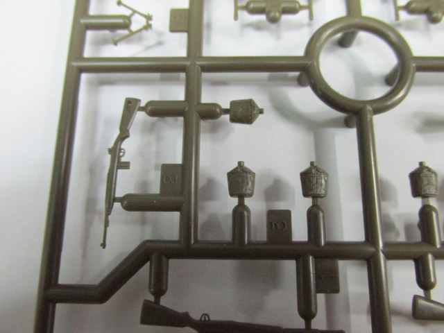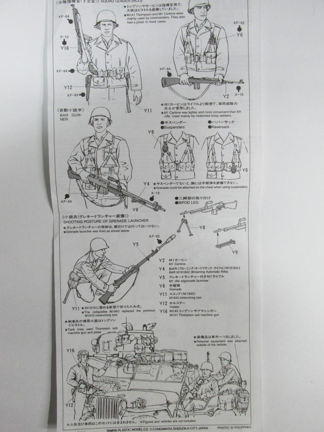 Купил два года назад, артикул 35206. Небольшой полиэтиленовый пакет, в который упакован один литник тёмно – зелёного цвета и один листик с инструкцией на обеих сторонах. Утяжин и недоливов нет. Местами облой и шов, но всё легко поправимо. Инструкция на английском и японском, но при этом информативна и всё понятно. На литнике расположены: шесть шлемов Mk1, шесть боевых ножей M3, шесть стандартных фляг в чехле (последующие модификации стоят на вооружении до сих пор). Шесть лопат, четыре в чехле M1943, крепящиеся на пояс и две, крепящиеся к рюкзаку M1910, два рюкзака M1928 (особенно популярные среди рейнджеров, так как они более удобны на долгих маршах) и к ним два накладных подсумка, две кобуры с пистолетом Кольт 1911 и четыре ручных гранаты Mk-II. Из вооружения Пистолет – пулемёт Томпсона M1A1 (по инструкции или как вариант M1) с магазином на 20 патронов и без дульного компенсатора. Карабин M1, Винтовка M1 с надствольной гранатой. Две винтовки “Гаранд”. Винтовка BARM1918A2, к ней два варианта сошек (сложенные и разложенные), но на фотографиях 2МВ эта винтовка часто без сошек. Так как она достаточно тяжёлая, что бы хоть как то уменьшить вес, сошки часто “терялись”, иногда их использовали для пулемёта Браунинга “30-го” калибра с воздушных охлаждением M1919A4,