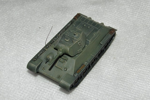 Добавил самодельную фару, и антенну. Антенна кривая из тянутой лески пока не сумел подобрать лучший вариант. Рассверлил выхлопные патрубки и ствол пушки, поставил пулемет из проволочки. Больше доработок никаких вроде нет. Покрасил шанцевый инструмент, да и все, ибо в масштабе 1/100 сложно выполнять глубокие доработки. Надеюсь корифеи не побьют меня камнями за то, что выкладываю Т-34 :)