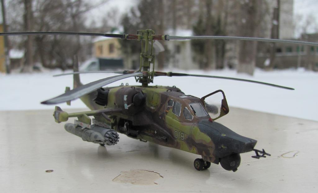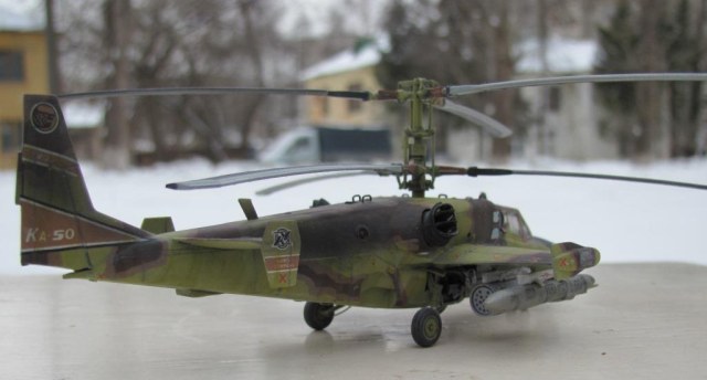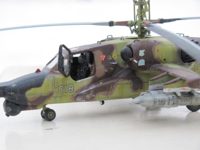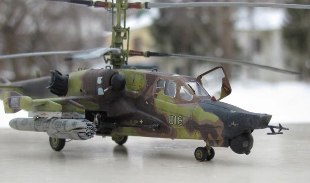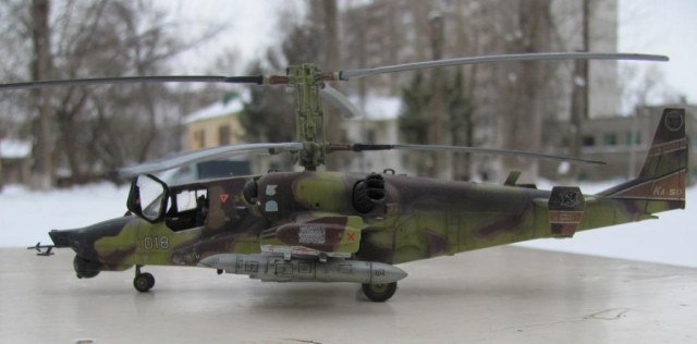 Хорошо известная модель от Звезды, переделал носовую часть, добавил кабину от НеОмеги, СППУ-22 от ICM. Красил акрилом от Тамии. К сожалению не совсем получились маски из уплотнительной "липучки" - местами получились топорные линии. Пачкал маслом.
