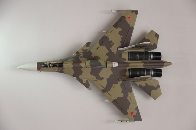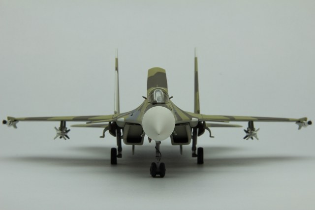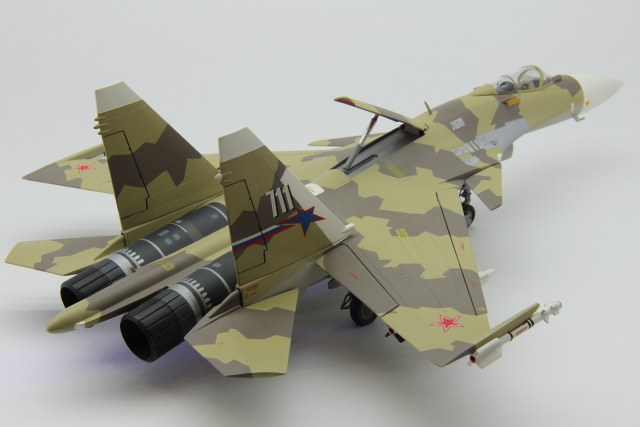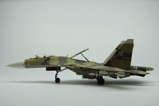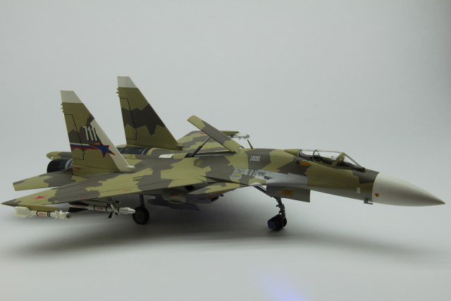 Доброго времени суток однокоропчане и братья по оружию!!! Хочу представить на ваш суд мою вторую модель Российского сверхманевренного истребителя четвёртого поколения Су-37 «Терминатор». Модель была собрана чуть меньше года назад тогда же и отснята. Покупалась данная модель в книжном магазине за 360 рублей, наверное, лет пять назад. Сразу хочу оговориться, что мой выбор на эту модель пал в первую очередь из-за его боевой окраски – уж очень она мне понравилась. К сожалению, при сборки вся радость и закончилась – данный кит широкой деталировкой не располагает да и качество оставляет желать лучшего. Но как говориться глаза боятся, а руки делают. Для данного кита был куплен тематический набор красок акан – цвета которого якобы воспроизведены с реальных фрагментов самолета, но как выяснилось позже, что-то цвета эти совсем уж и с не реальных фрагментов. Вместо желтоватого оттенка получился какой-то зелёный. Позже я даже в интернете видел набор этих тематических красок с таким зеленоватым оттенком. И тут спрашивается – где акан увидел на данном самолете хоть примерные такие цвета. Так, что по поводу не попадания в цвет прошу вас сильно на меня не ругаться. А самому подбирать цвет – не очень хотелось, да и опыта такого ещё нет. Кроме того, данный самолет в реальной жизни перекрашивался и на просторах интернета даже идут споры по поводу его окраски. Расшивка – внешняя, перерезать тоже не стал и так с этой моделью много намучился, да и результат я думаю оставлял бы желать лучшего. Грунтовка – tamiya. Из дополнительного – сделал ремни из тамиевского скотча, ручки катапультирования, дополнительные штанги ПВД, пушку из иглы, имитацию проводки, рассверлил ракеты нанес на них надписи для наибольшего реализма и вставил головки светодиодов, пришлось повозится и со штангой дозаправки в воздухе – не хотела вставать на место, улучшил стойки шасси, пачкал фейри + гуашь. В общем сборка проходила довольно долго и трудно. Приятного просмотра! С уважением, Kulma.