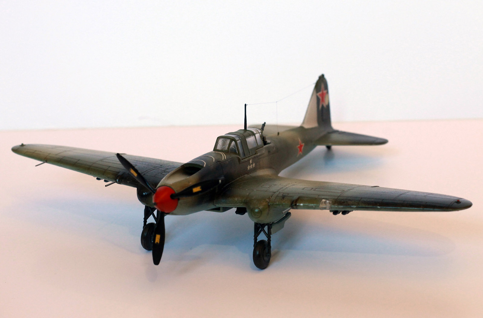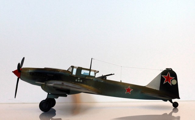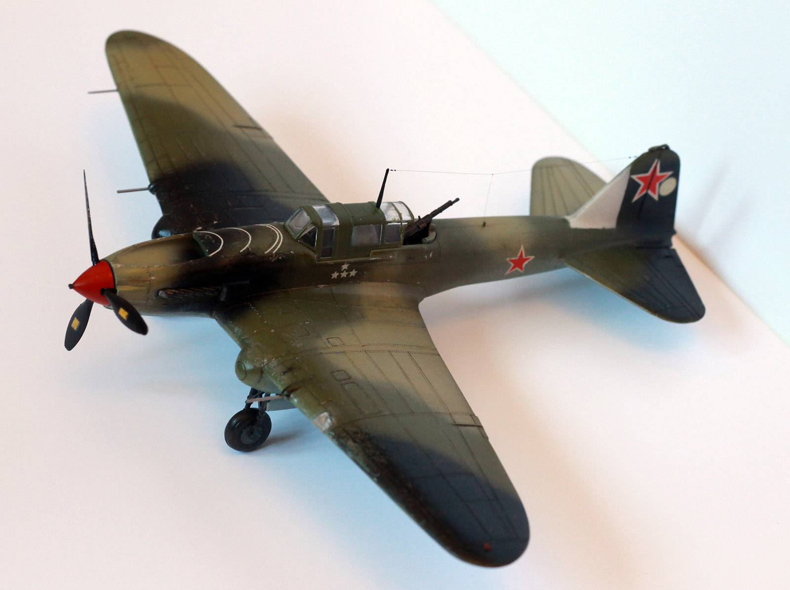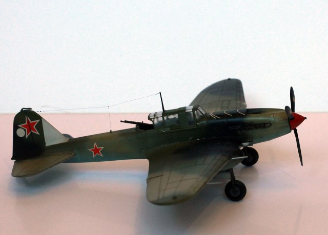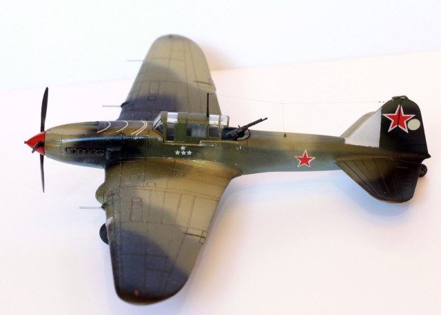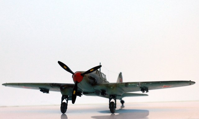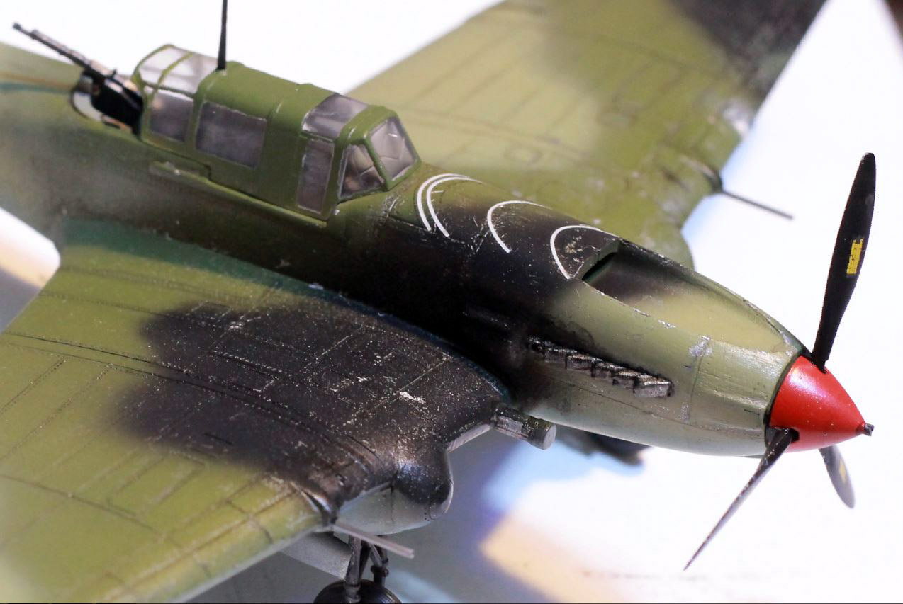 Расшивка крыльев, как я понял, Звезда дает неверное для своих вариантов раскраски, поэтому образ штурмовика собирательный. У меня металлические крылья и хвостовое оперение, не знаю существовала ли именно такая модификация двухместного штурмовика. Много читал, но так толком и не понял. Стойки передней шасси приподнял. Выхлопные патрубки рассверлены, перегородка в воздухозаборнике.