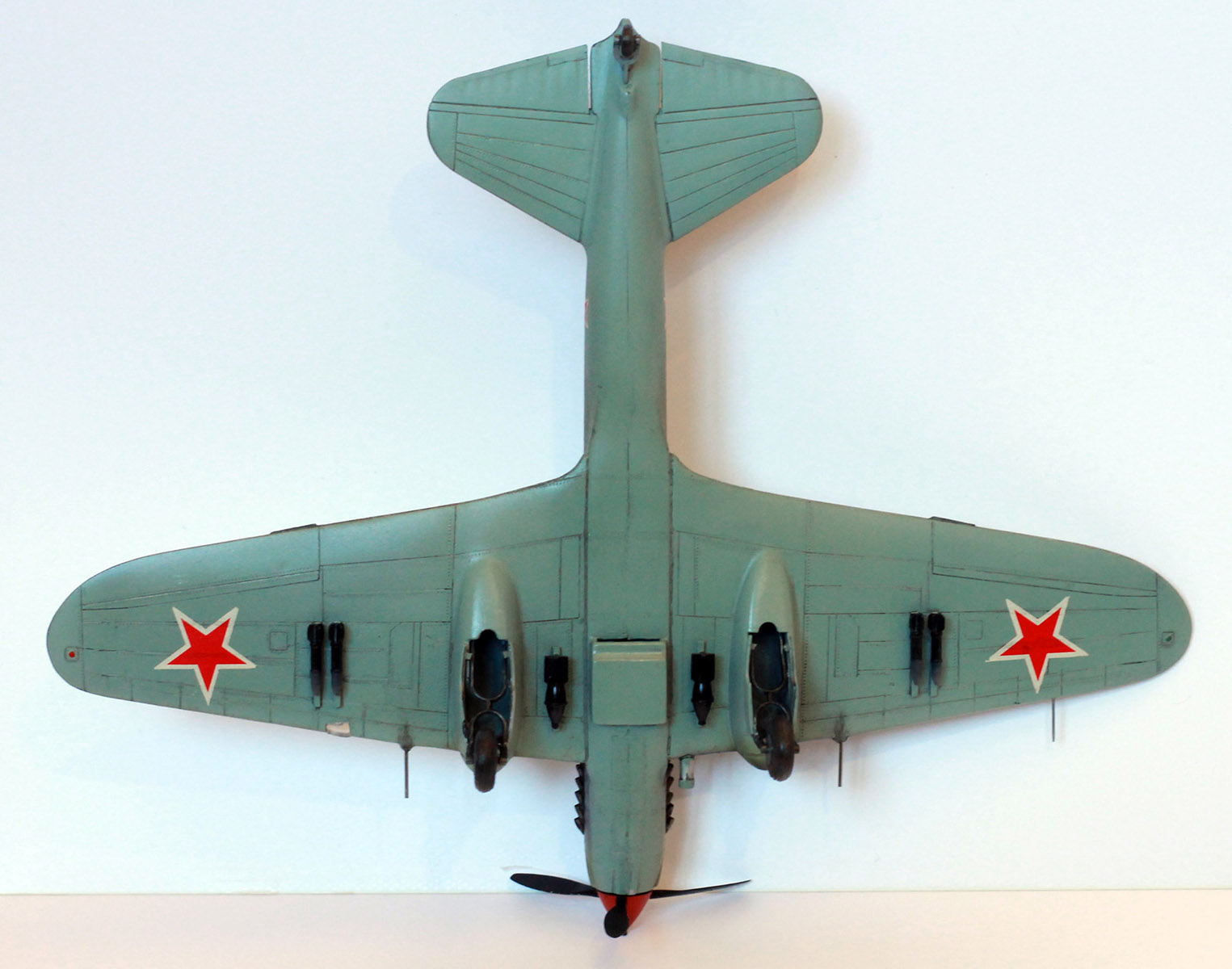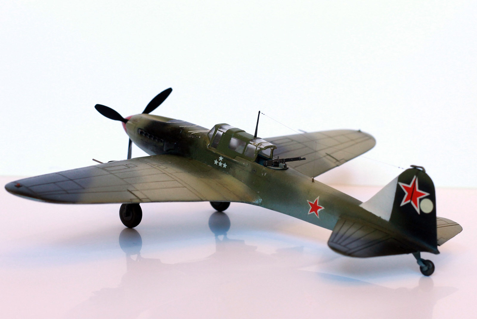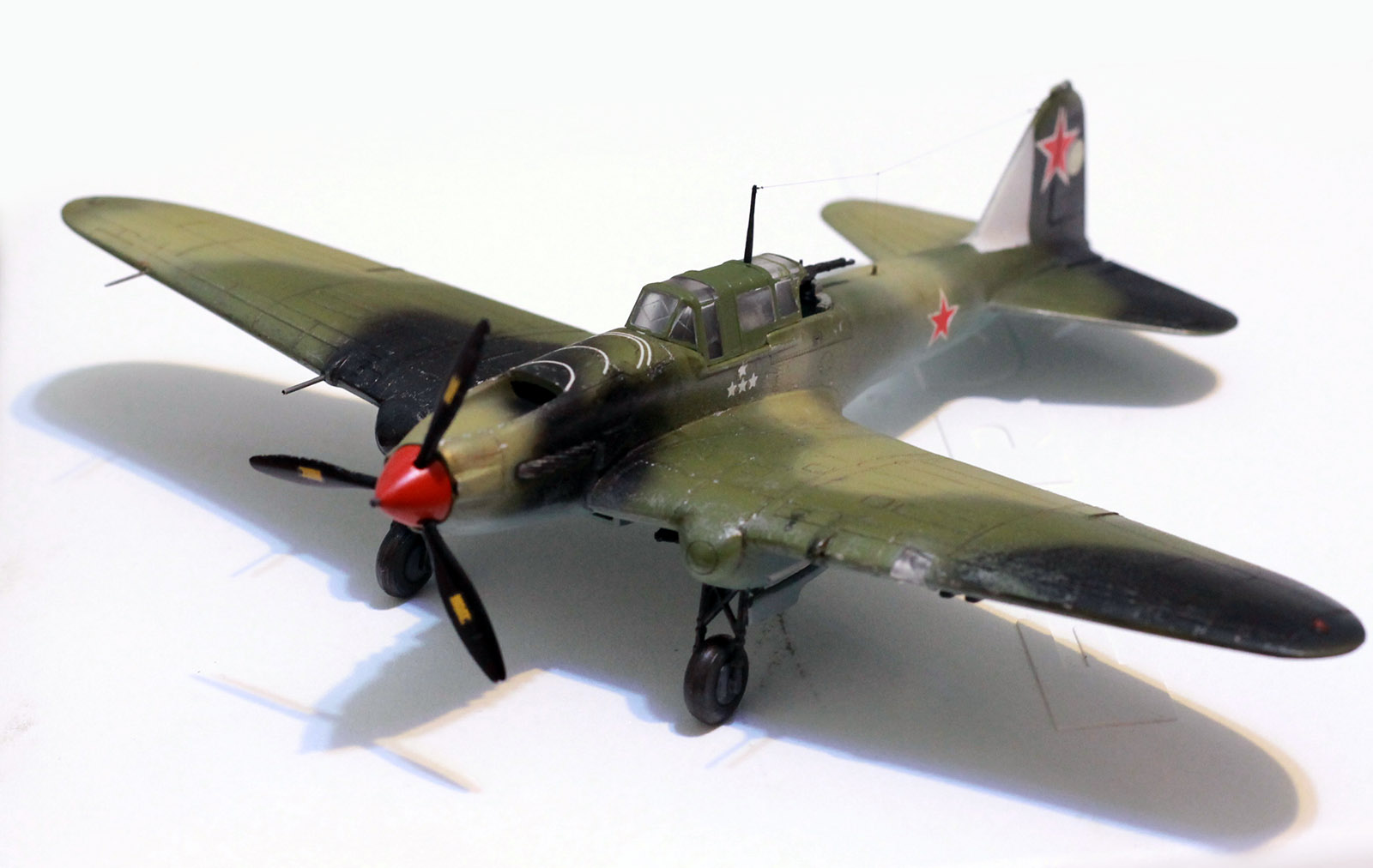 Расшивка крыльев, как я понял, Звезда дает неверное для своих вариантов раскраски, поэтому образ штурмовика собирательный. У меня металлические крылья и хвостовое оперение, не знаю существовала ли именно такая модификация двухместного штурмовика. Много читал, но так толком и не понял. Стойки передней шасси приподнял. Выхлопные патрубки рассверлены, перегородка в воздухозаборнике.