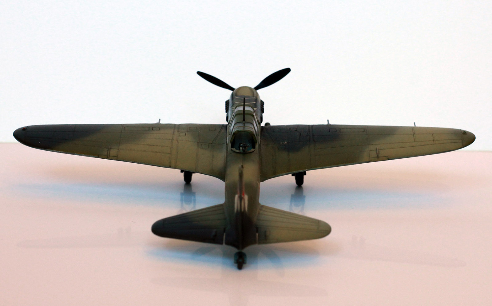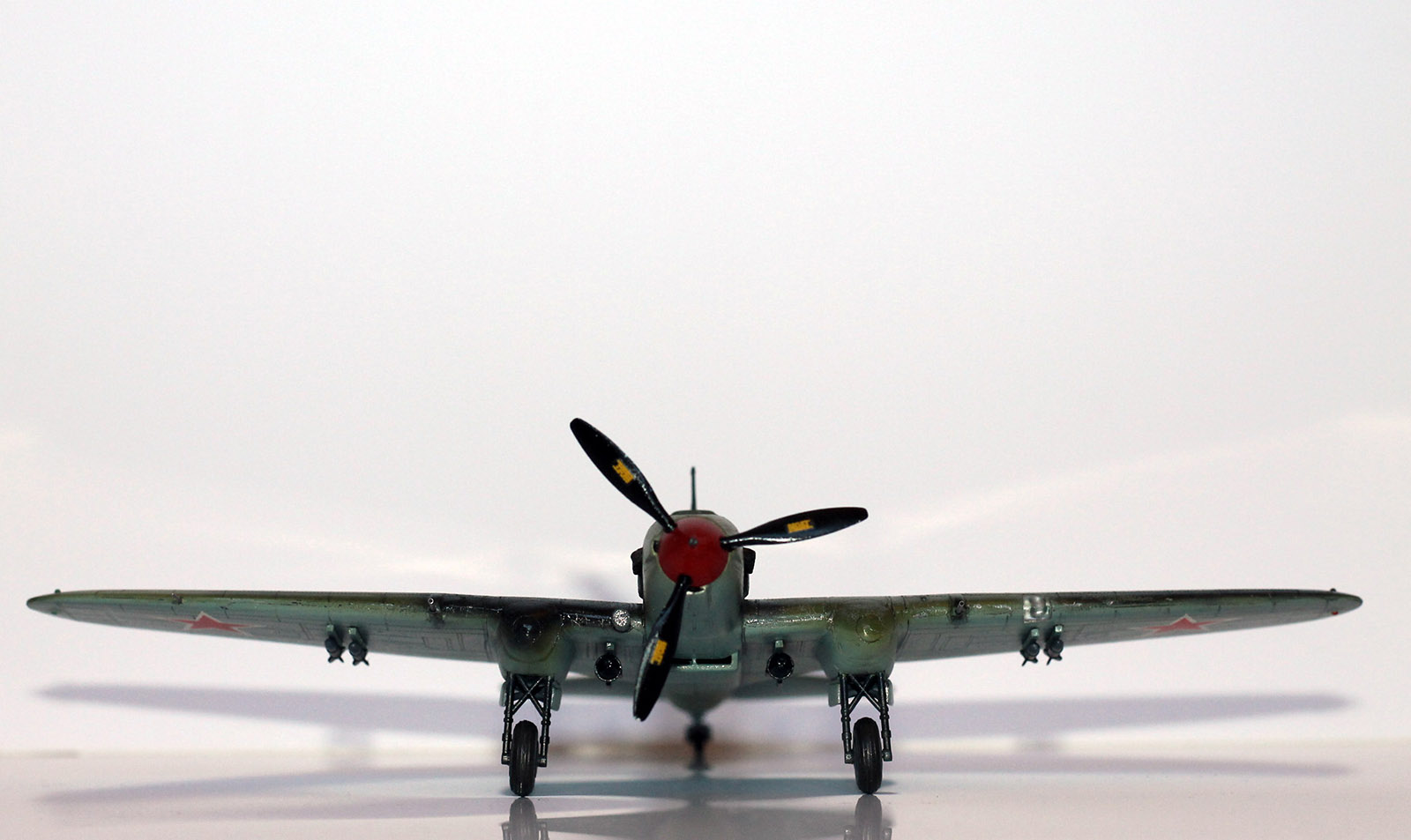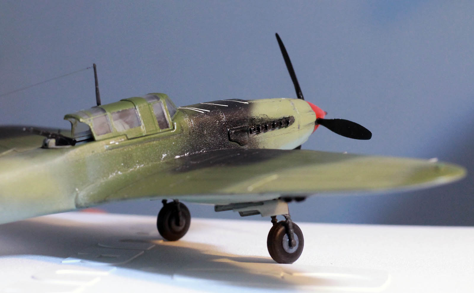 Из придиризмов--нет прицела на капоте( немного "изогнутая" палочка),место вхождения отвода антенны в корпус там белый керамический изолятор,нет солдатиков индикаторов выпуска шасси.В воздухозаборнике,по моему нужны створки--на капоте сверху. Нет бортовых.