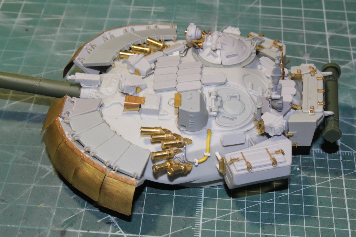 За основу взят набор Т-90А MENG (TS-006) и смоляной набор с фототравлением MiniArm (B35073), а также фототравление решетчатые экраны MiniArm (B35074) Правда в данном случае есть один не очень хороший момент вся смола и травлёнка от МиниАрма изготовлена под Звездовский Т-90, поэтому пришлось много подгонять и доделывать недостающие детали. Ещё добавил Тучи, Антенный ввод и антенна а также пару недостающих блоков ДЗ (MagicModels) , трос (Eureka-XXL)