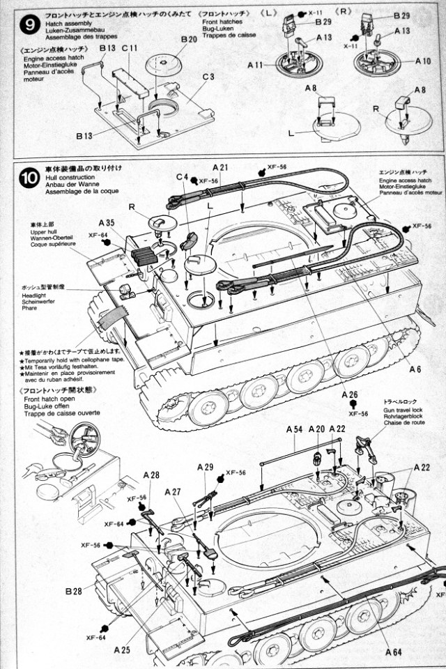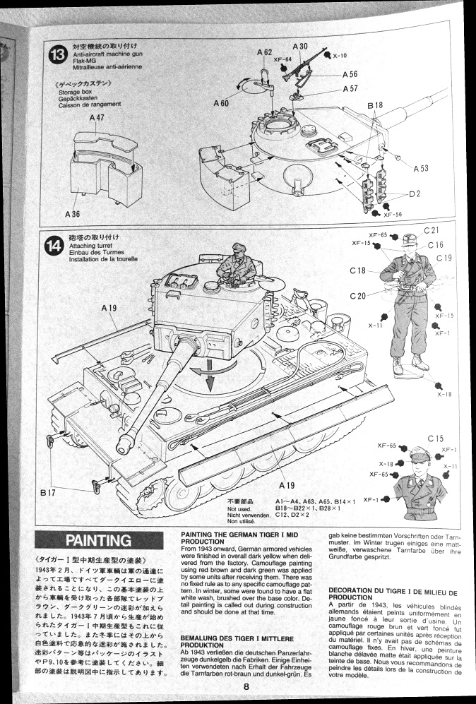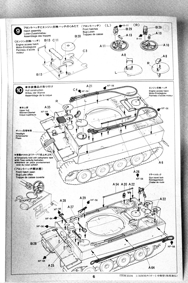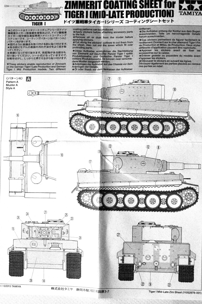 Коллеги, хочу представить обзор тигра от фирмы Tamiya номер по каталогу 35194 .Смотрим мы на картинку и видим тигра в циммерите! Но открывая сразу настоет разочарование ни какого циммерита нет ( его производитель предлагает купить отдельно. В коробке находится 6 литников песочного цвета, два с элементами ходовой, ствол на литниках как обычно из двух половинок, ванна корпуса идет отдельно , четыре литника черного цвета с наборными траками (но траки не очень.. да и толкатели на каждом траке) , декаль, инструкцию. Что касается соответствия модели заявленному образцу, сказать пока ничего не могу, тк Тиграми пока плотно не интересовался. Качество литников "Тамиевское" , те ни облоя ни утяжин при первом осмотре не обнаружил, следы от пресс форм кое где встречаются, но незначительны. На литниках стоит -1989г,те модель не новая ,но и не совсем древняя. Огорчило отсутствие травленых сеток, хотя могли бы уже и укомплектовать (пришлось брать отдельно). На литниках присутствует фигурка танкиста, с двумя вариантами голов не плохого качества. Инструкция довольно подробная. Предлагается собрать один из двух вариантов танка 501, 502 батальона. Что касается травленых сеток и циммерита то это дело на любителя… циммерит очень тонкий и рельеф почти не заметный да и на сколько это все будет держаться на модели не известно т.к он наклеивается как обычный стикер.