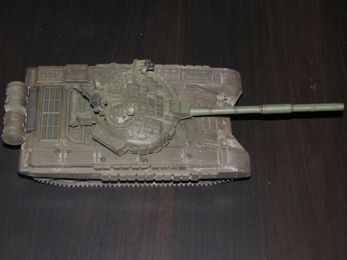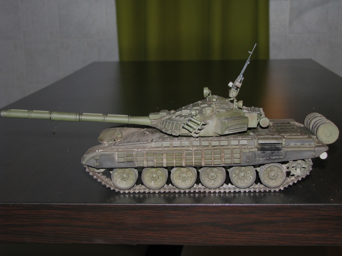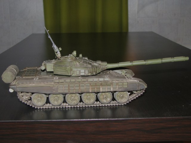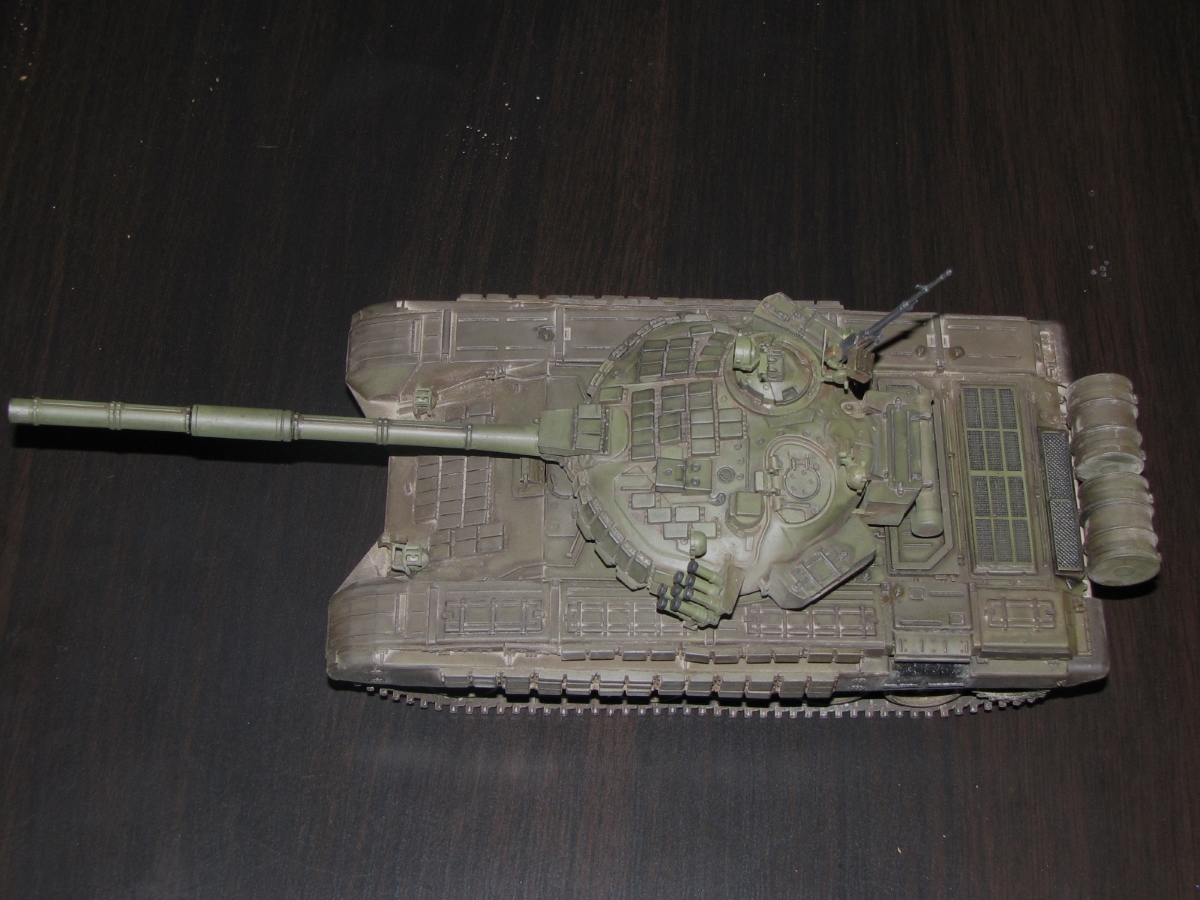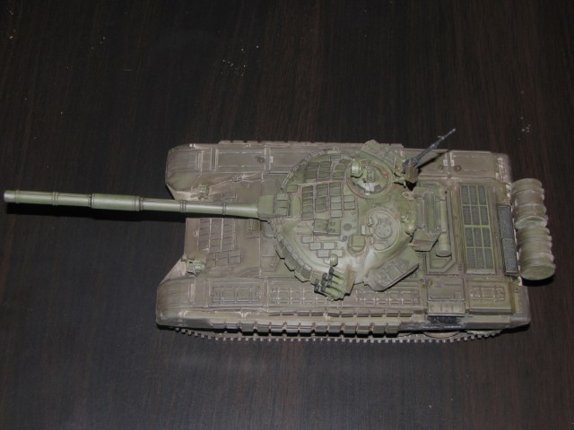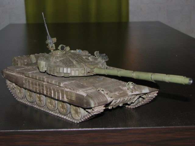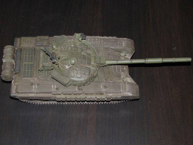 Вобщем, данная модель достаточно долго лежала на полке, и должна была превратиться по средством смоляного набора от SP-Disign в ТОС-1 "Буратино". Но, руки не доходили, а по прошествии некоторого времени была куплена модель ТОС-1А "Солнцепек" от Trumpeter. Решил я просто собрать башню, ну в любом случае она ни на Буратино ни на Солнцепек не подходит. Вощем, да, вот таким образом, начиная с башни, был собран Т-72 полностью. (Тос-1 решил вообще не собирать). Единственное что поменял - траки. (тоже были куплены на Буратино, но такие траки только на Т-72, а на всех остальных агрегатах уже как на Т-80, так что, либо на данную модель, либо вообще на полку до непонятного момента). Окрашивал краской ганз. Номер краски не помню, просто вроде цвет неплохой. (Сам я с цветослабостью на зеленый, поэтому на счет попадания в нужный или хотя бы похожий цвет, сильно сомневаюсь.
