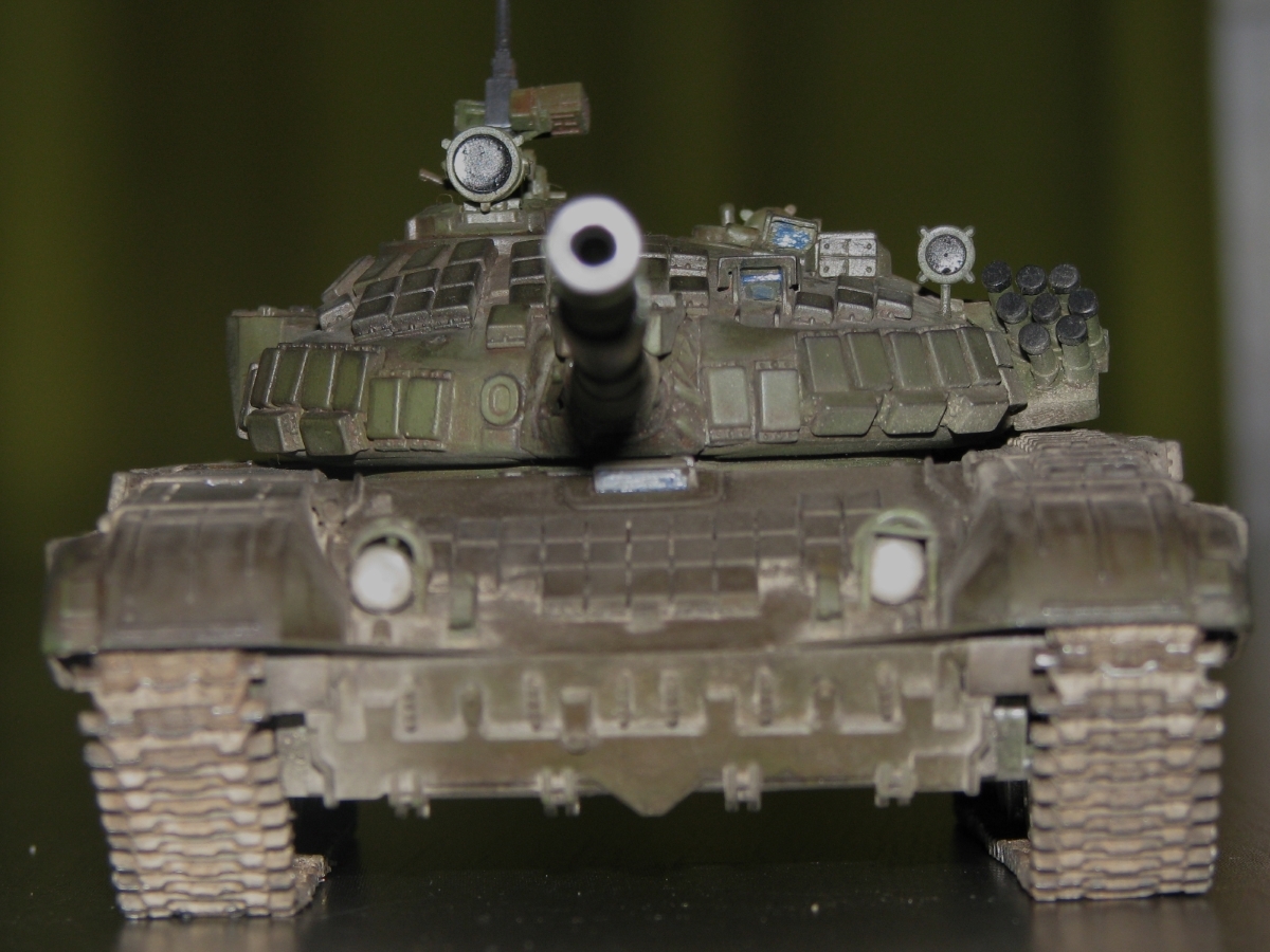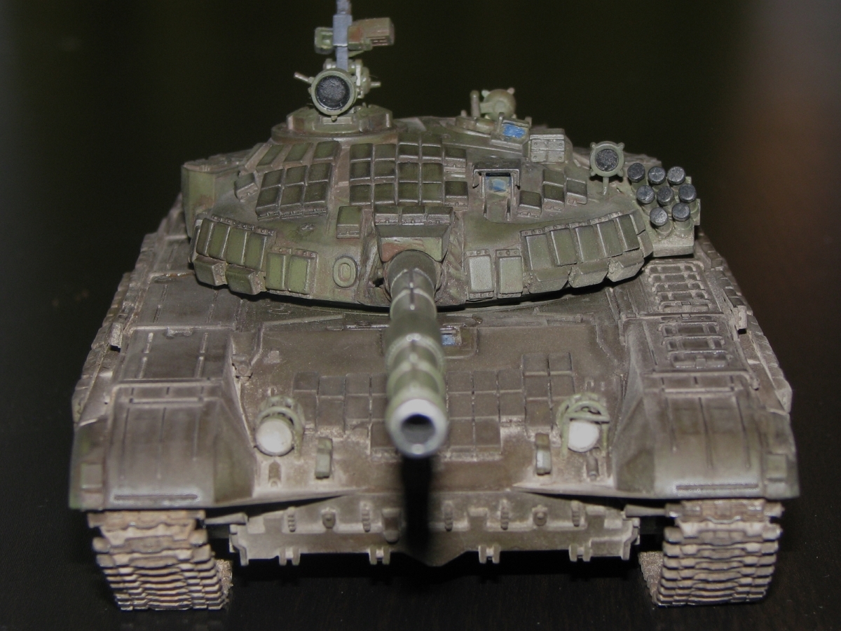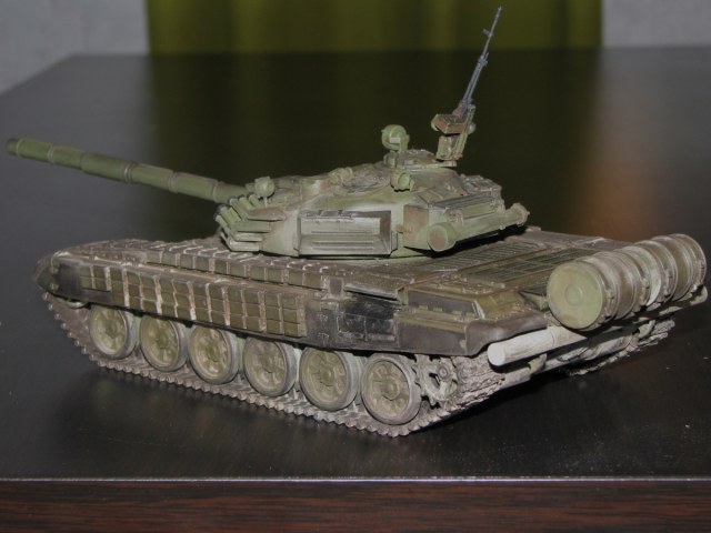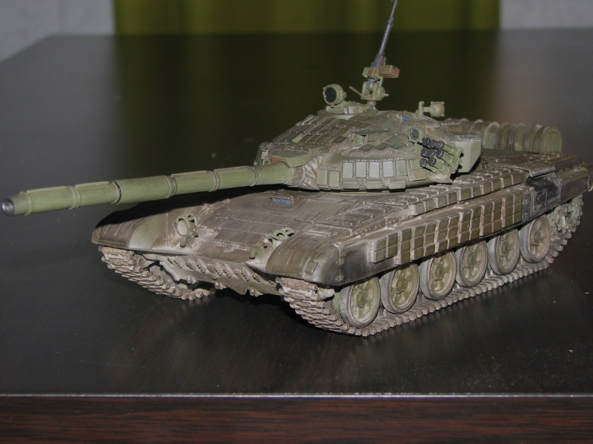 Вобщем, данная модель достаточно долго лежала на полке, и должна была превратиться по средством смоляного набора от SP-Disign в ТОС-1 "Буратино". Но, руки не доходили, а по прошествии некоторого времени была куплена модель ТОС-1А "Солнцепек" от Trumpeter. Решил я просто собрать башню, ну в любом случае она ни на Буратино ни на Солнцепек не подходит. Вощем, да, вот таким образом, начиная с башни, был собран Т-72 полностью. (Тос-1 решил вообще не собирать). Единственное что поменял - траки. (тоже были куплены на Буратино, но такие траки только на Т-72, а на всех остальных агрегатах уже как на Т-80, так что, либо на данную модель, либо вообще на полку до непонятного момента). Окрашивал краской ганз. Номер краски не помню, просто вроде цвет неплохой. (Сам я с цветослабостью на зеленый, поэтому на счет попадания в нужный или хотя бы похожий цвет, сильно сомневаюсь.