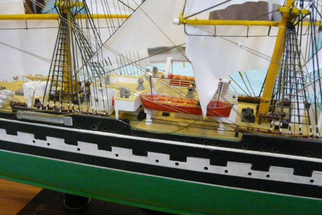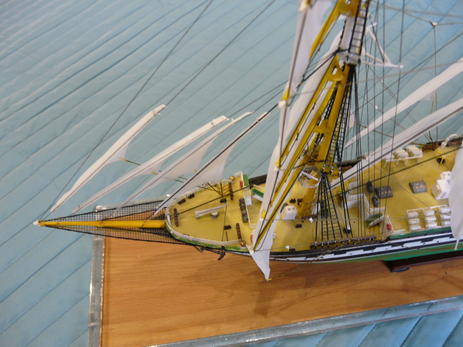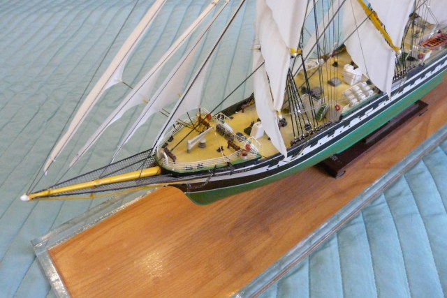 В остальном по-моему, очень и очень даже хорошо.... форма парусов, флаги, ванты, леера и перты, сетка на бушприте, антенны, да вообще деталировка по-моему на весьма хорошем уровне для такого масштаба и с учётом исходного набора.... И не смотря на все придирки, корабль притягивает внимание и живо смотрится....