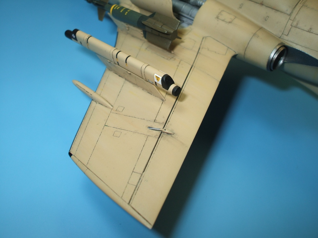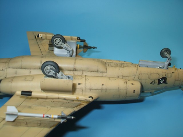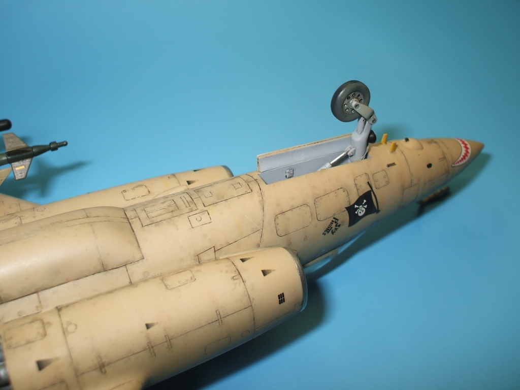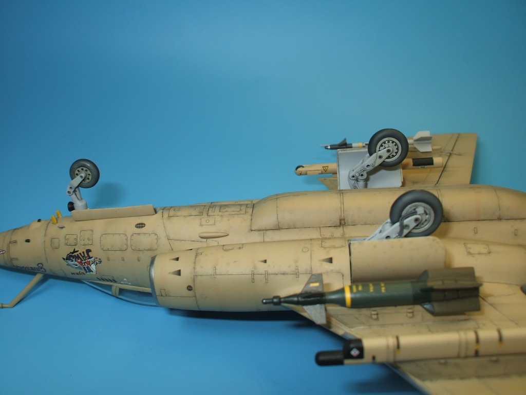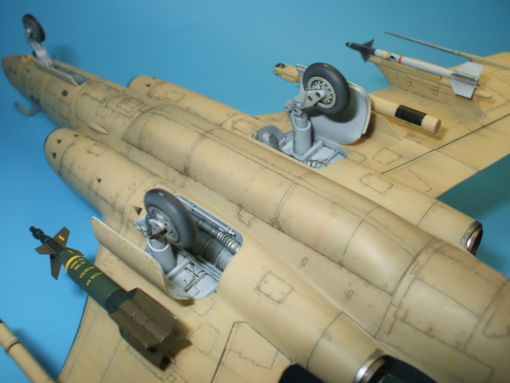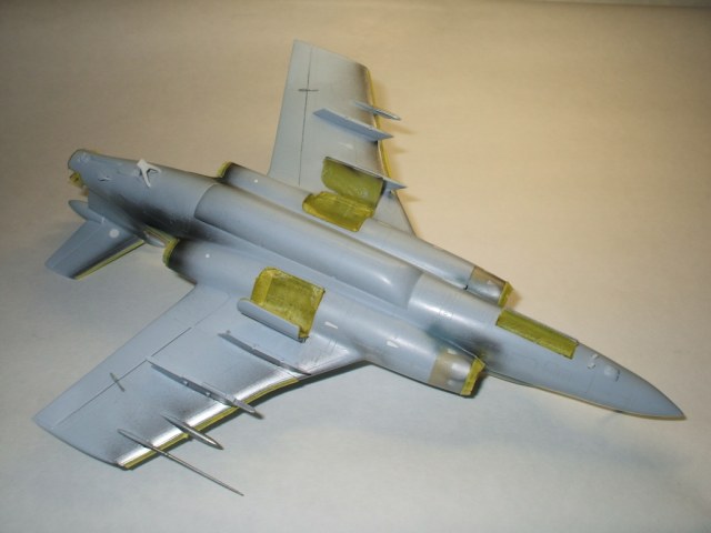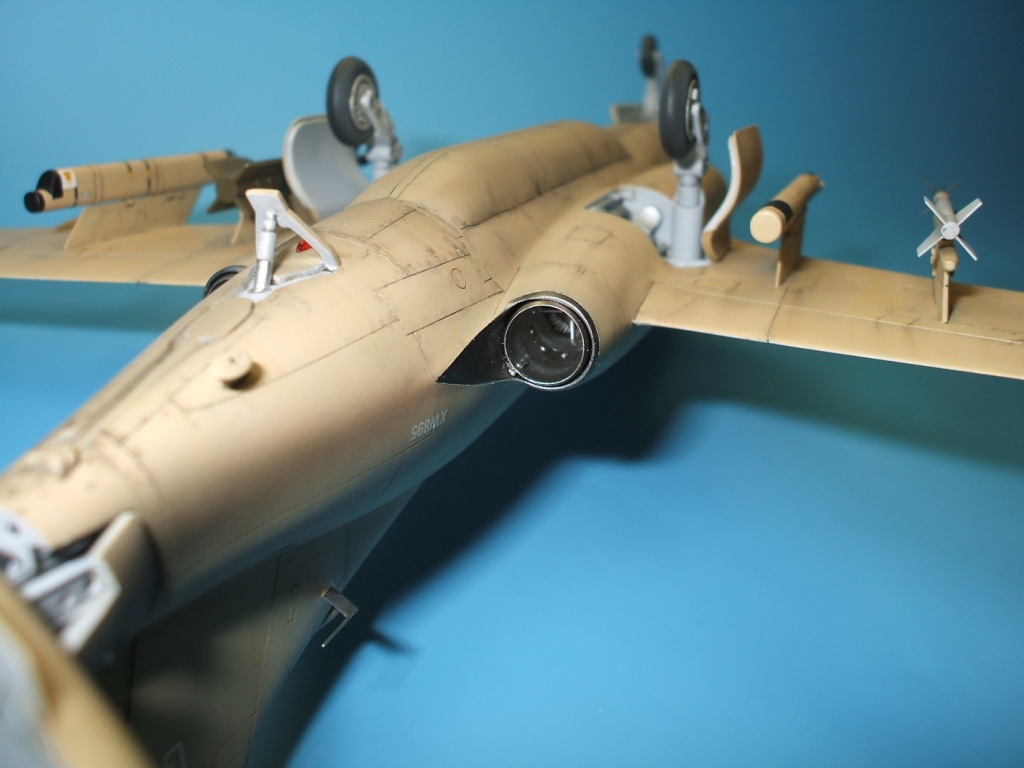 По окраске все как всегда: использованы краски и лаки GS, и серебро от Alclad (передние кромки)прешейдинг, покраска металиком передних кромок, маски на них, основной цвет, футура, декали(отменное качество), футура, смывка, матовый лак, масляные точки, смывка выборочно, матовый лак, нанесение самодельных декалей изображающих небольшие воздухозаборники трех размеров, и всякого рода зарешеченные отверстия и туннели, а так же щель за фонарем для направляющей.