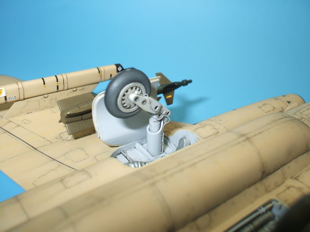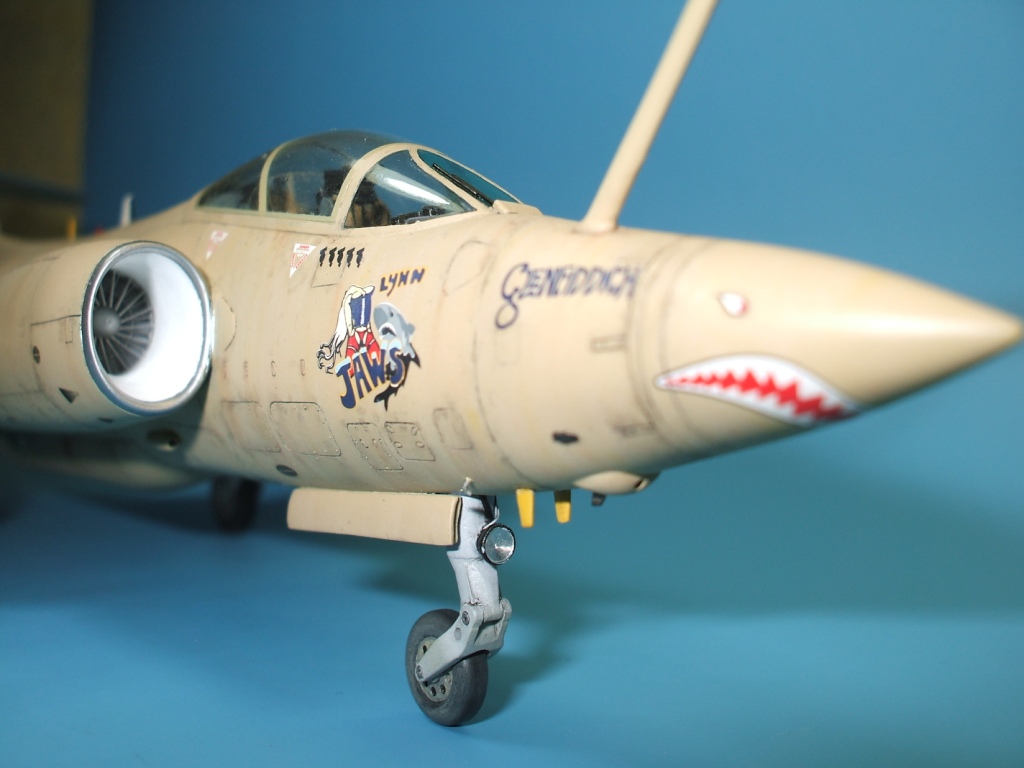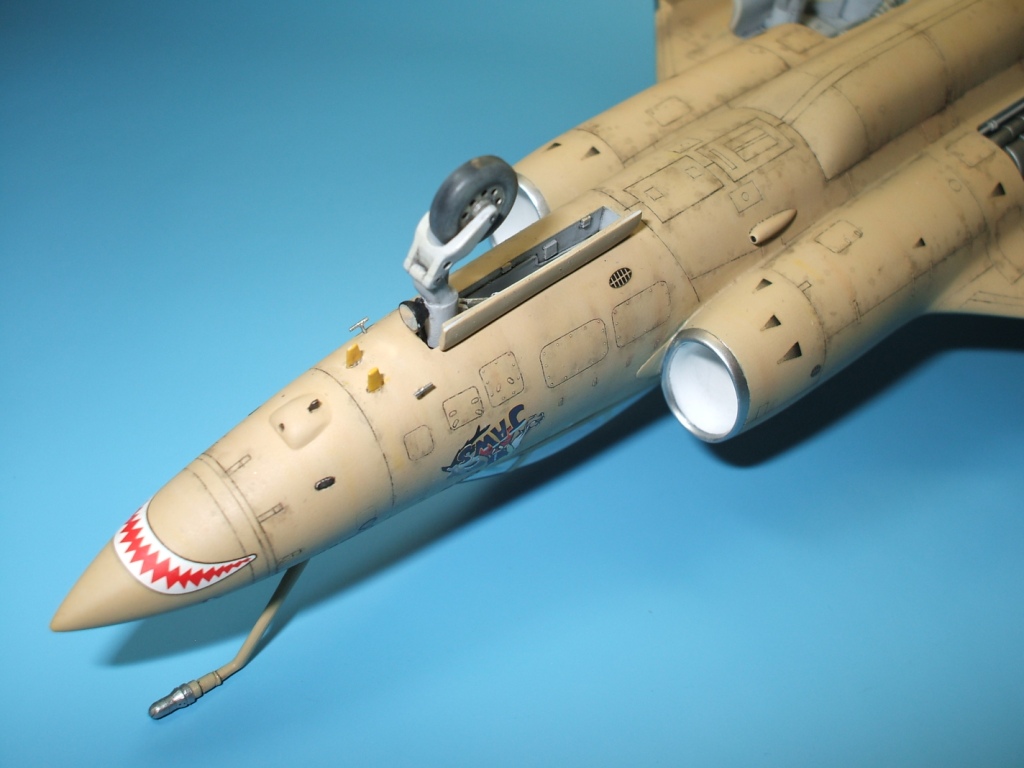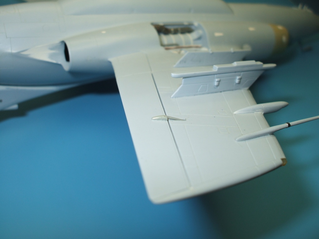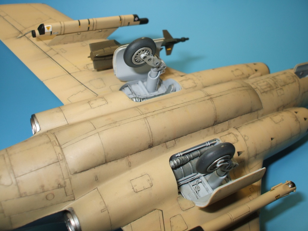 По окраске все как всегда: использованы краски и лаки GS, и серебро от Alclad (передние кромки)прешейдинг, покраска металиком передних кромок, маски на них, основной цвет, футура, декали(отменное качество), футура, смывка, матовый лак, масляные точки, смывка выборочно, матовый лак, нанесение самодельных декалей изображающих небольшие воздухозаборники трех размеров, и всякого рода зарешеченные отверстия и туннели, а так же щель за фонарем для направляющей.