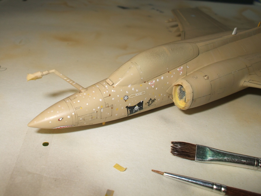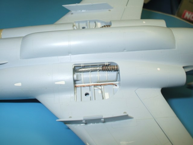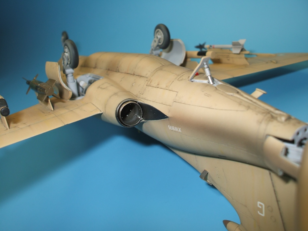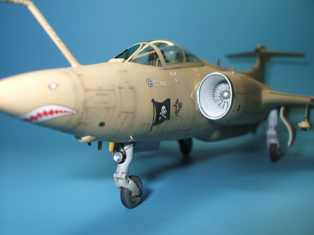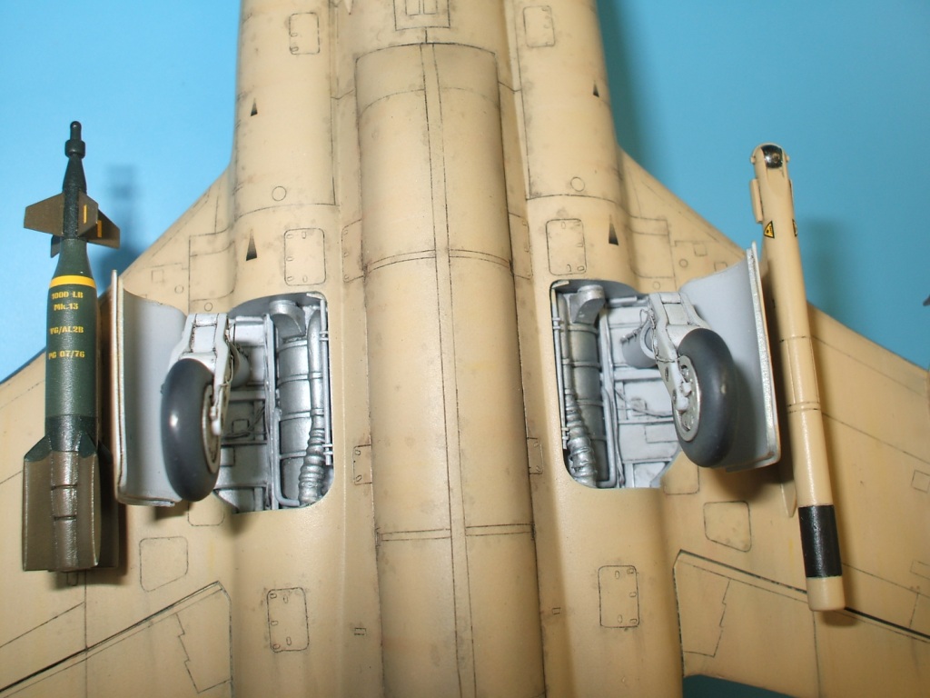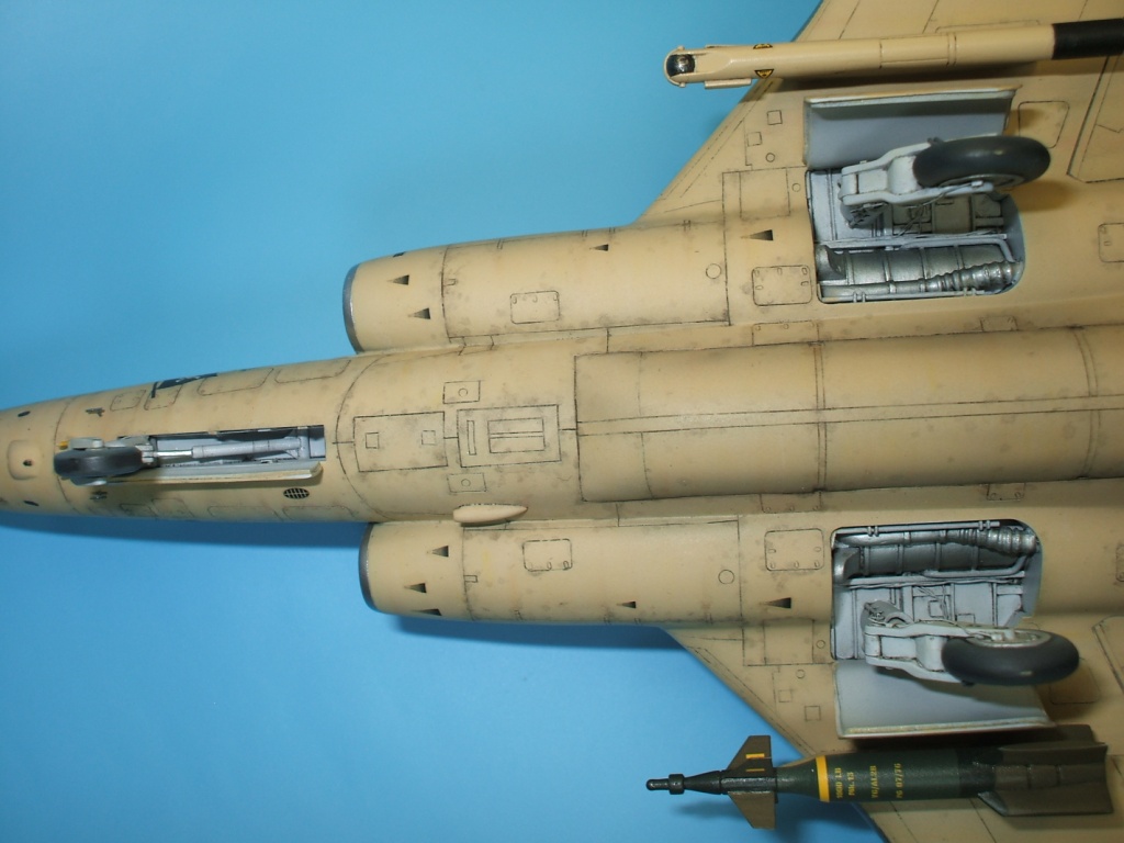 По окраске все как всегда: использованы краски и лаки GS, и серебро от Alclad (передние кромки)прешейдинг, покраска металиком передних кромок, маски на них, основной цвет, футура, декали(отменное качество), футура, смывка, матовый лак, масляные точки, смывка выборочно, матовый лак, нанесение самодельных декалей изображающих небольшие воздухозаборники трех размеров, и всякого рода зарешеченные отверстия и туннели, а так же щель за фонарем для направляющей.