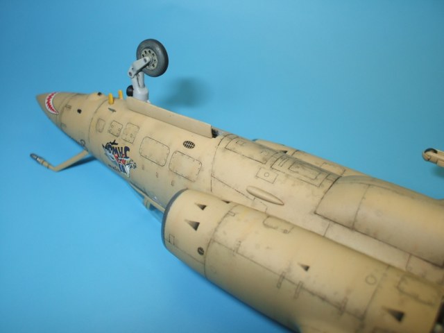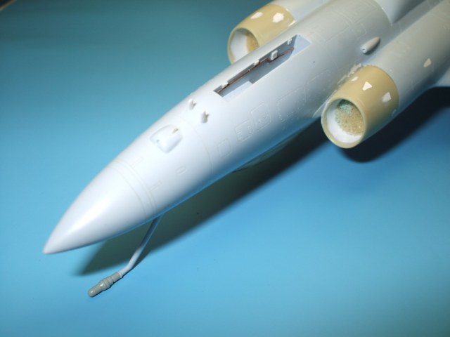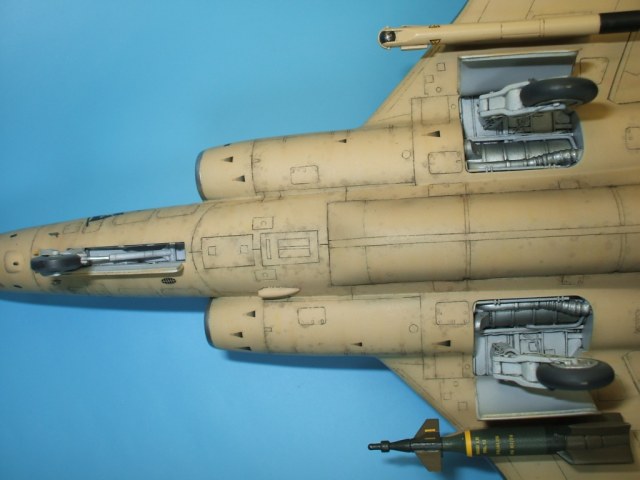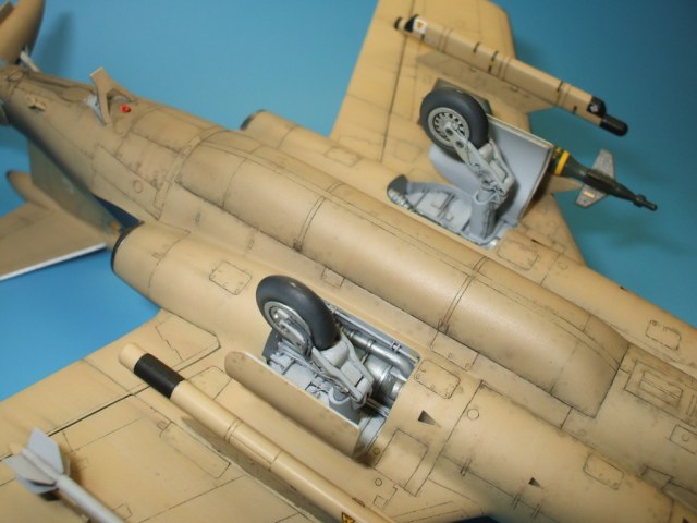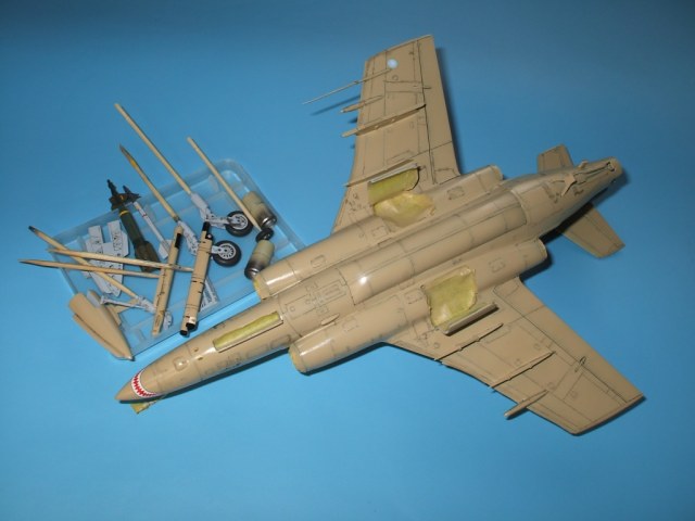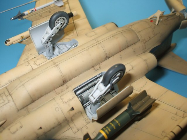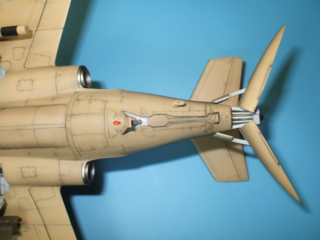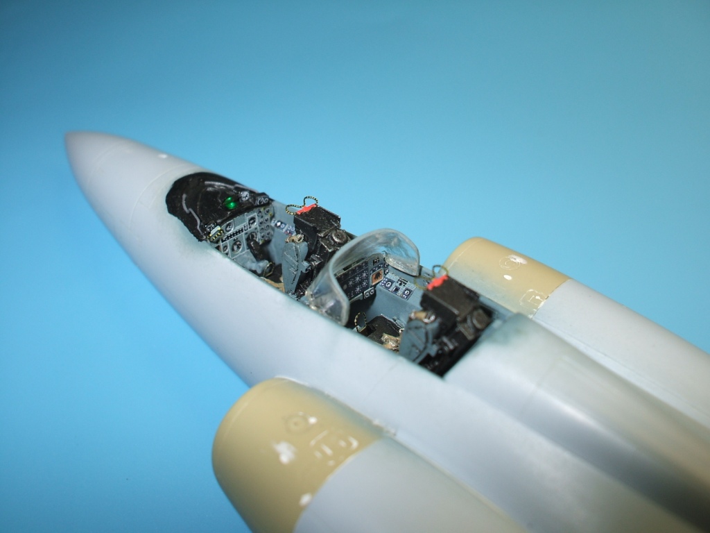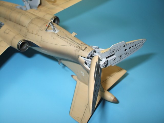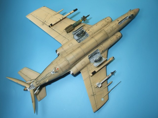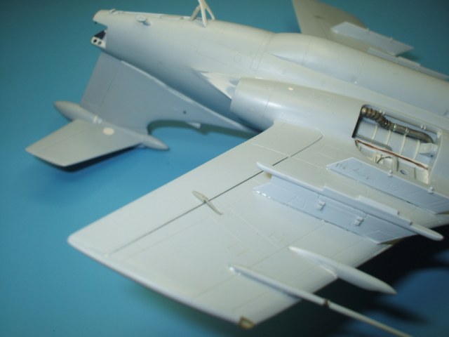 По замыслу заказчика «вгонять» в чертежи модель не планировалось, но уделить внимание некоторым узлам самолета было просто необходимо. Для этого заказчиком был предоставлен кое какой афтемаркет, а именно – смоляные кресла(производитель неизвестен), воздухозаборники двигателей со входными аппаратами и сопла двигателей от НеОмеги, цветная травленка от Eduardдля интерьера кабины и травленка от AirWavesиз которой использовались лишь детали для воздушного тормоза. Очень жаль, что не оказалось в продаже НеОмеговских ниш шасси и кабины, а также колес … Пришлось все эти моменты дорабатывать или изготавливать заново. Заново так же сделан фонарь кабины, за основу взят фонарь от Frog-овской модели так как он намного точнее. Большие доработки коснулись ниш шасси, стоек и колес, передних кромок крыла и воздушного тормоза, ракетно-бомбового вооружения. В принципе, я могу сказать, что на модели нет детали которая не подверглась бы доработке или замене. Писать подробно обо всех проведенных доработках не буду, да наверняка и упущу половину, лучше выложу больше фотографий сделанных в процессе работы и фото готовой модели в разных ракурсах и при разном освещении.